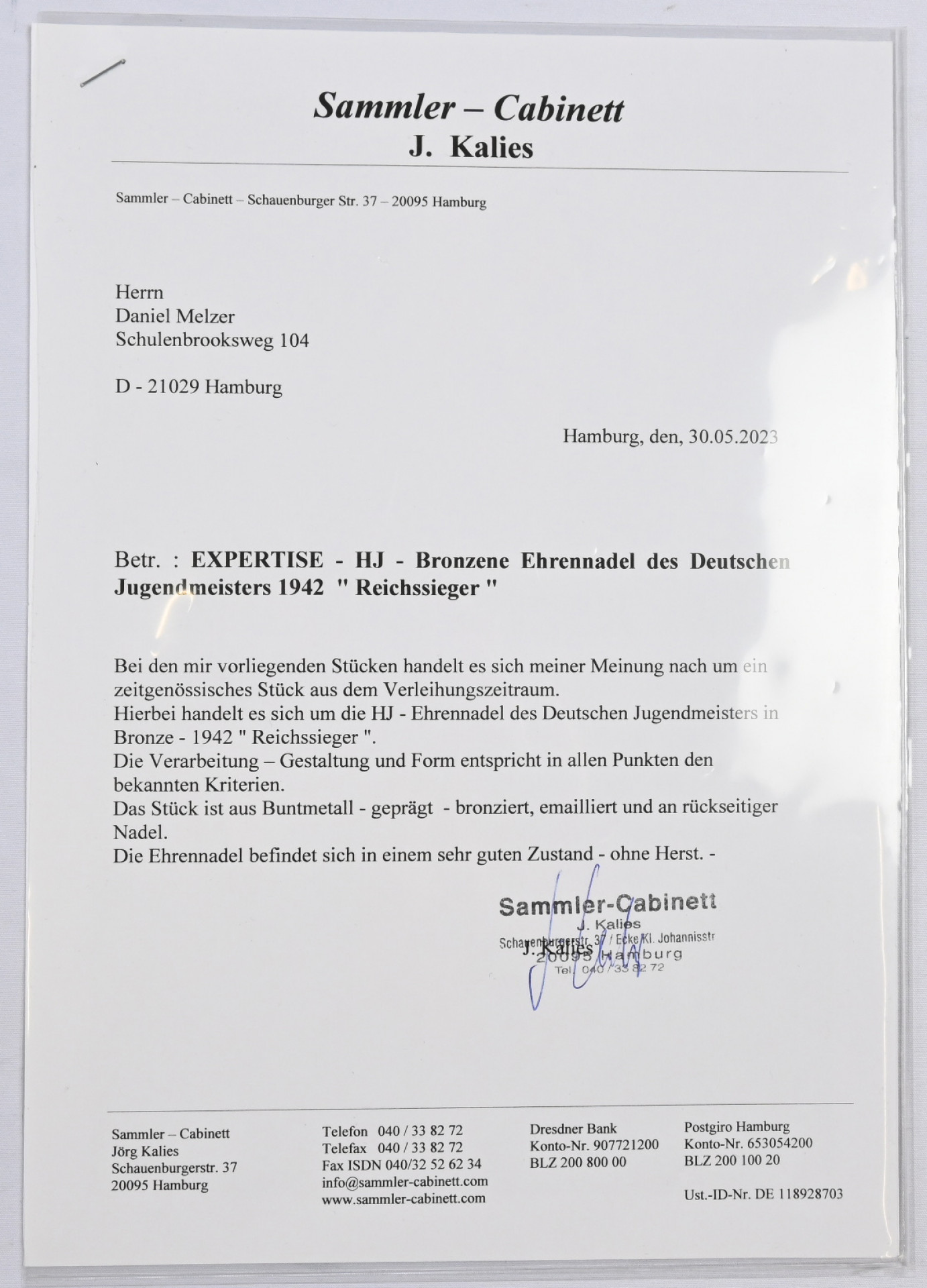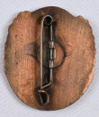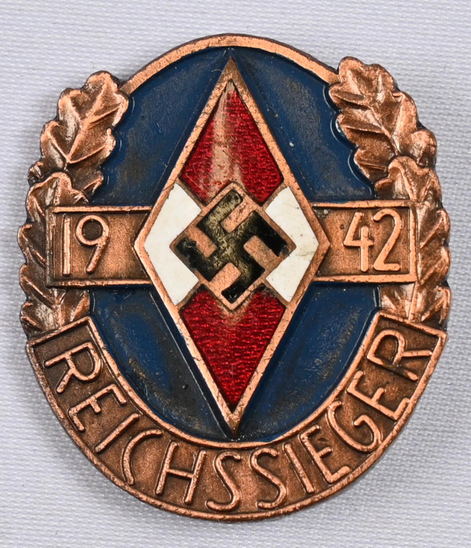 Saksan Hitler-Jugendin mestaruusmerkki pronssisella kunnianeulalla (Reichssiegerabzeichen 1942). Osin emaloitua pronssattua värimetallia. Nimmergut 3644/8. Erittäin hyväkuntoinen. Aitoutus Kalies (2023) .