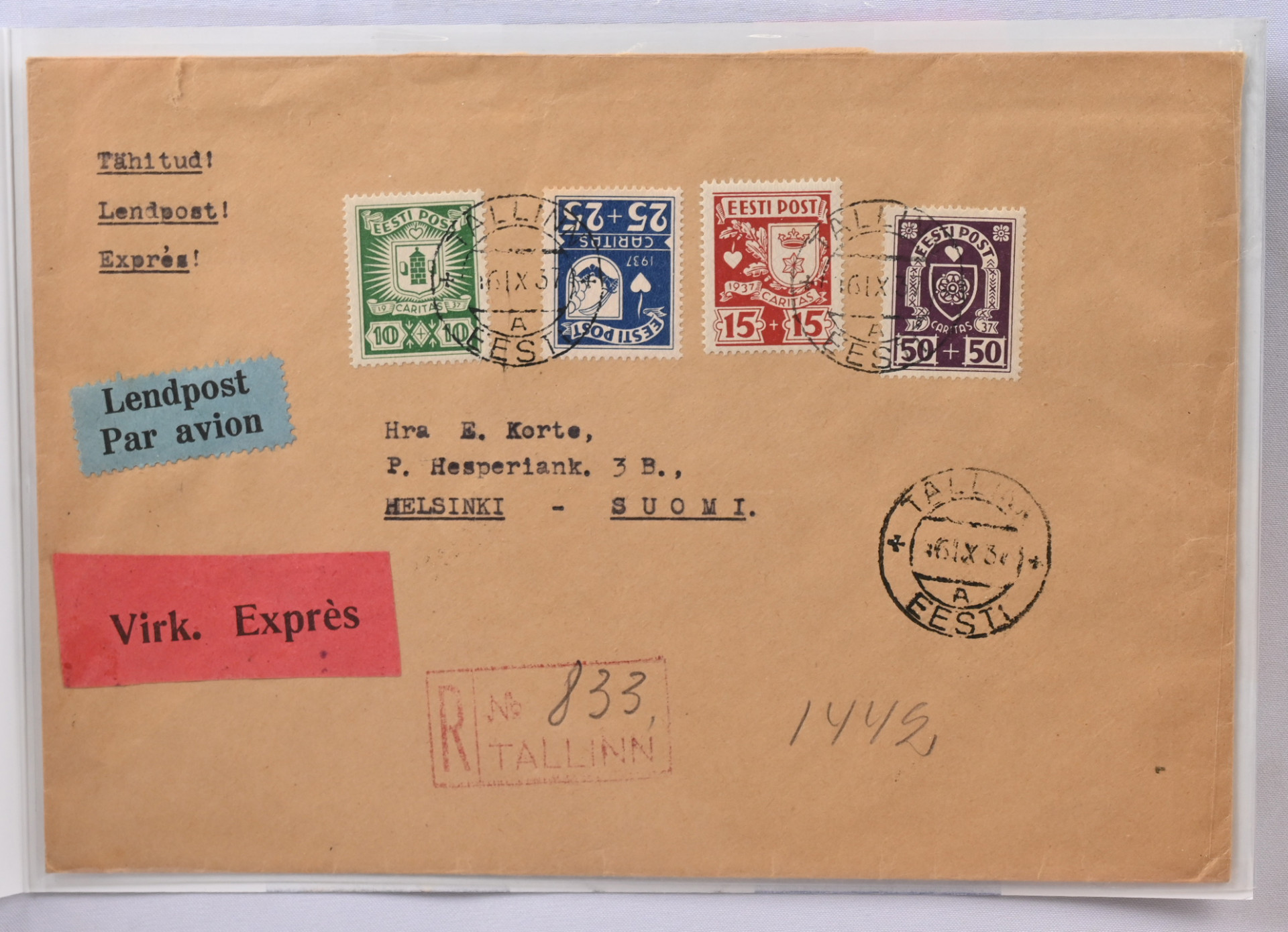 1937 Kirjattu pikakirje 16.IX.37 Tallinnasta Helsinkiin, saapumisleima Helsinki AVION 16.IX.37. Frankeerattu vuoden 1937 koko Caritas-sarjalla Mi 127-130
