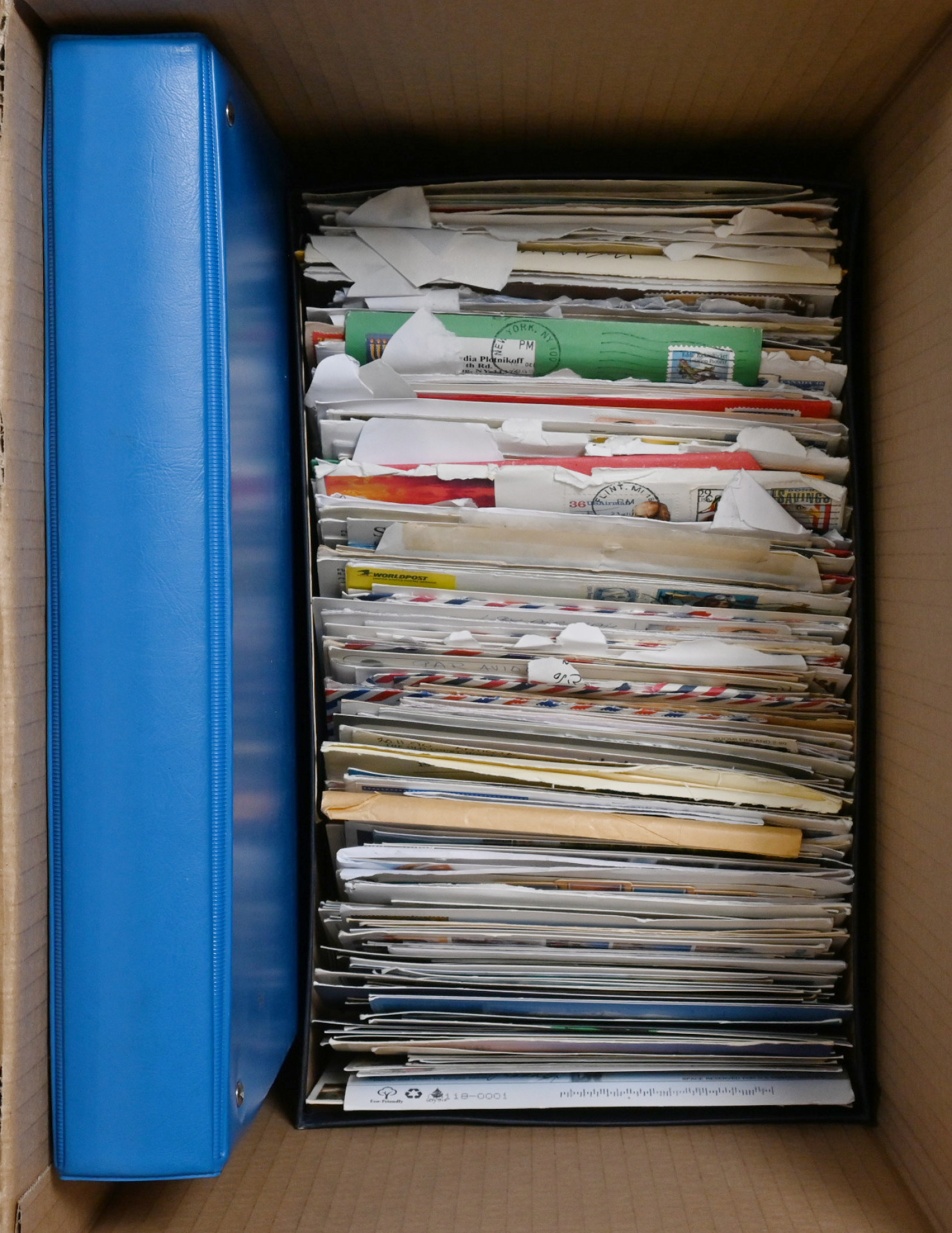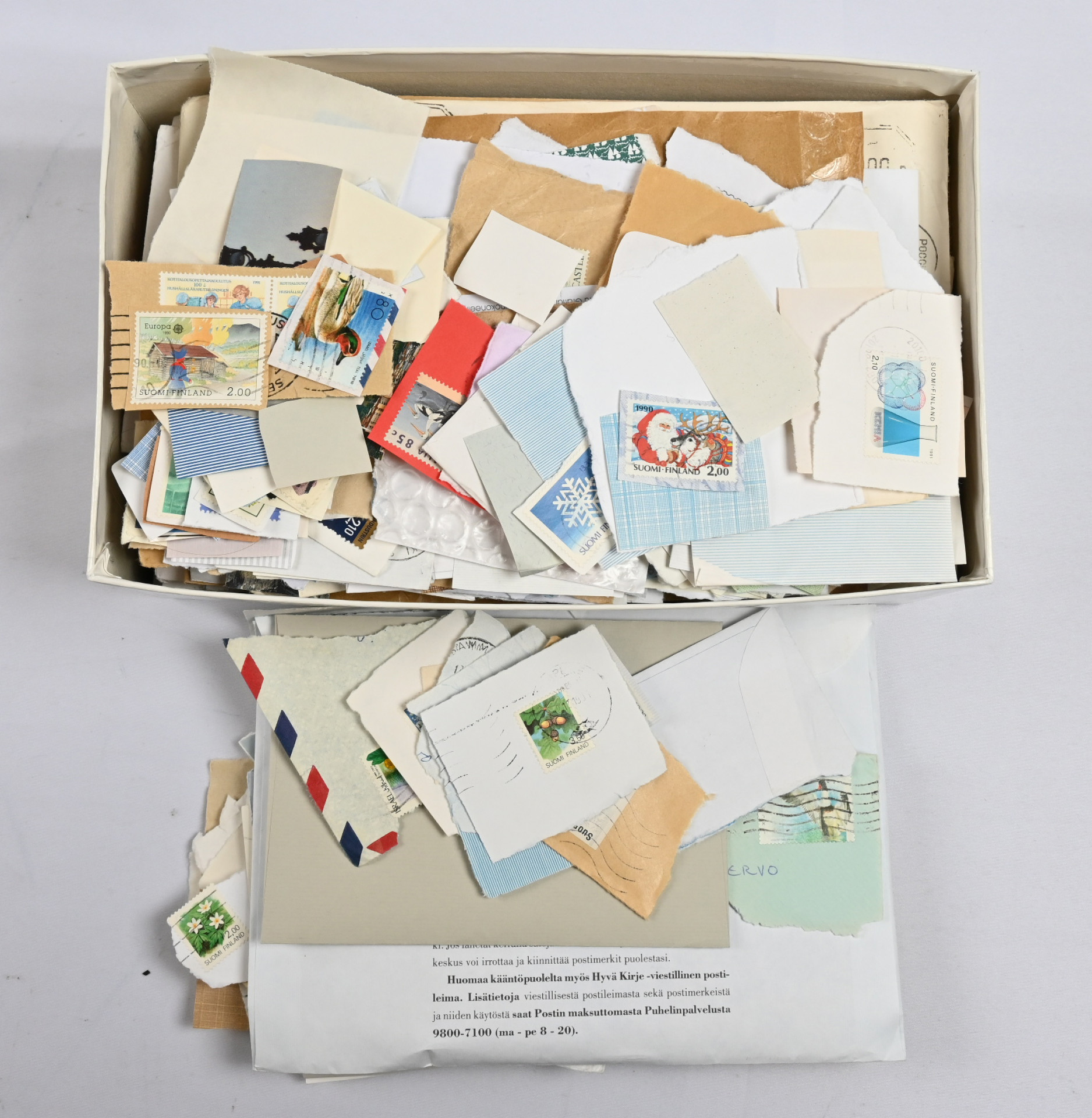 Sekalainen materiaali kahdessa laatikossa yli 13 KG: postilähetyksiä kahdessa kenkälaatikossa, hiukan leikettä sekä pestyä massaa, koulupoikakansioissa koko maailma -merkkejä, pieni Suomi-kokoelman alku, ulkomaiden värikkäitä merkkejä sekä FDC ym. kuoria kuorikansiossa, pieni kiintoisa nippu vanhoja ulkomaisia lähetyksiä jne. jne. Tekemistä ja lajittelemista pitkäksi aikaa