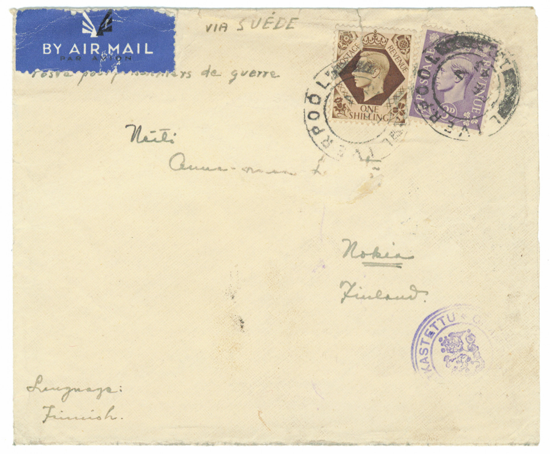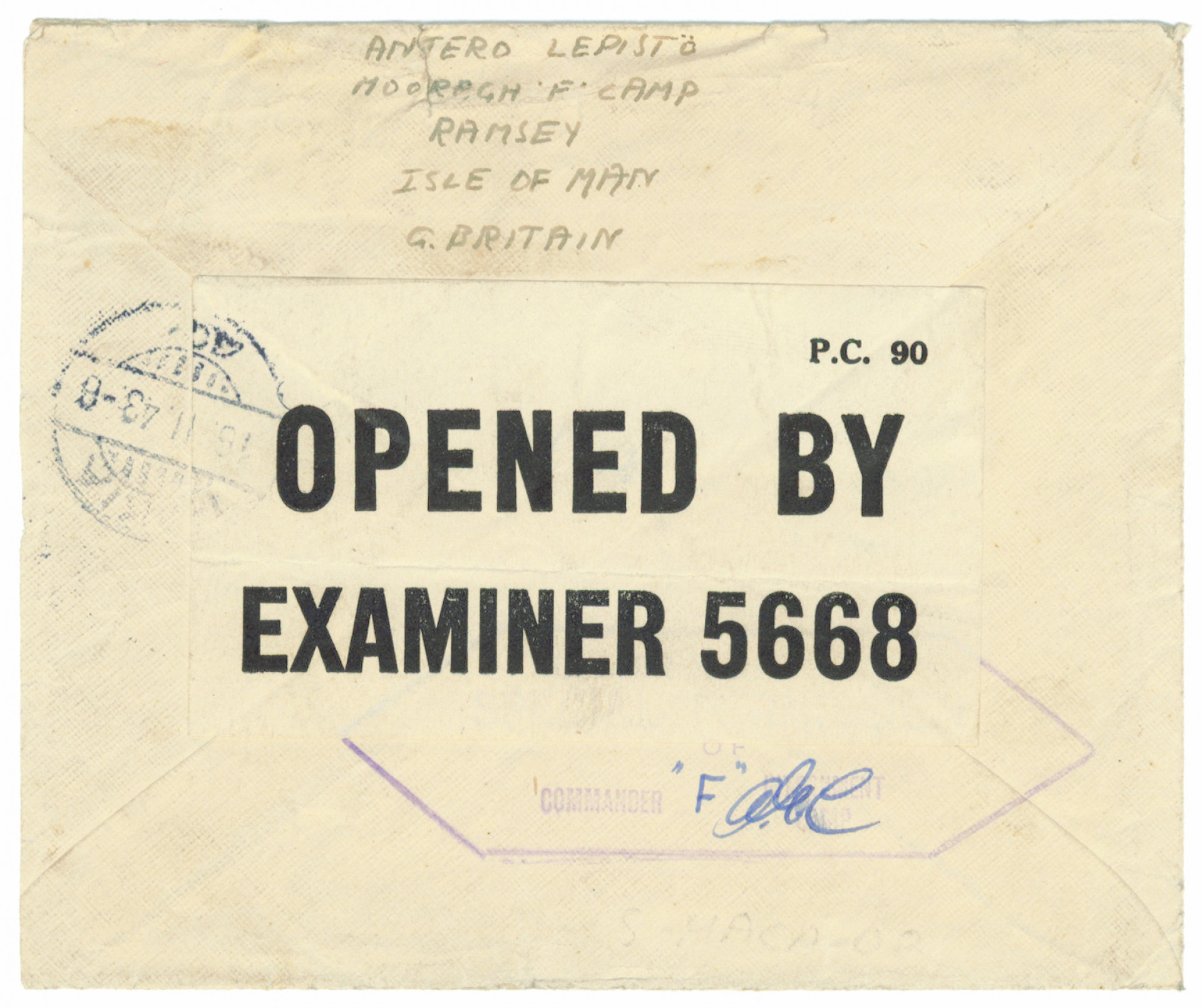 Suomalaiselta merimieheltä internointileiriltä Man Saarilta sensuroitu kirje Sveitsin kautta Suomeen 15.2.1943. Asiaan kuuluvaa ajan patinaa. Mielenkiintoinen!