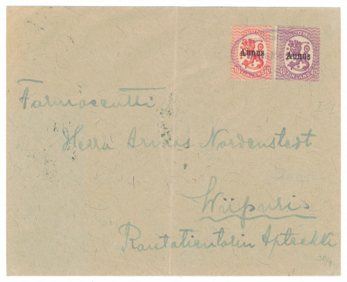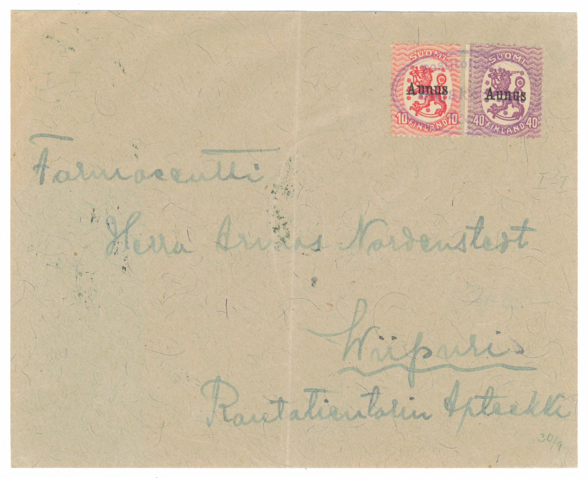 Postitoimisto Rajakontu ovaalileima kuorella 10 penniä ja 40 penniä merkkien kera Viipuriin, tuloleima. Kuoressa taite