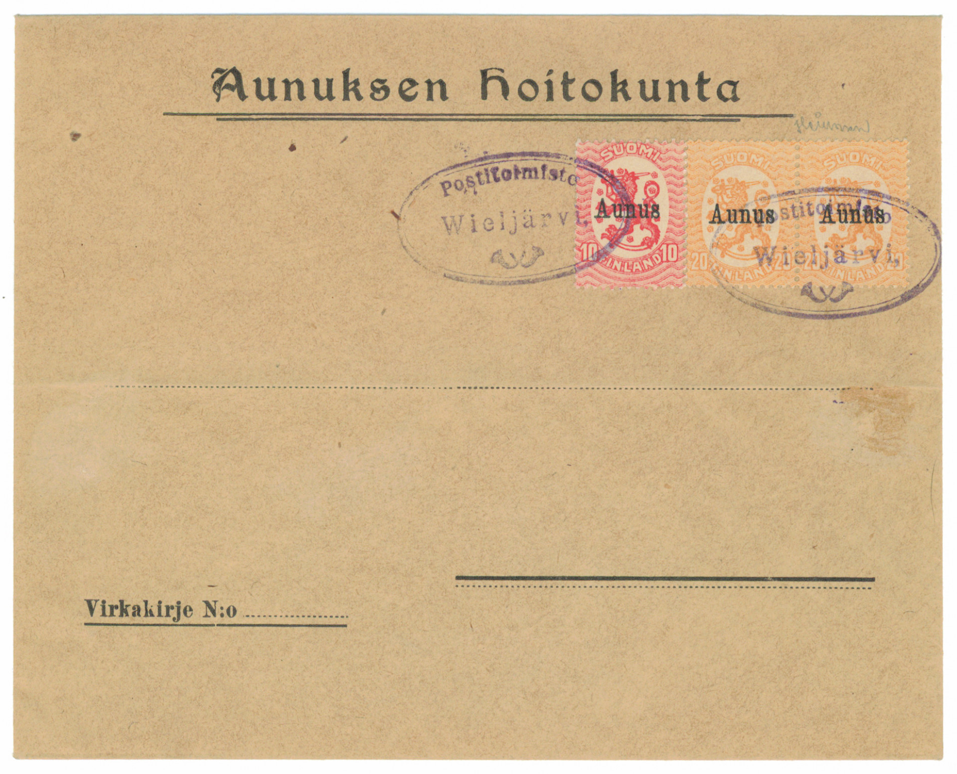 Postitoimisto Wieljärvi ovaalileimaus Aunuksen Hoitkokunnan kuorella 10 penniä ja 20 penniä parin kera. Kuoressa taite
