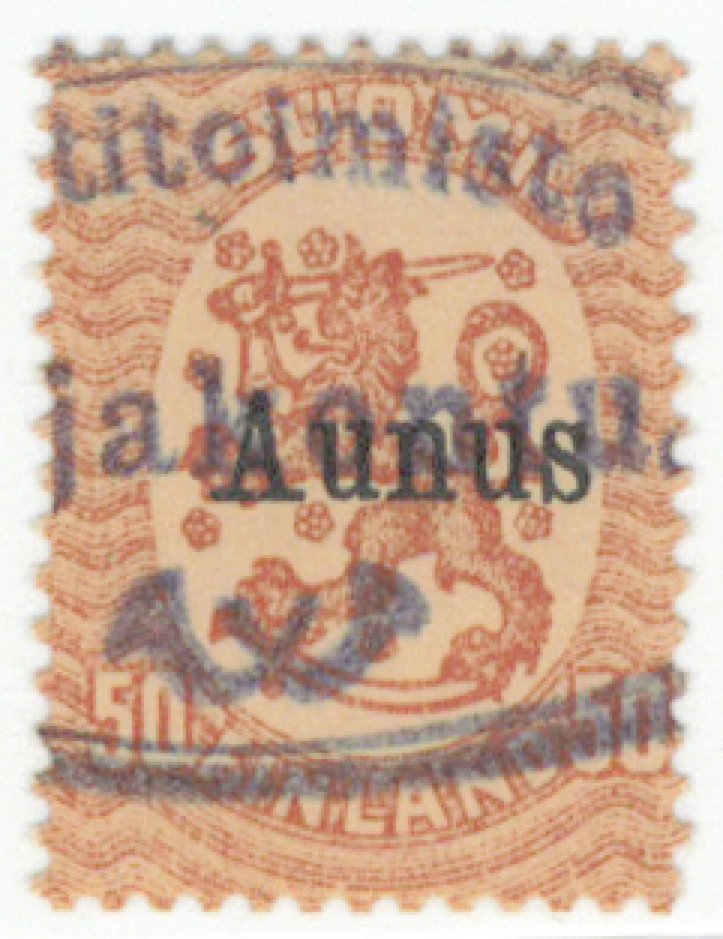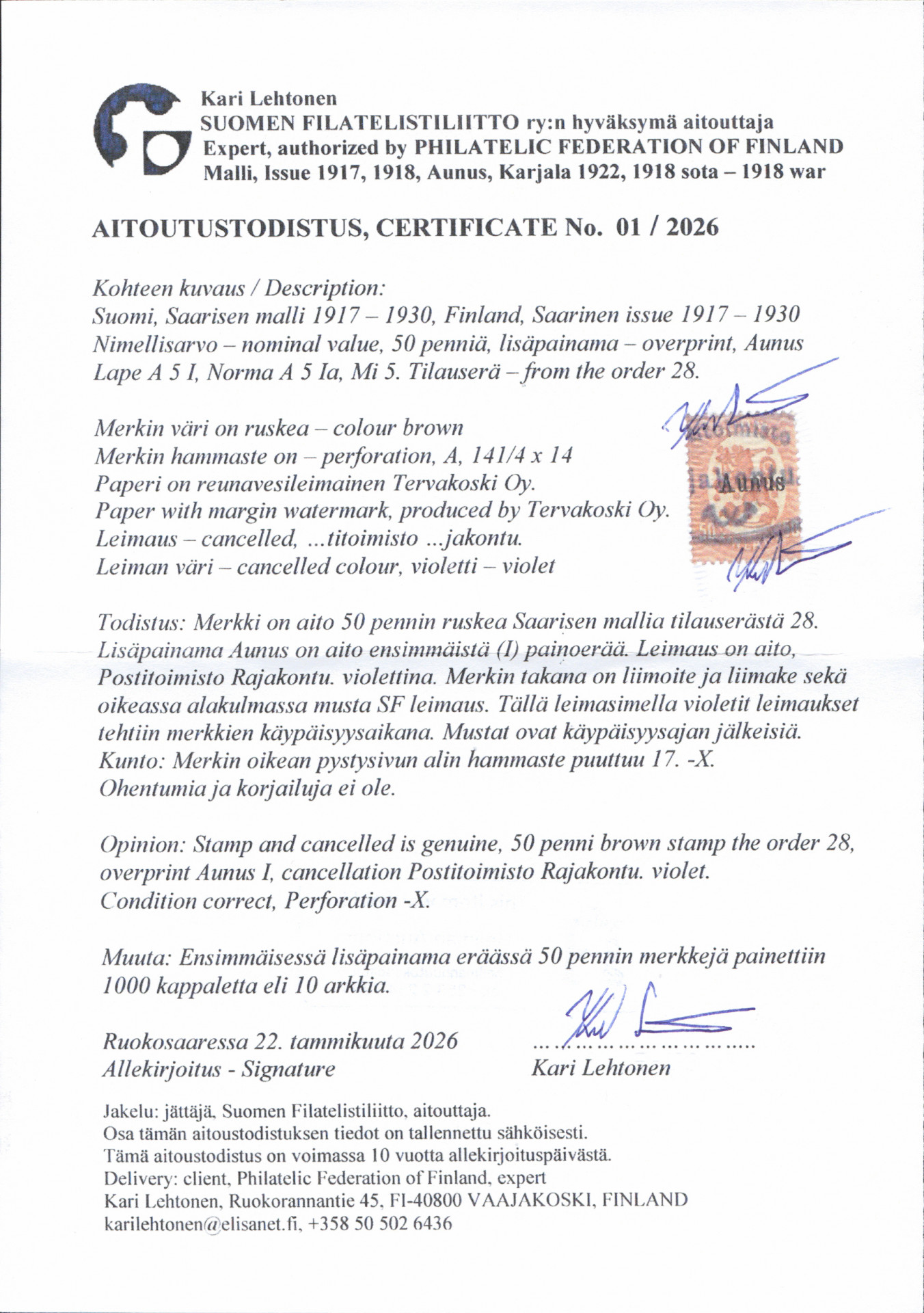 50 penniä 1. painos hieno violetti Rajakonnun leimaus. Yksi lyhy hammas. Painos vain 1000 kpl. Aitoutus: Lehtonen (2026)