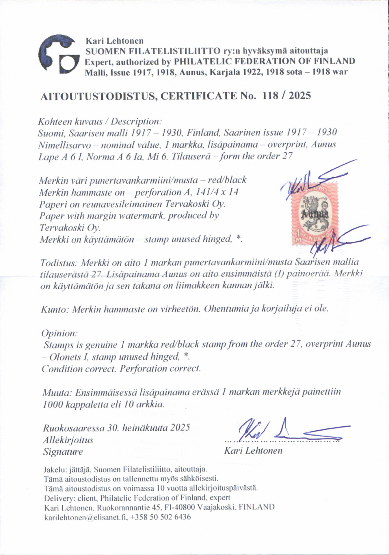1 markka 1. painos käyttämätön *. Aitoutus Lehtonen (2025)