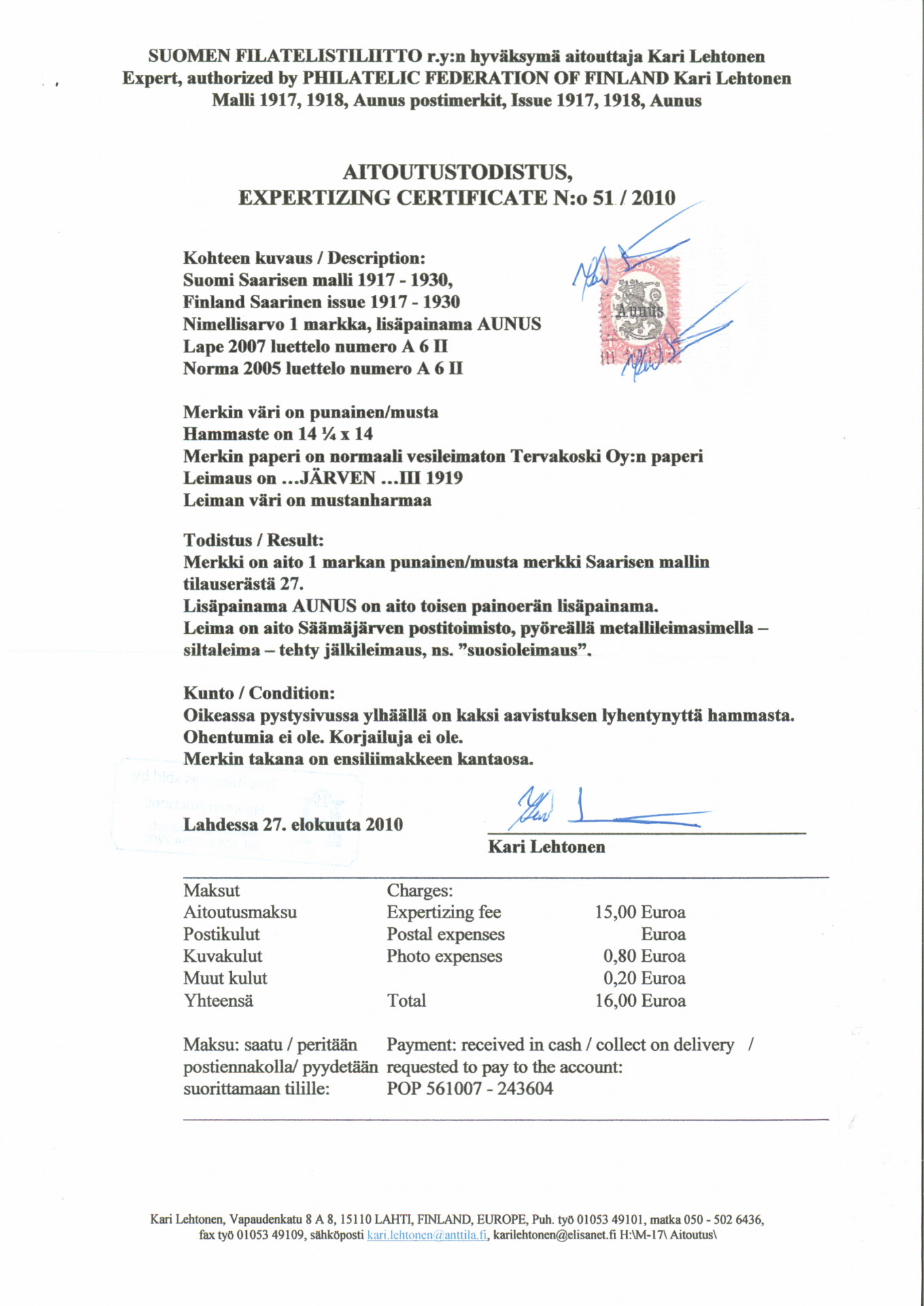1 markka siisti jälkileimattu. Aitoutus Lehtonen (2010)