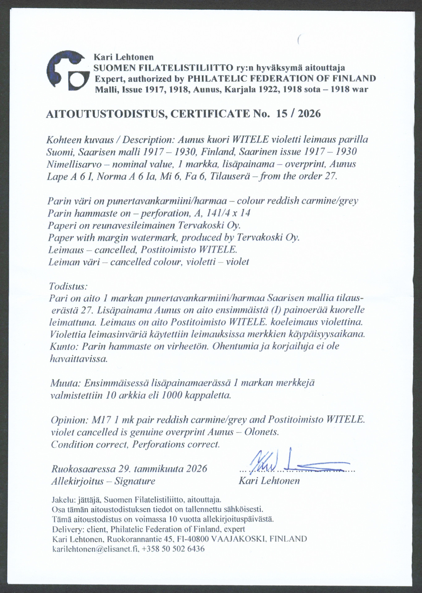Erittäin harvinainen KOELEIMAUS Witele 1 markka (1. painos) pari kuorella! Aitoutus: Lehtonen (2026)