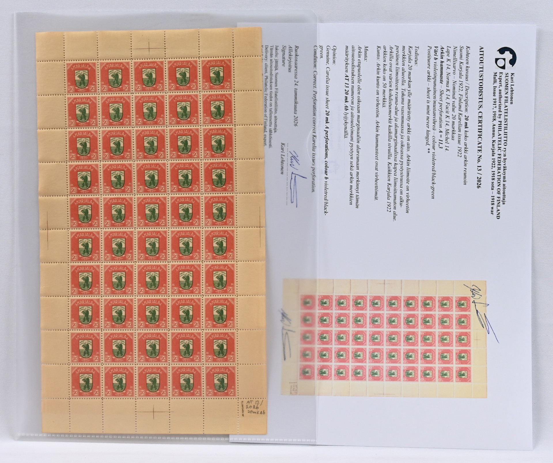 20 markkaa Ab hyvä KOKO ARKKI (50) postituore ** aitoutus: Lehtonen (2026)