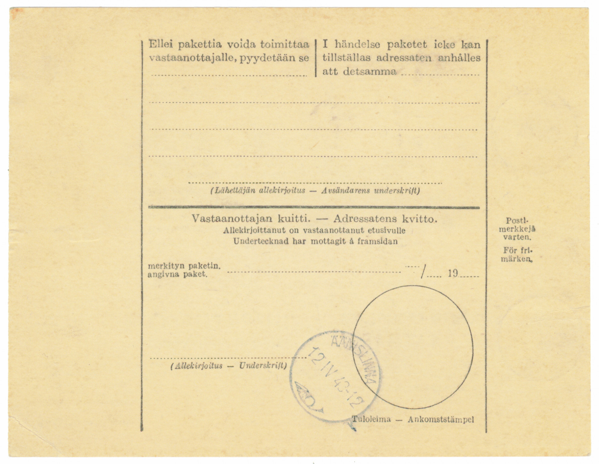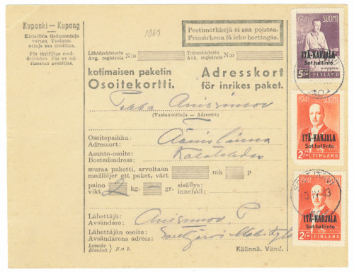 Harvinainen pakettikortti Itä-Karjalan sisäisessä postissa, erittäin kaunis Soutjärvi 10.4.1943 Äänislinnaan