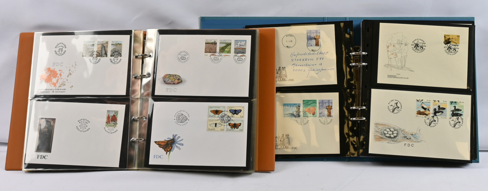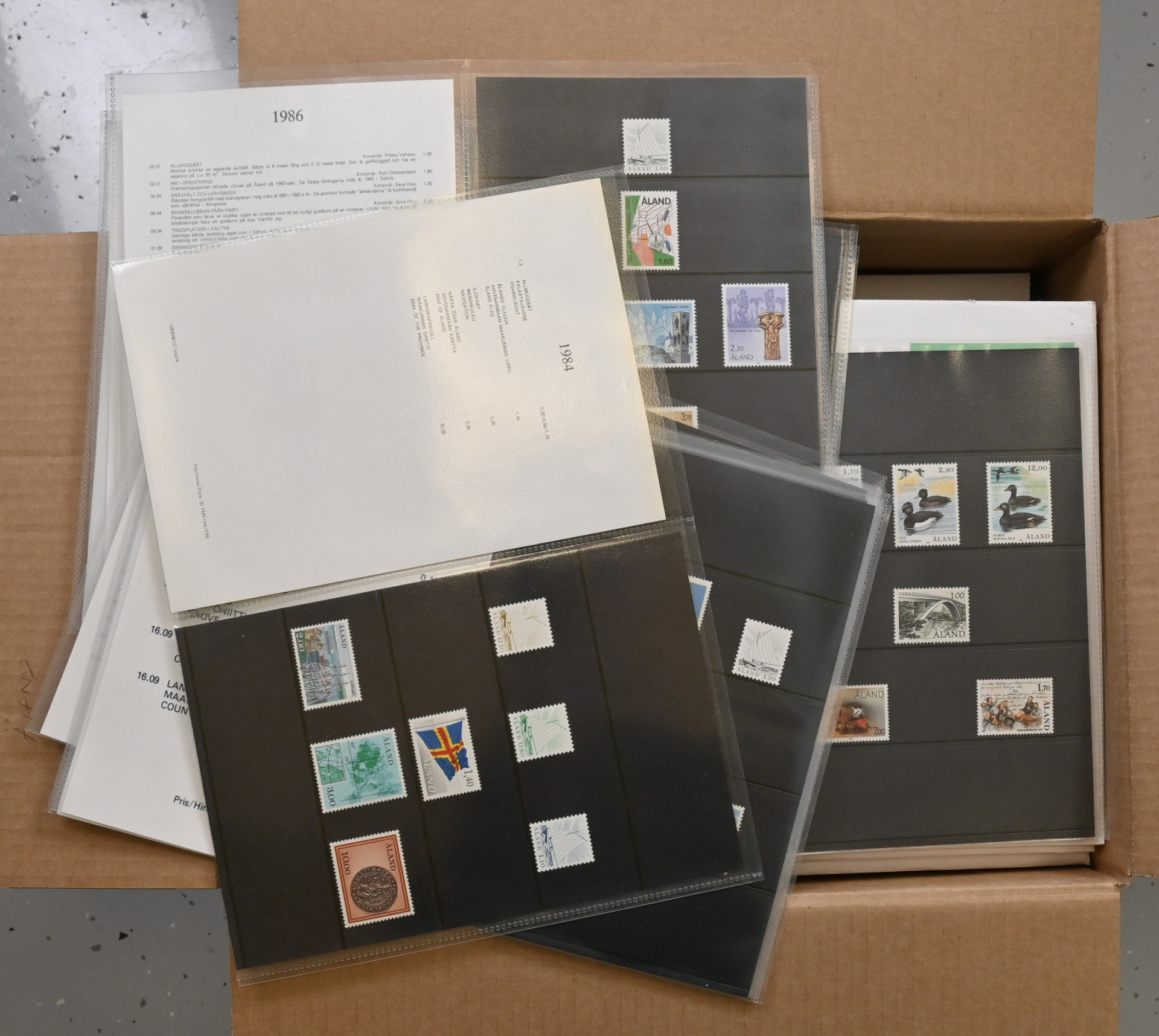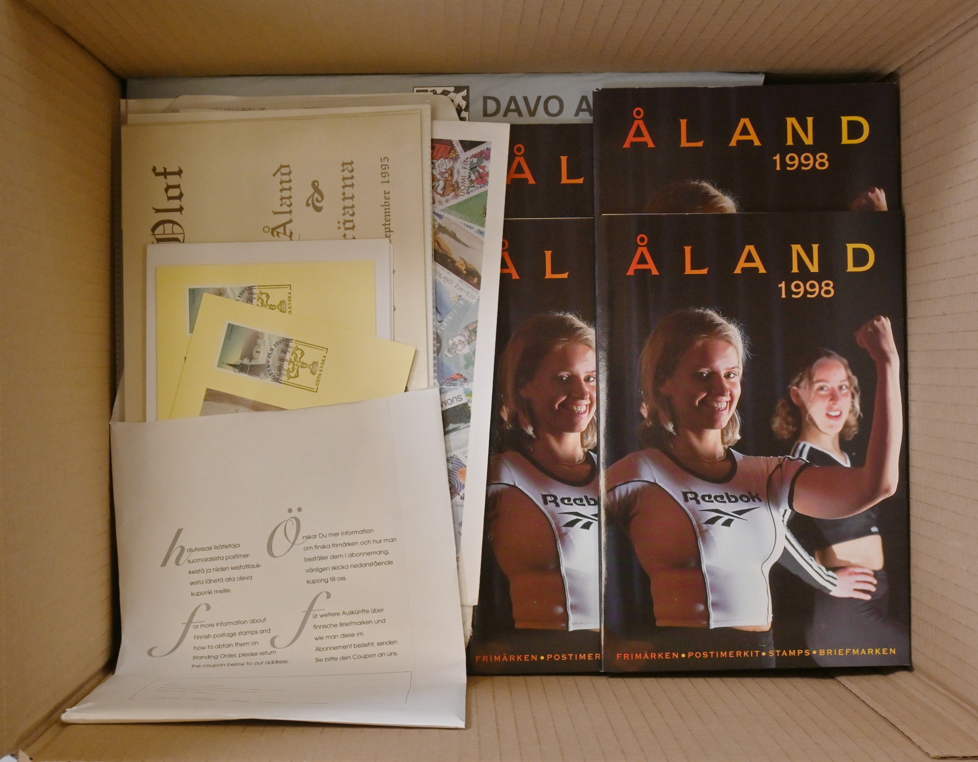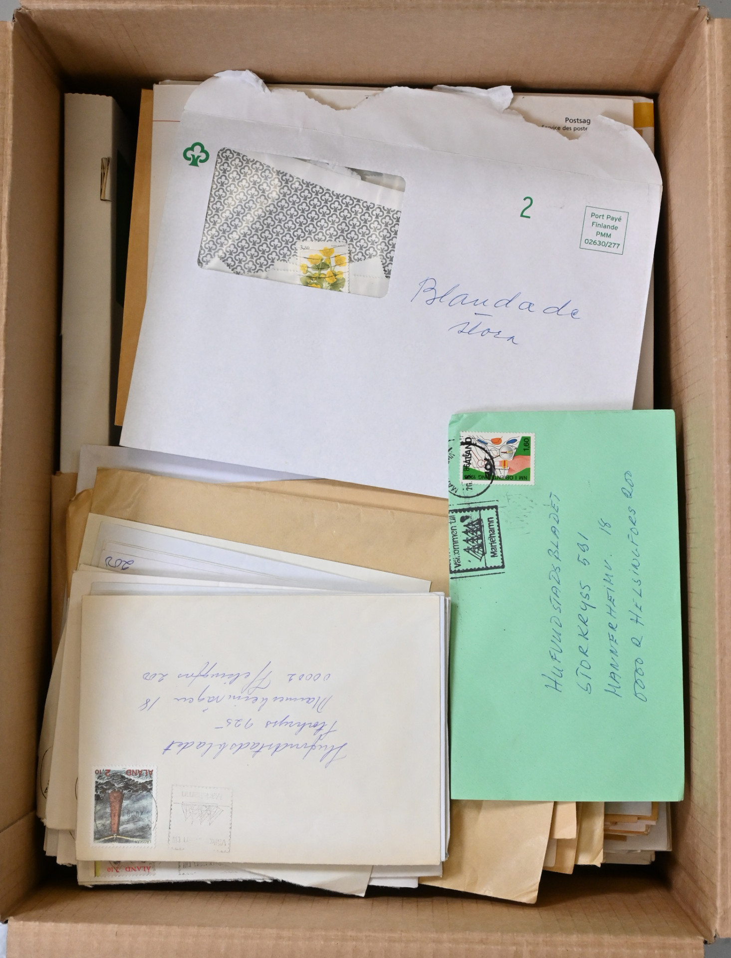 JÄTTIERÄ kuudessa laatikossa, yli 60 KG materiaalia aina pitkälle 2000-luvulle asti!!! Mukana kaikkea filateliaa mitä Ahvenanmaan Postista on saanut: leimattuja ja leimaamattomia merkkejä, välilöpareja, FDC-kuoria, maksikortteja, vuosilajitelmia (myös leimattuja), vuosikirjoja ym. Mukana myös runsaasti tavallisia kirjeitä, pari FDC-kuorikansiota, tyhjä maakansio, hiukan vanhoja postikortteja jne. Suurin osa uutuuspalvelusta tilatusta materiaalista vielä alkuperäisissä kirjekuorissa mainoksineen. Hyvin korkea hankintahinta