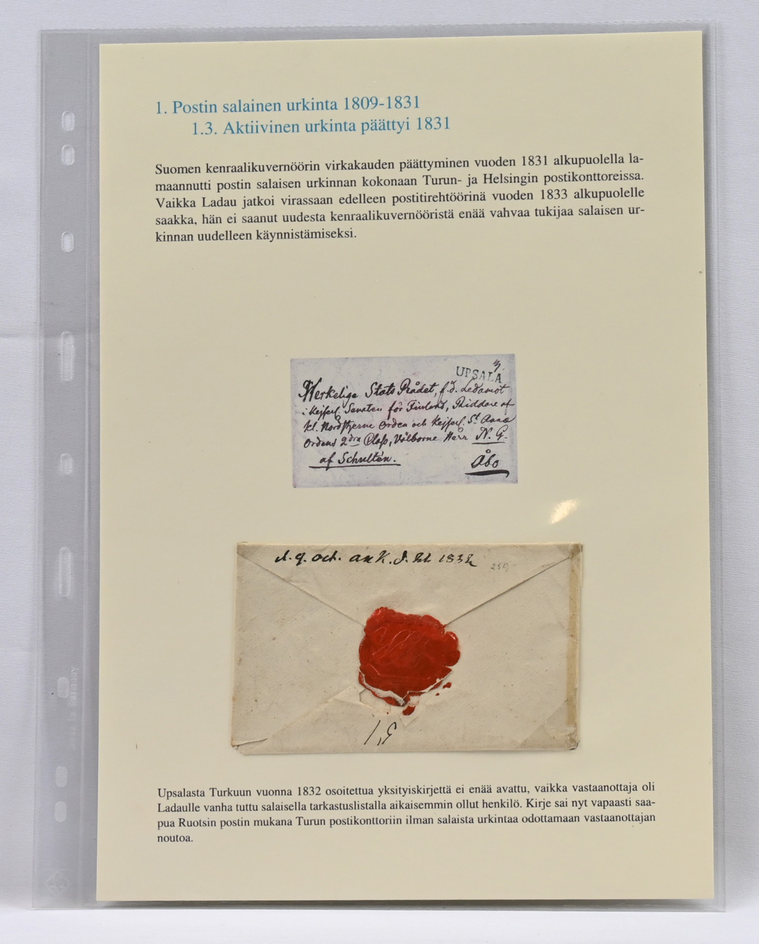 Aktiivinen urkinta päättyi 1831: kirje Ruotsista Turkuun, joka osoitettu henkilölle, joka oli aiemmin ollut tarkastuslistalla. Nyt kirje sai vapaasti saapua perille. Ex Jorma Keturi