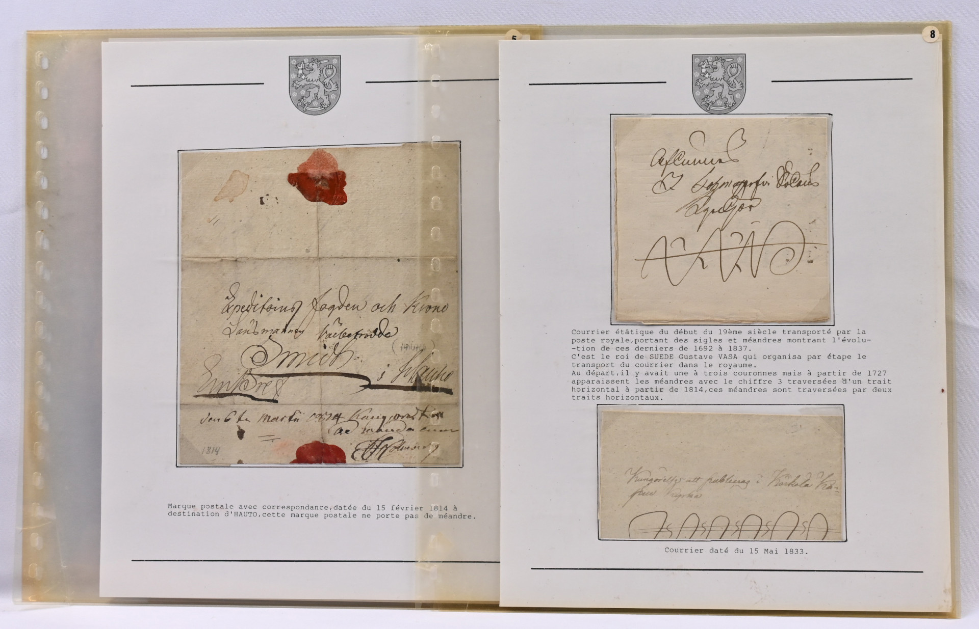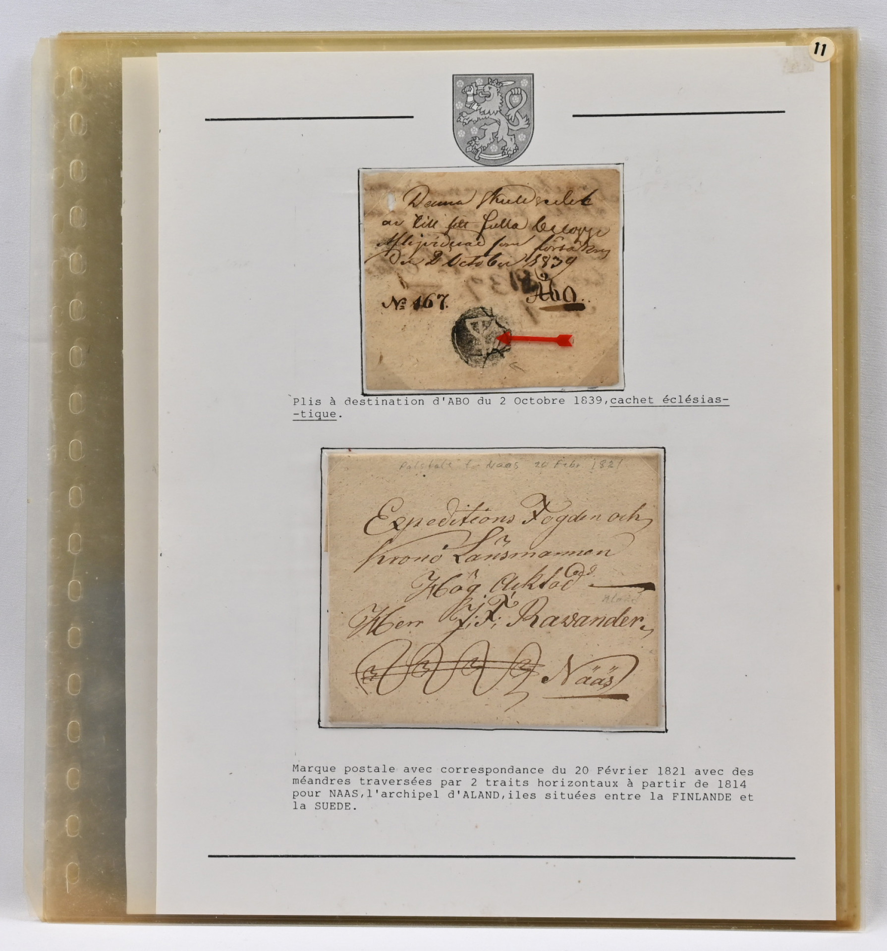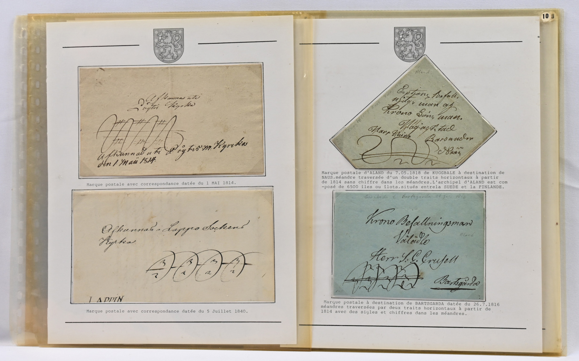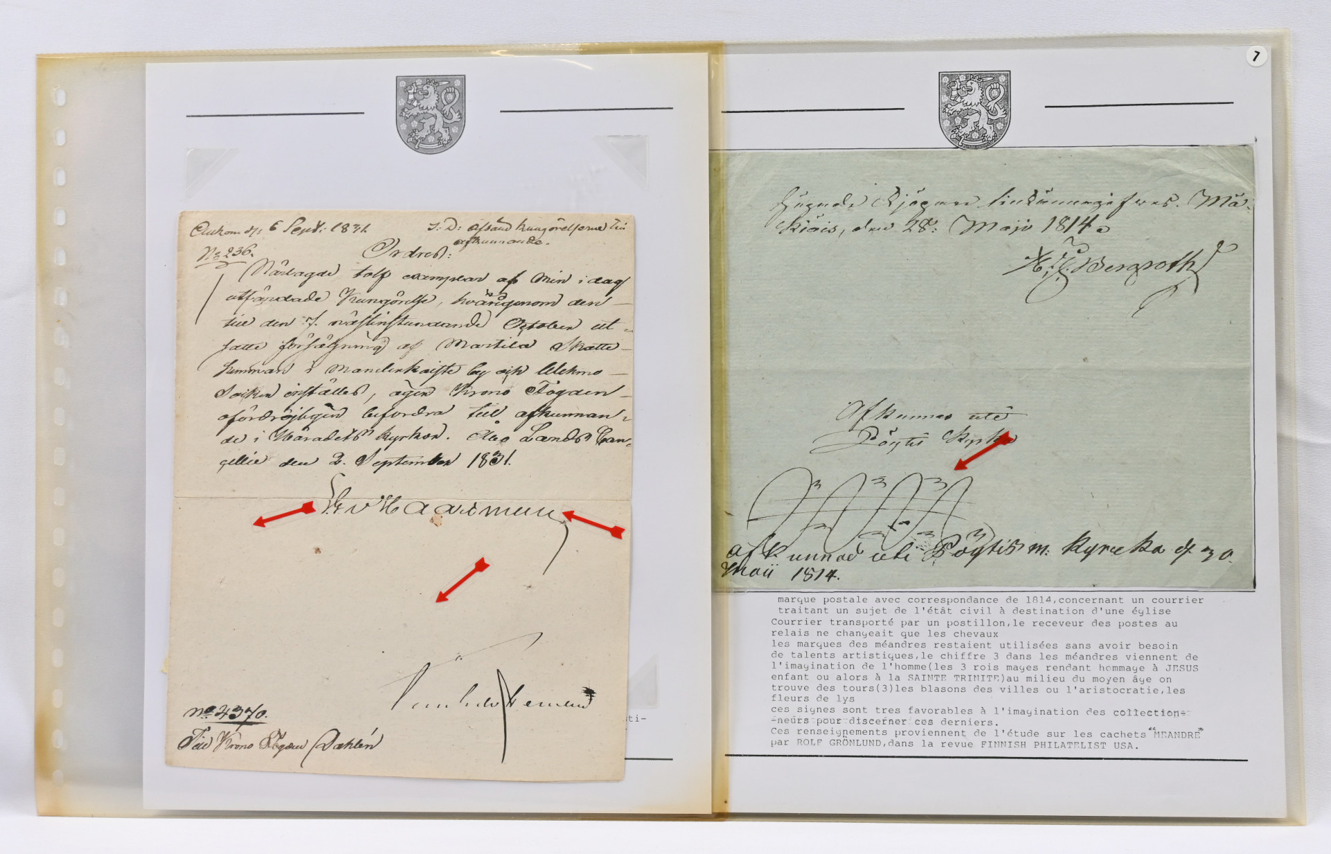 Hieno kokoelma -aineisto sivuilla vanhoja kirjeitä yli 10 kpl pääosin Meanderkuvioin myös kolerakirje vuodelta 1831