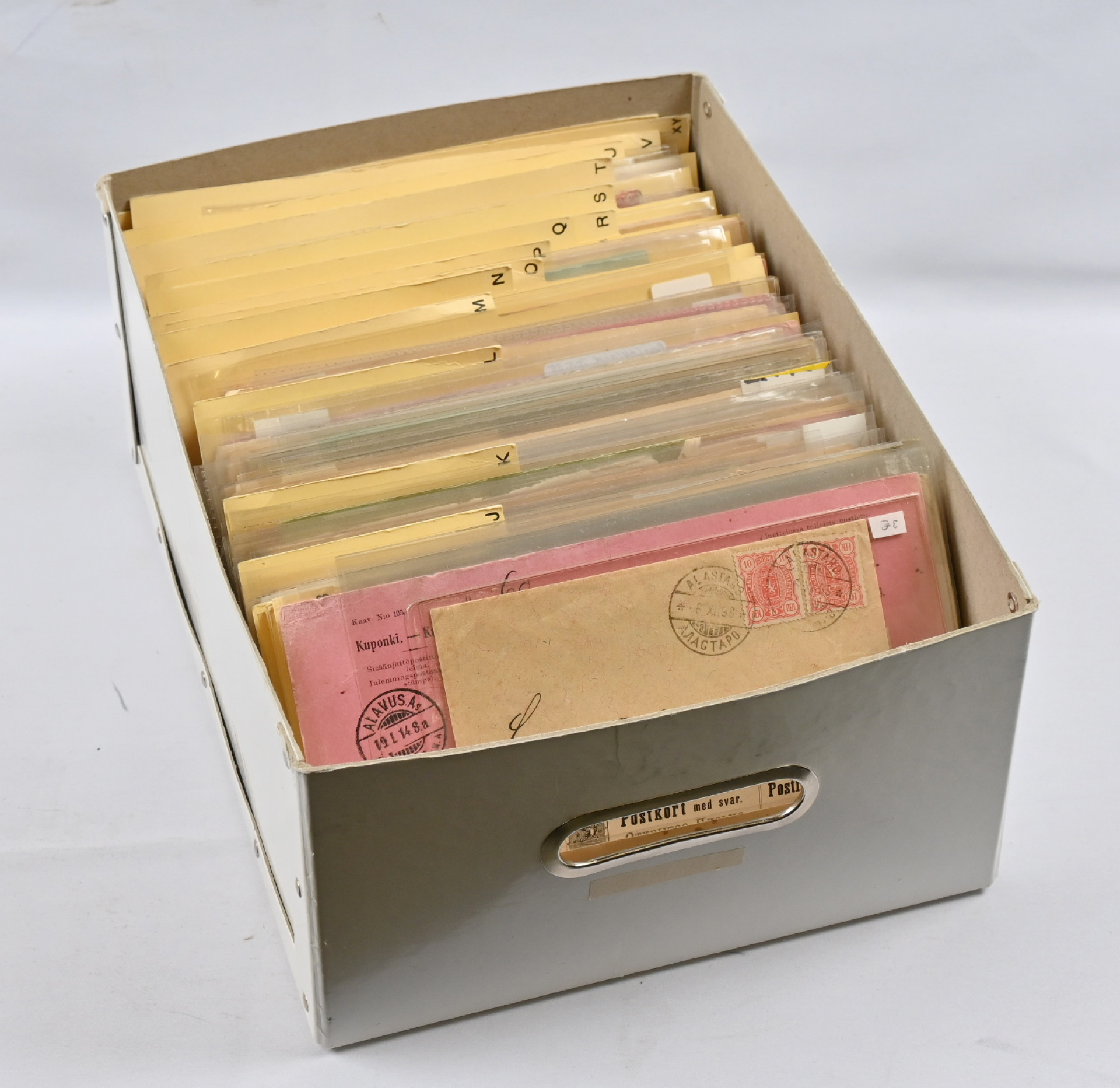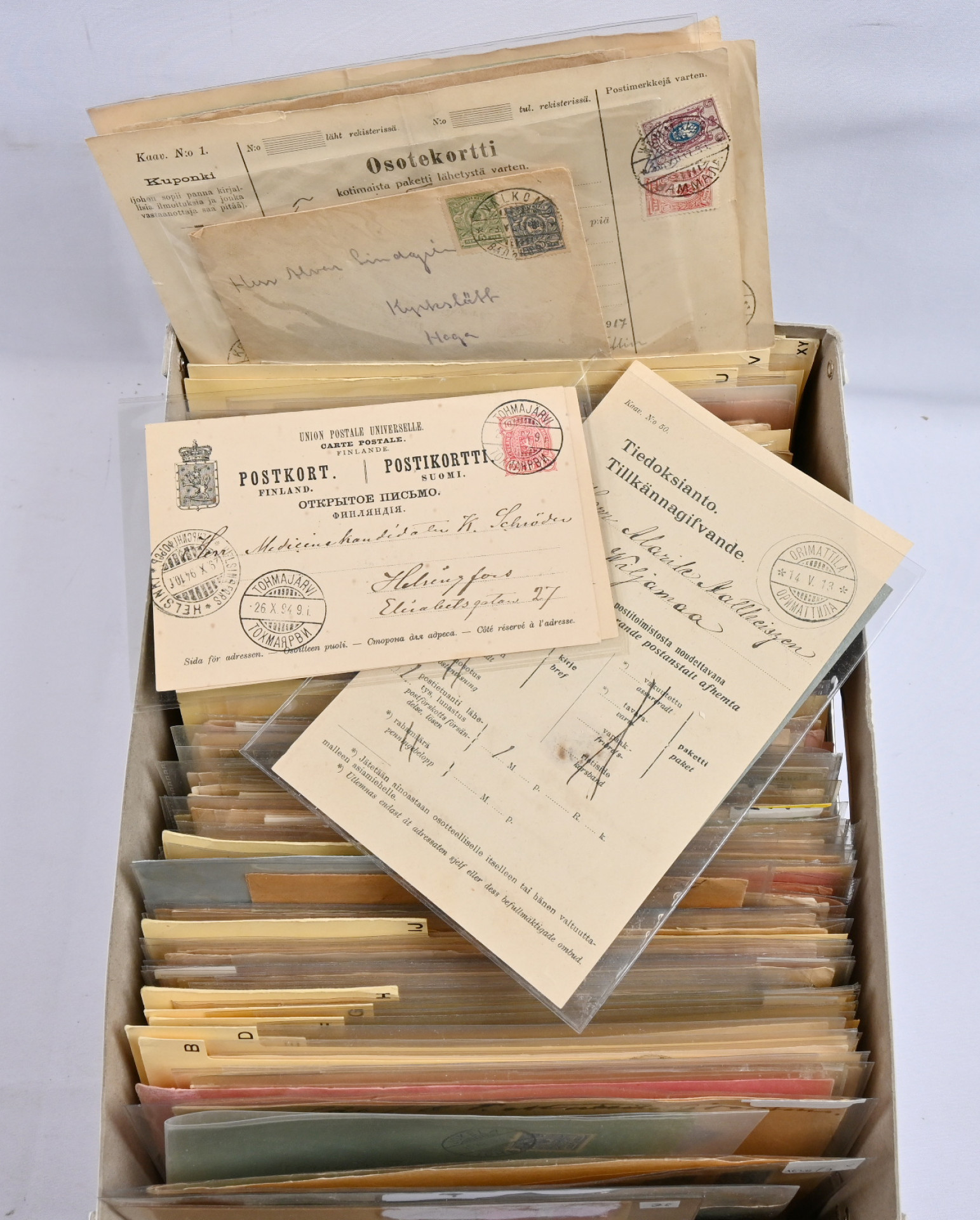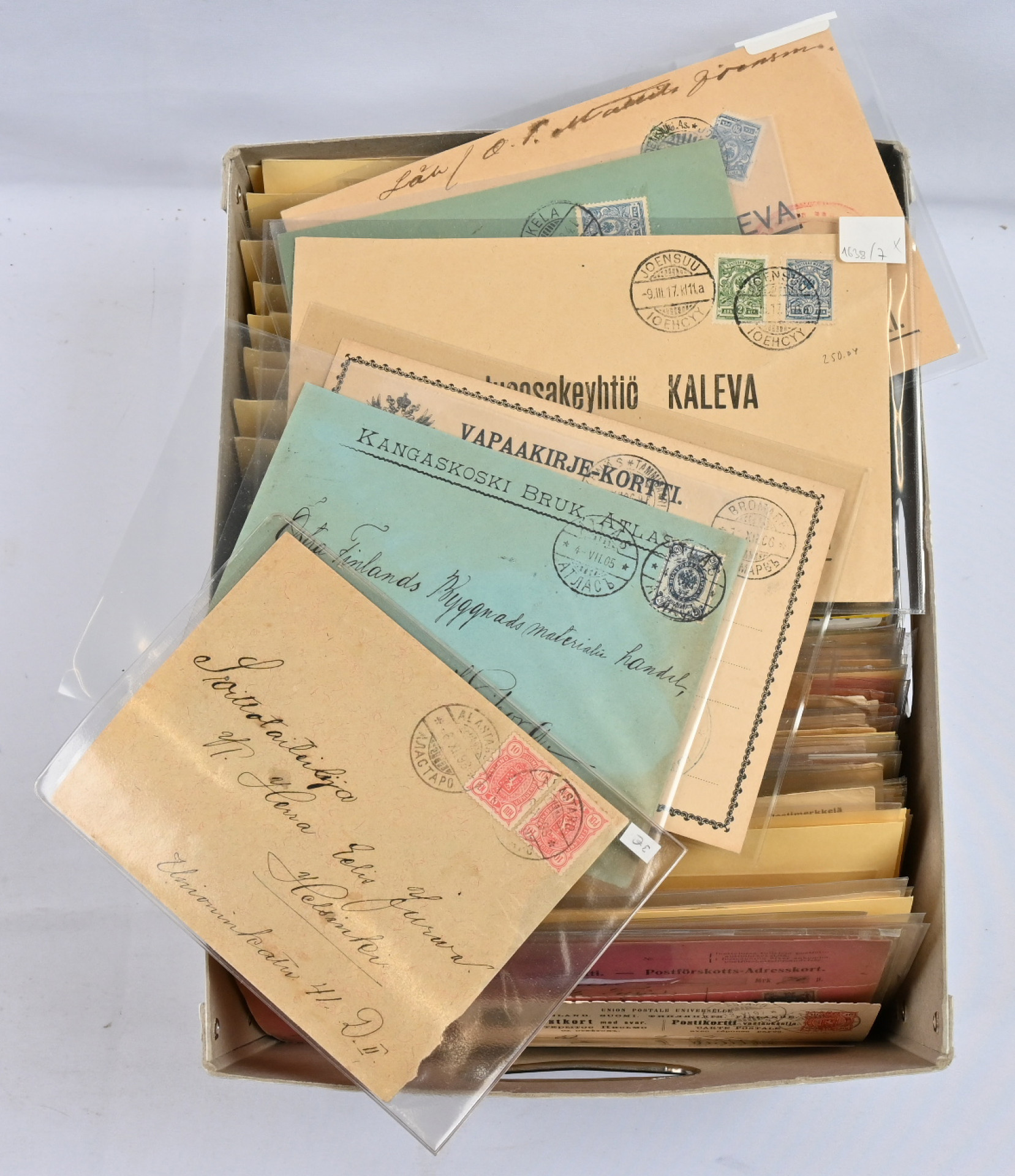 Venäläisleimoja lähetyksillä hieno erä, arviolta 250 - 350 kappaletta. Monipuolinen leimojen ja lähetyslajien suhteen, vain vähän ehiökortteja, myös pakettikortteja, postiosoituksia, kirjattua ym. Materiaali on hyvin järjestetty aakkosjärjestykseen paikkakunnittain. Lähinnä erilaisia, joitakin kaksoiskappaleita.