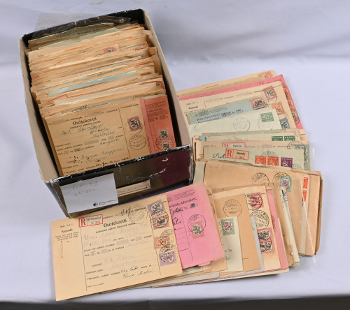 Venäläisleimoja, joista venäjä poistettu lähetyksillä hieno erä noin 1,7 KG laatikossa, arviolta lähes 500 kappaletta. Monipuolinen leimojen ja lähetyslajien suhteen (pakettikortteja, postiosoituksia, kirjattua ym.) Materiaali on pääosin järjestetty aakkosjärjestykseen paikkakunnittain. Lähinnä erilaisia, joitakin kaksoiskappaleita. ...