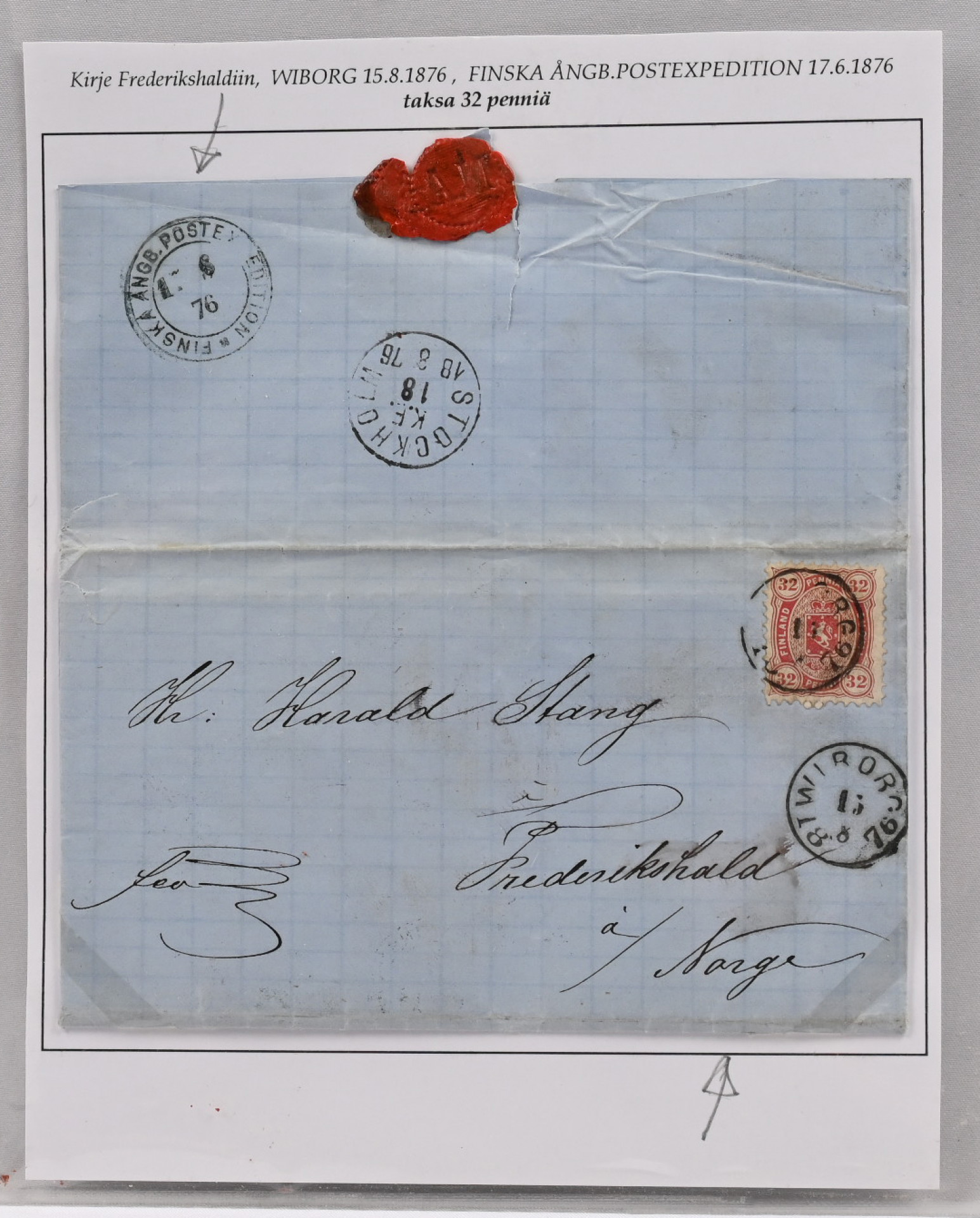 Erittäin harvinainen Finska Ångb. Postexpedition 17.8.1876 laivaleima kirjeellä m/75 32 pennin merkin kera Norjaan! Kaunis Wiborg 1876 ja Stockholm -leimat. Laivaleimaa tunnetaan tiettävästi vain neljä leimaa lähetyksillä!