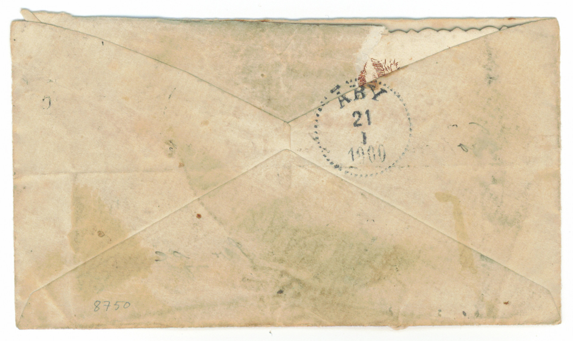 1900 s/s Boren haaksirikko postia: kuoressa uudenvuodentervehdys Ruotsiin, tuloleima 21.1.1900. Kuorella Tillhör Ångf. Bores post -merkki