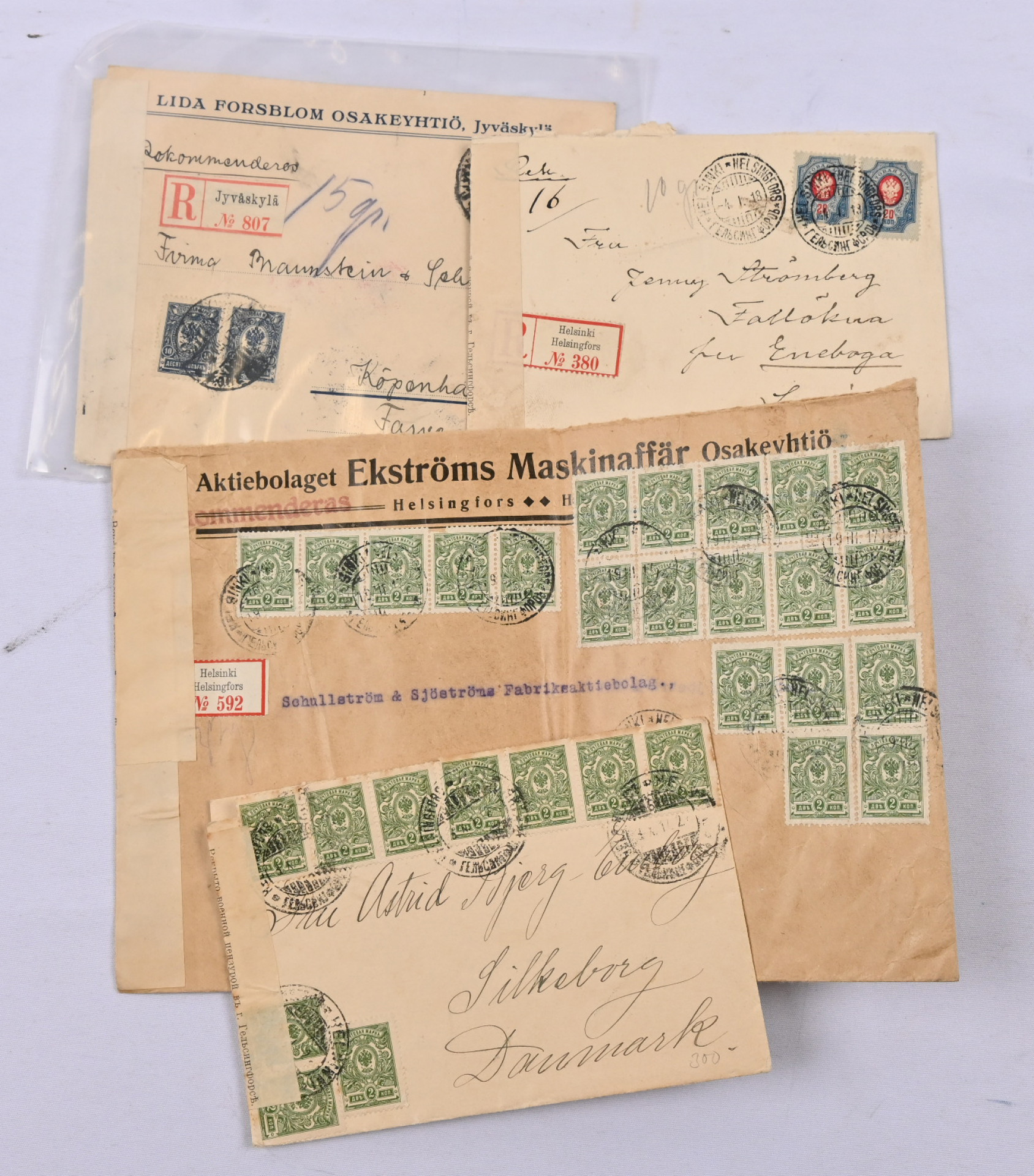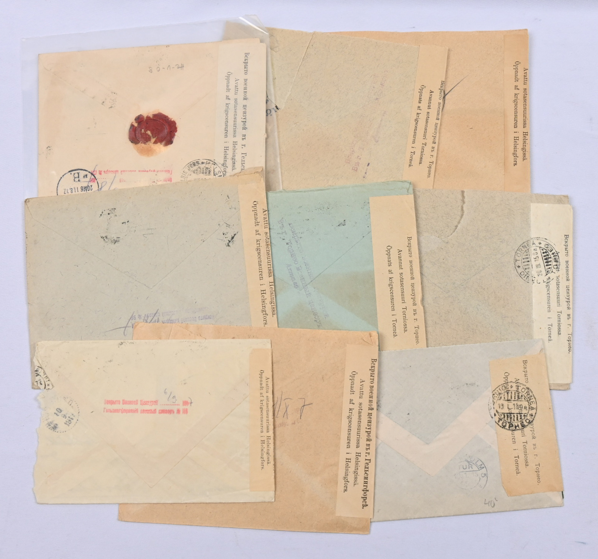 1914 - 1928 sotasensuurilähetyksiä ulkomaille yli 20 kappaletta. Pääosa Ruotsiin, 3 Tanskaan, 1 Ranskaan. Paljon erilaisia sensuuriliuskoja, myös sensuurin alkuajoilta