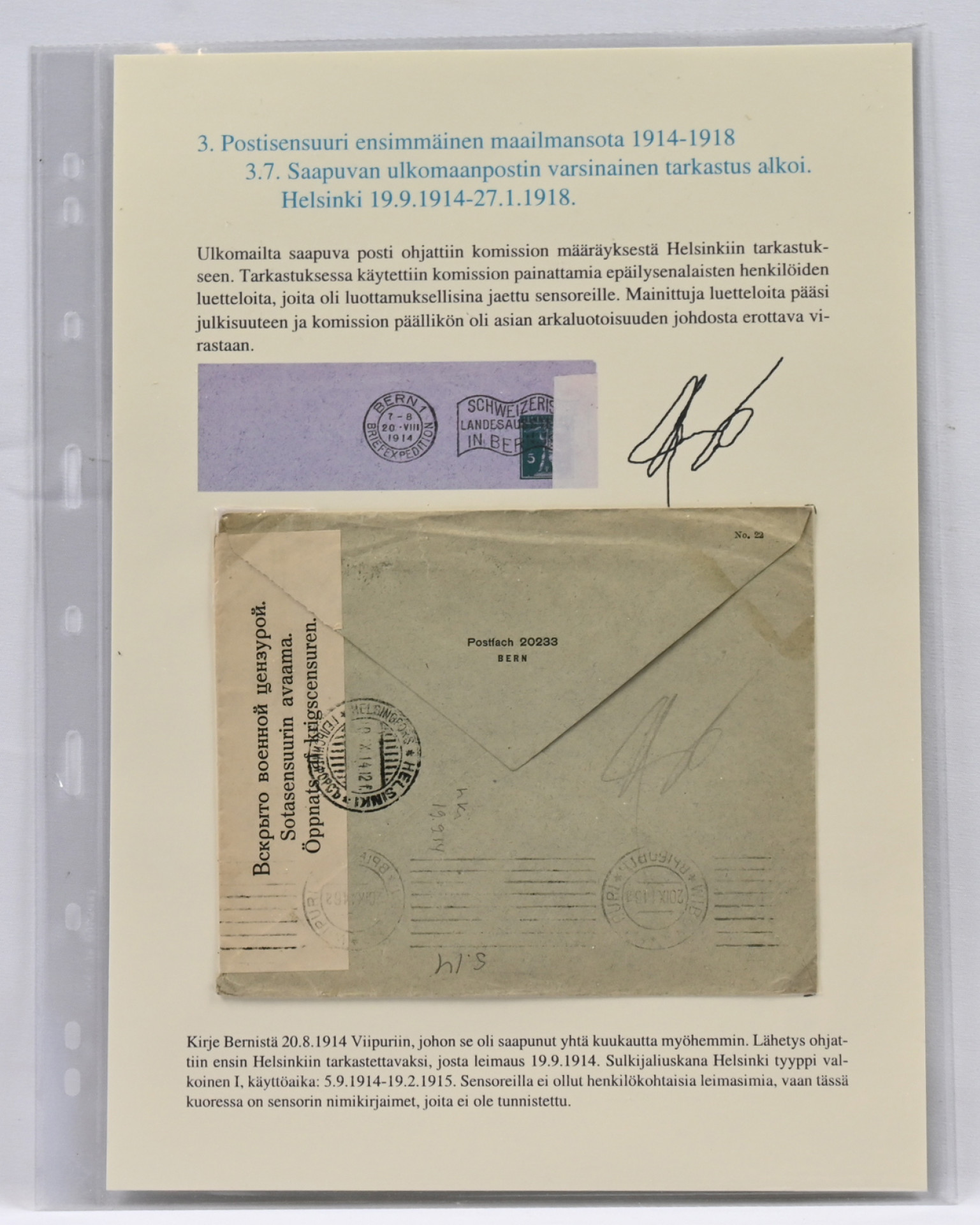 Sveitsistä 20.8.1914 kirje Viipuriin, jonne se saapui yhtä kuukautta myöhemmin. Lähetys ohjattiin Helsinkiin tarkastettvaksi: valkoinen sulkijaliuska tyyppi I ja Helsinki 19.9.1914 sekä sensorin nimikirjaimet. Ex Jorma Keturi