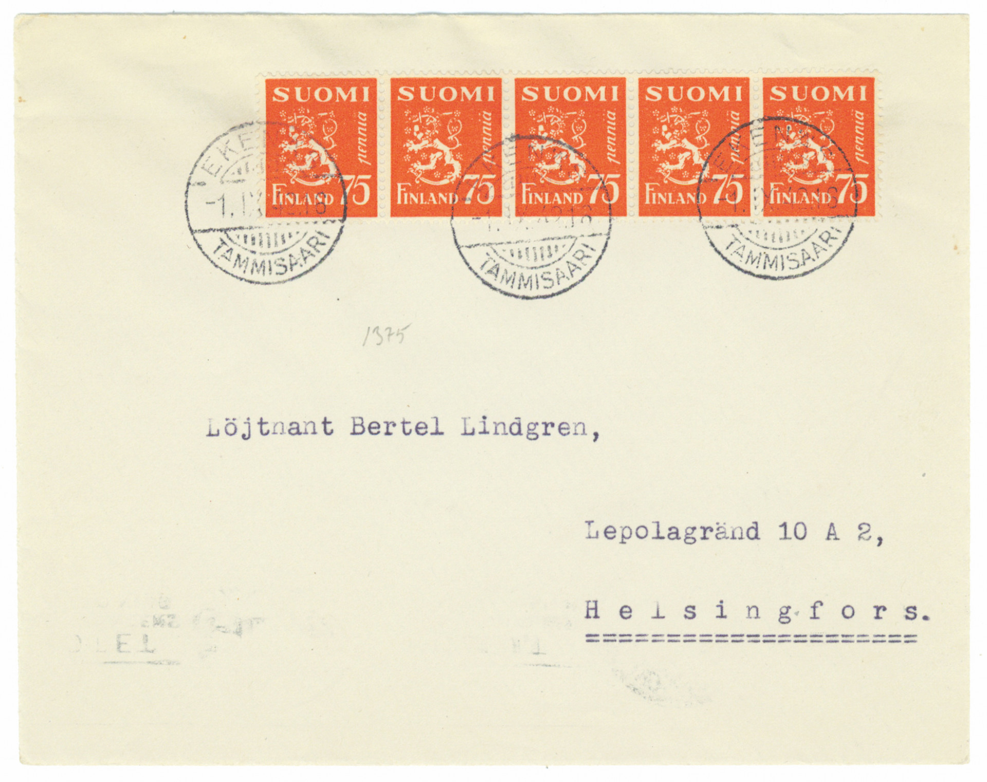 m/30 leijona 75 penniä viisi kpl kuorella Tammisaari 1.9.1942