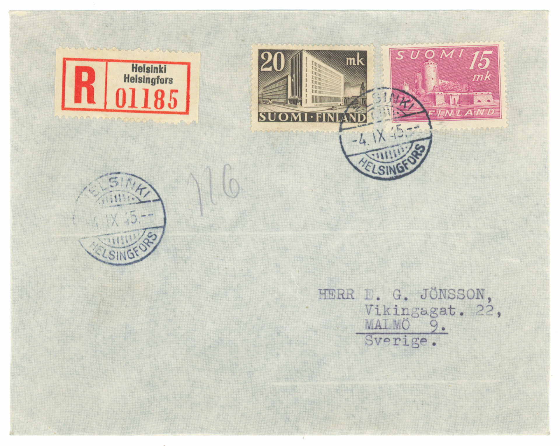 m/30 15 markkaa Olavinlinna ja 20 markkaa Postitalo 4.9.1945