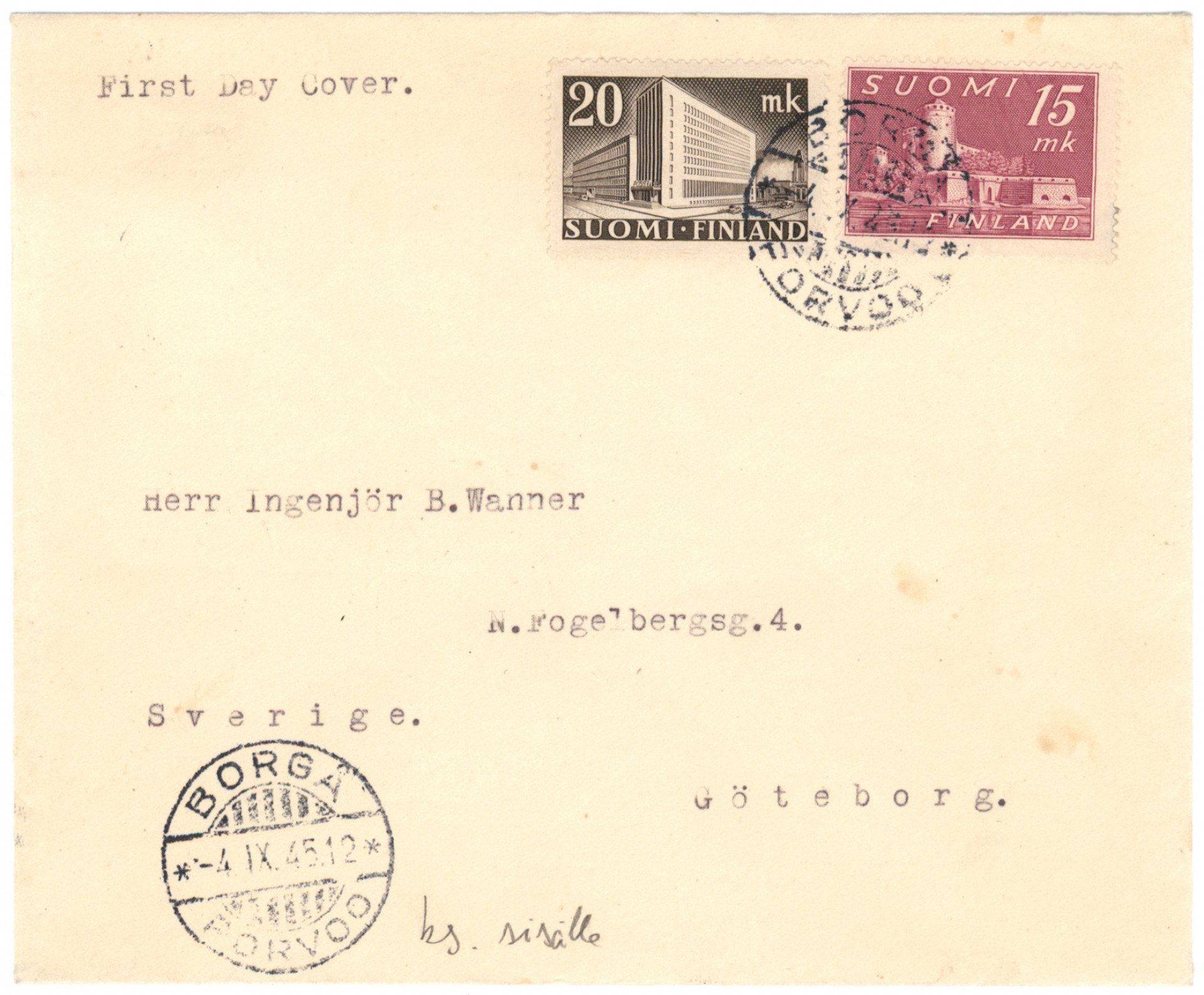 m/30 15 markkaa Olavinlinna ja 20 markkaa Postitalo Porvoo 4.9.1945 hieman ajan patinaa