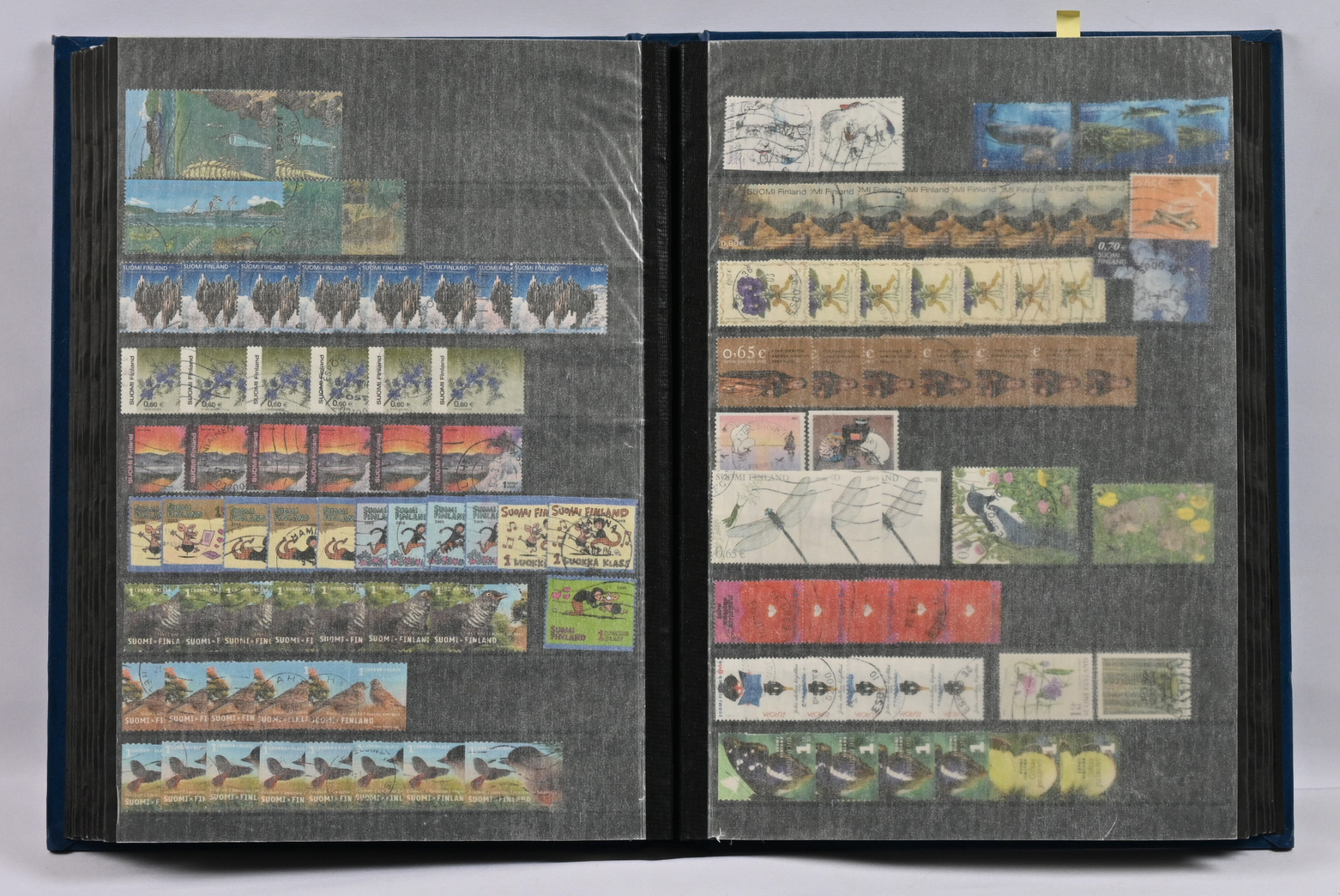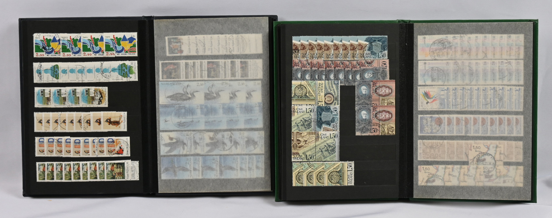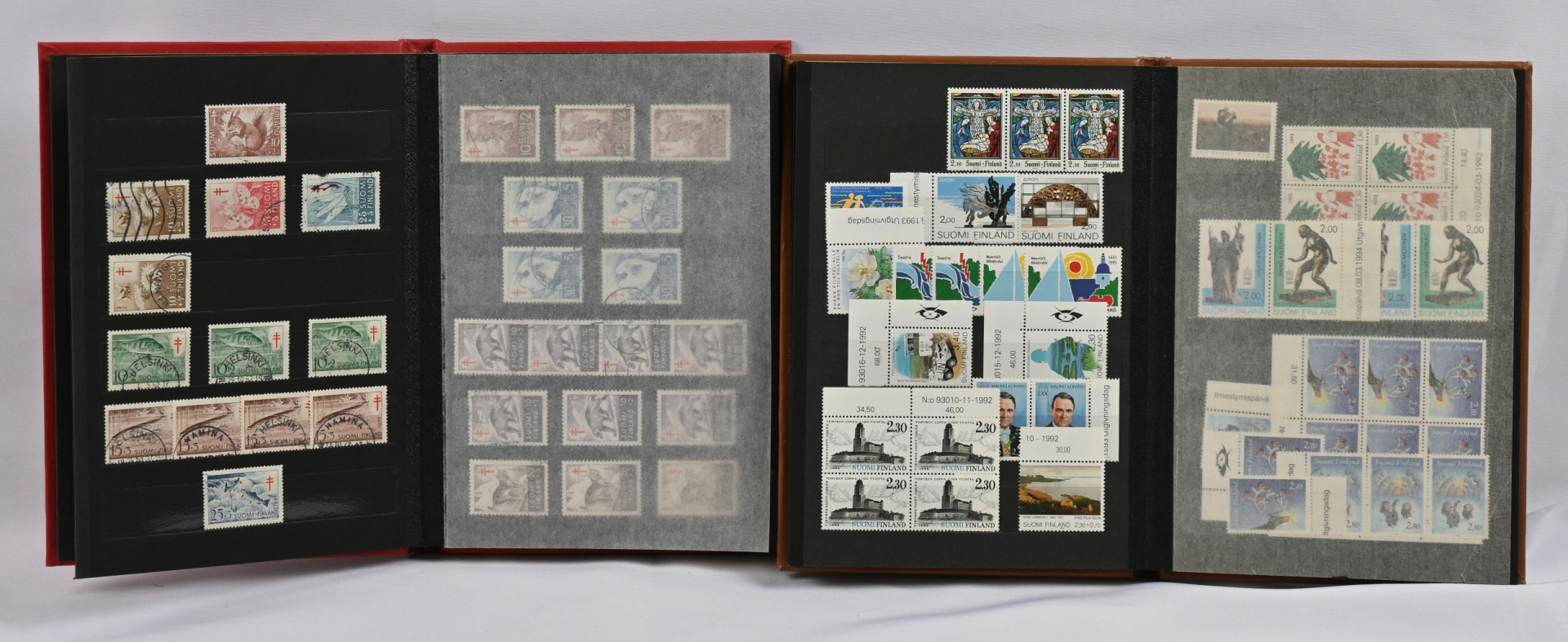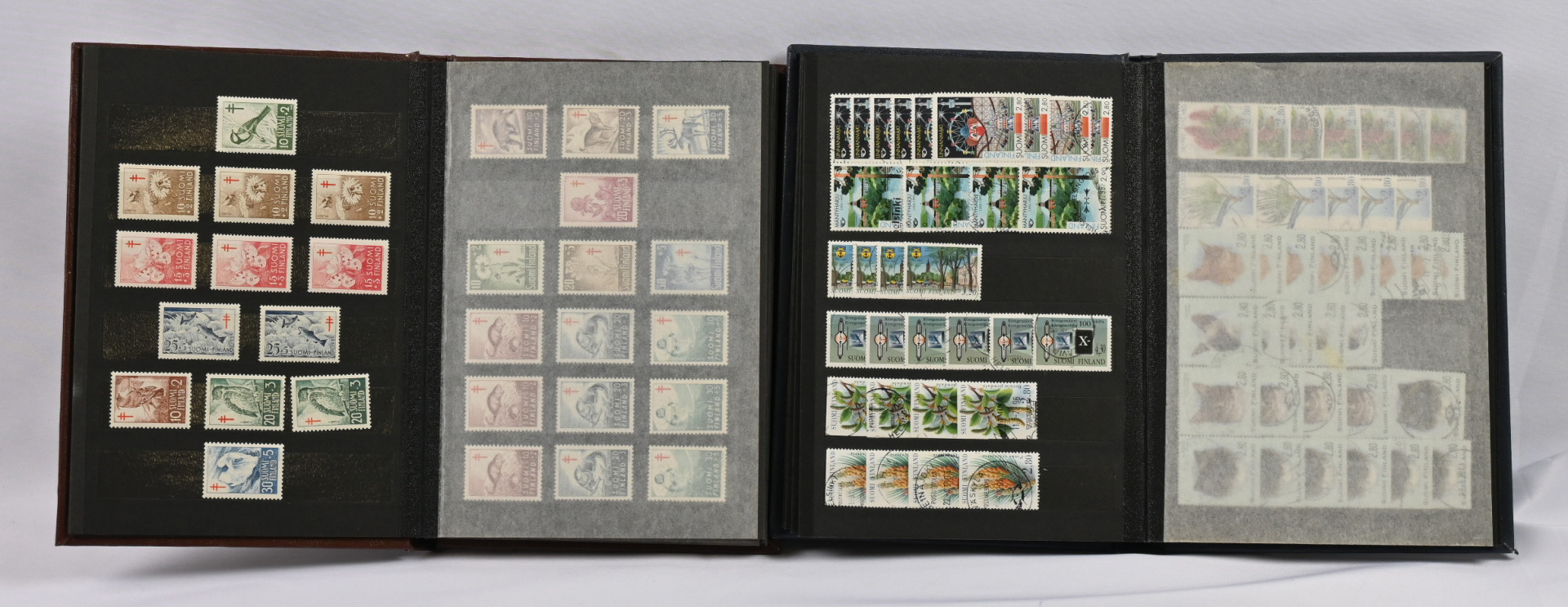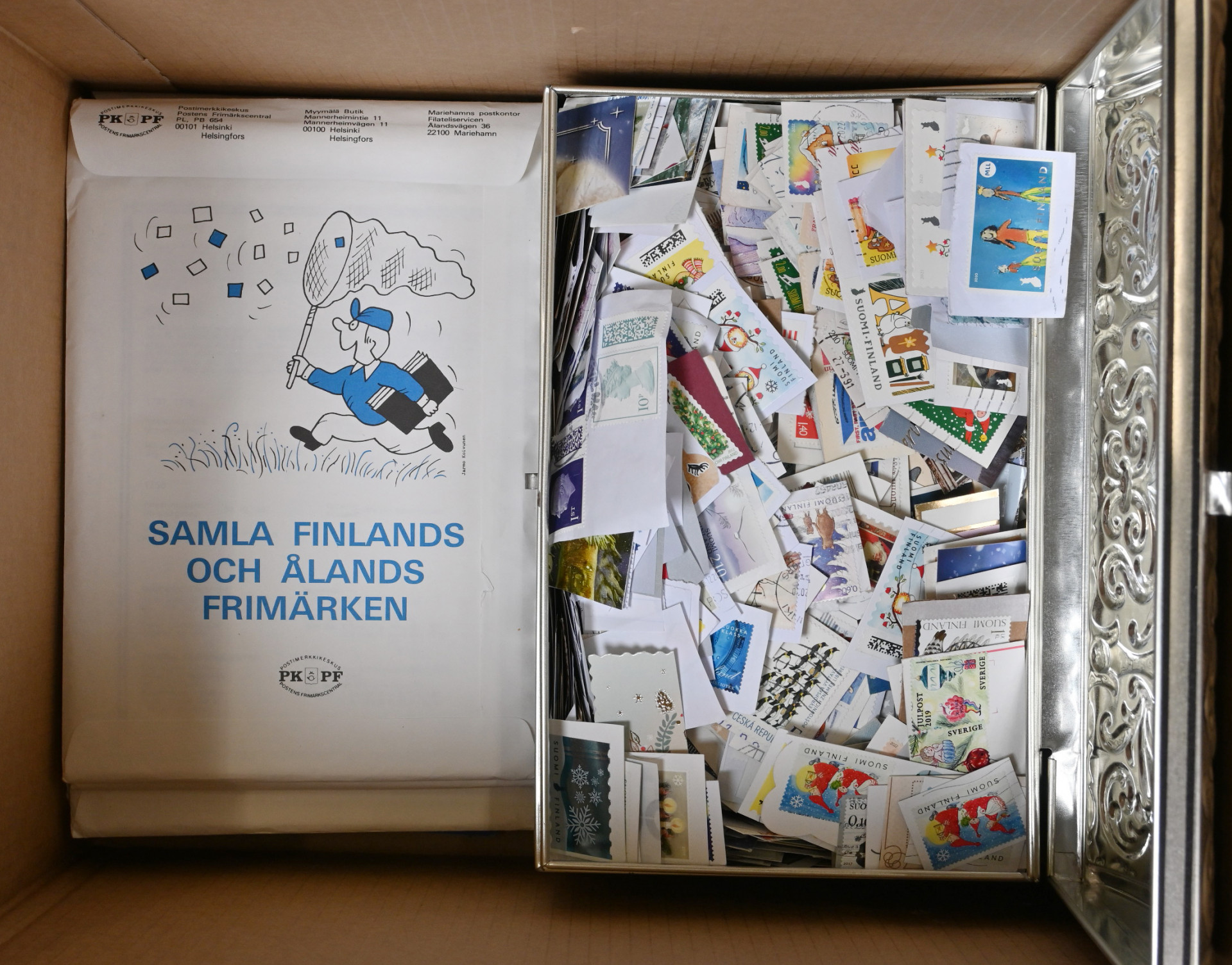 Iso erä suomalaisia merkkejä yli 20 pienikokoisessa säiliökirjassa. Materiaali alkaen 1930 -luvulta mutta pääosin 1960 - 1990-luvuilta. Leimattua ja leimaamatonta, myös Punaista Ristiä ja tuberkuloosia, numerokuusiloita ja -neliöitä ym. ryhmiä, pienoisarkkien ja vihkojen irtomerkkejä, kaunisleimaista ja jopa loistoleimaista, joulumerkkejä ym. Lisäksi kolmessa muussa säiliökirjassa mm. uudempaa leimattua sisältäen euroaikaa, Punaista Ristiä jne. Lisäksi vielä yksi säiliökirja Ahvenanmaata, hiukan kokonaisia arkkeja, Postin Info-lehtiä joissa merkkejä sivujen välissä, laatikollinen leikettä sisältäen uudempaa sekä myös ulkomaita. Tekemistä pitkäksi aikaa!