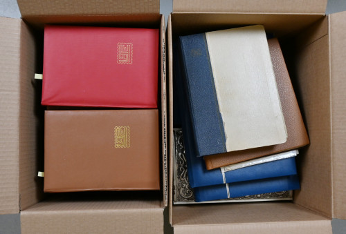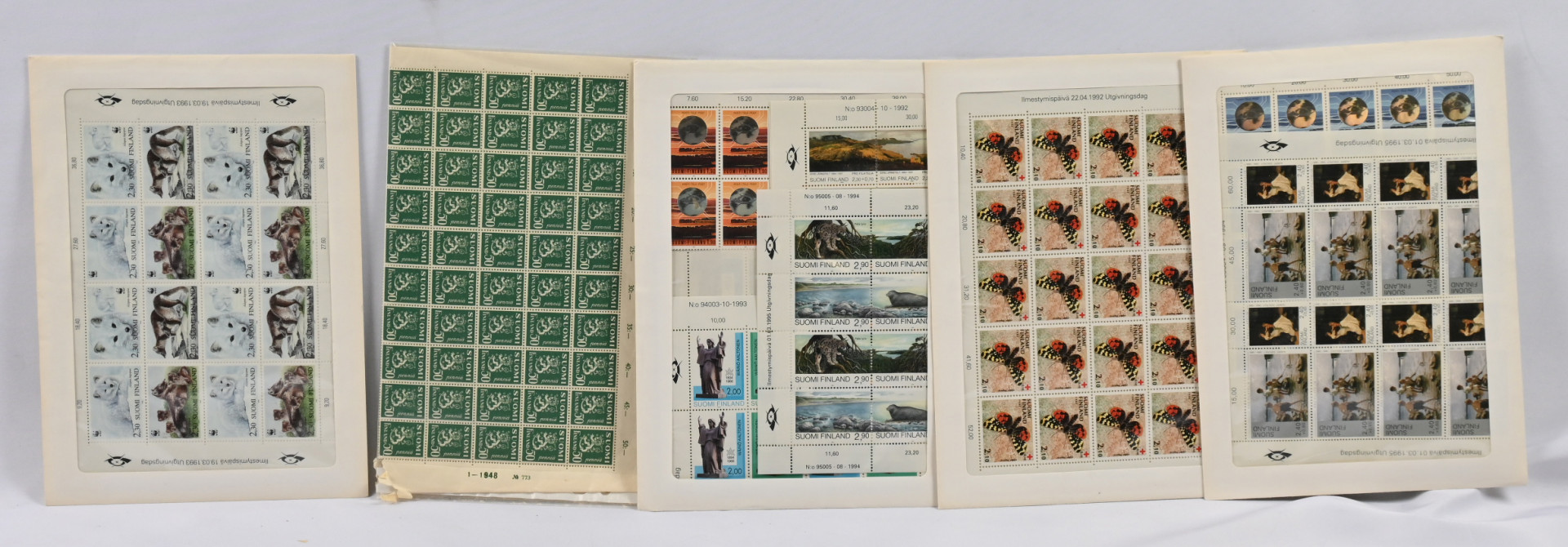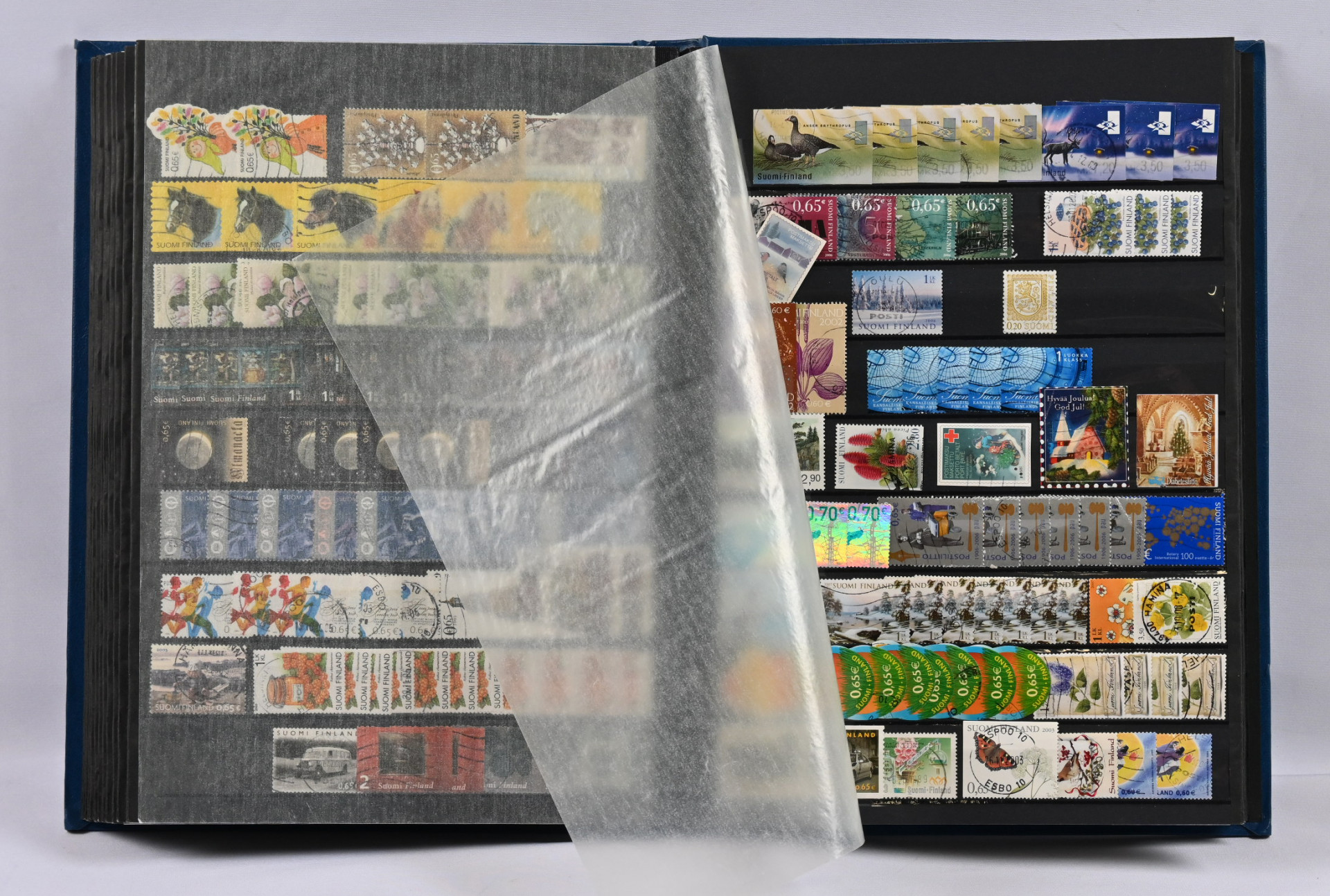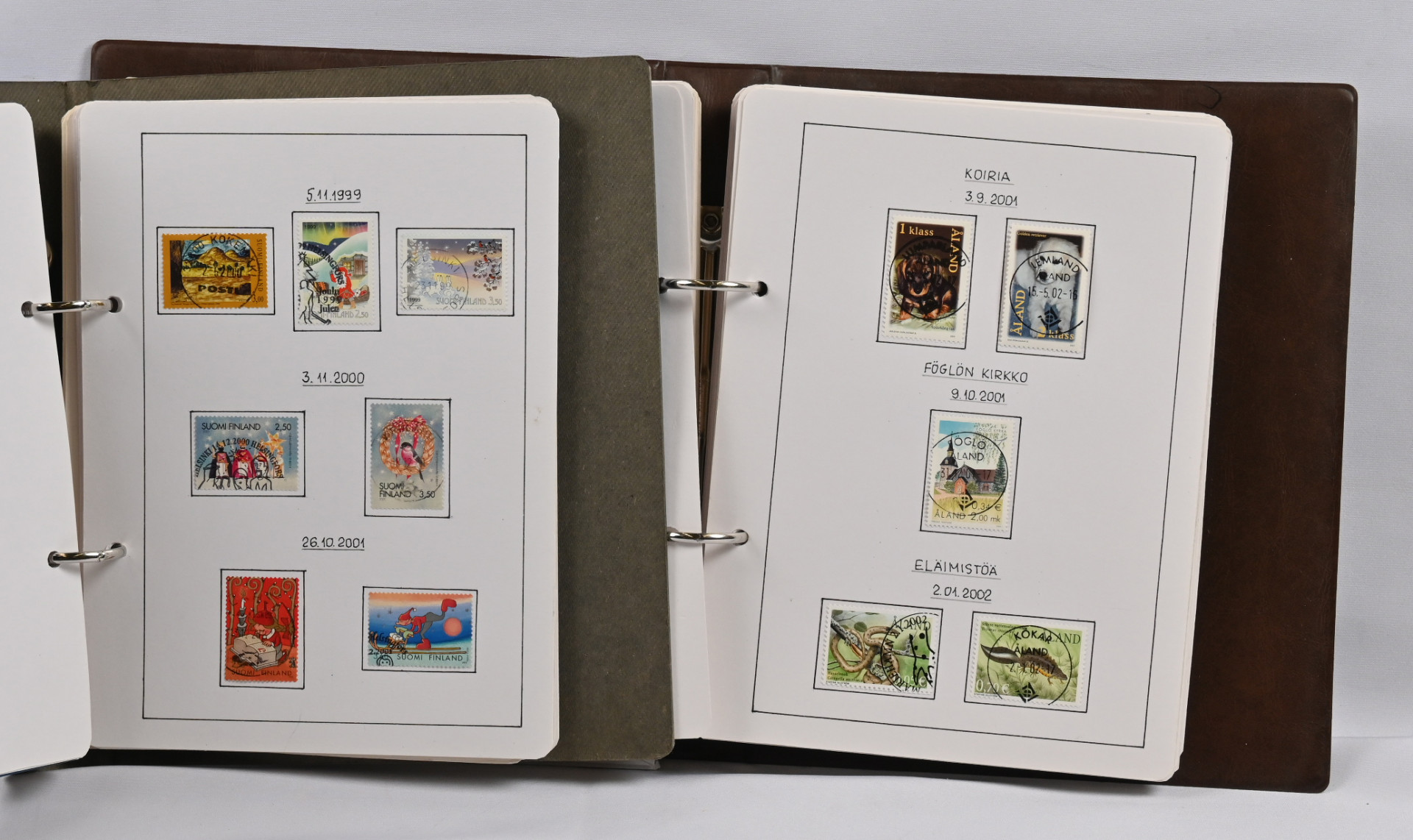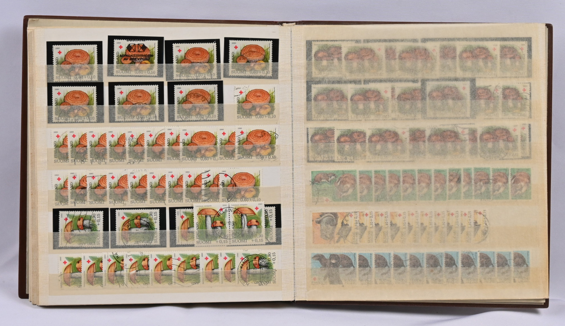 Iso erä suomalaisia merkkejä yli 20 pienikokoisessa säiliökirjassa. Materiaali alkaen 1930 -luvulta mutta pääosin 1960 - 1990-luvuilta. Leimattua ja leimaamatonta, myös Punaista Ristiä ja tuberkuloosia, numerokuusiloita ja -neliöitä ym. ryhmiä, pienoisarkkien ja vihkojen irtomerkkejä, kaunisleimaista ja jopa loistoleimaista, joulumerkkejä ym. Lisäksi kolmessa muussa säiliökirjassa mm. uudempaa leimattua sisältäen euroaikaa, Punaista Ristiä jne. Lisäksi vielä yksi säiliökirja Ahvenanmaata, hiukan kokonaisia arkkeja, Postin Info-lehtiä joissa merkkejä sivujen välissä, laatikollinen leikettä sisältäen uudempaa sekä myös ulkomaita. Tekemistä pitkäksi aikaa!