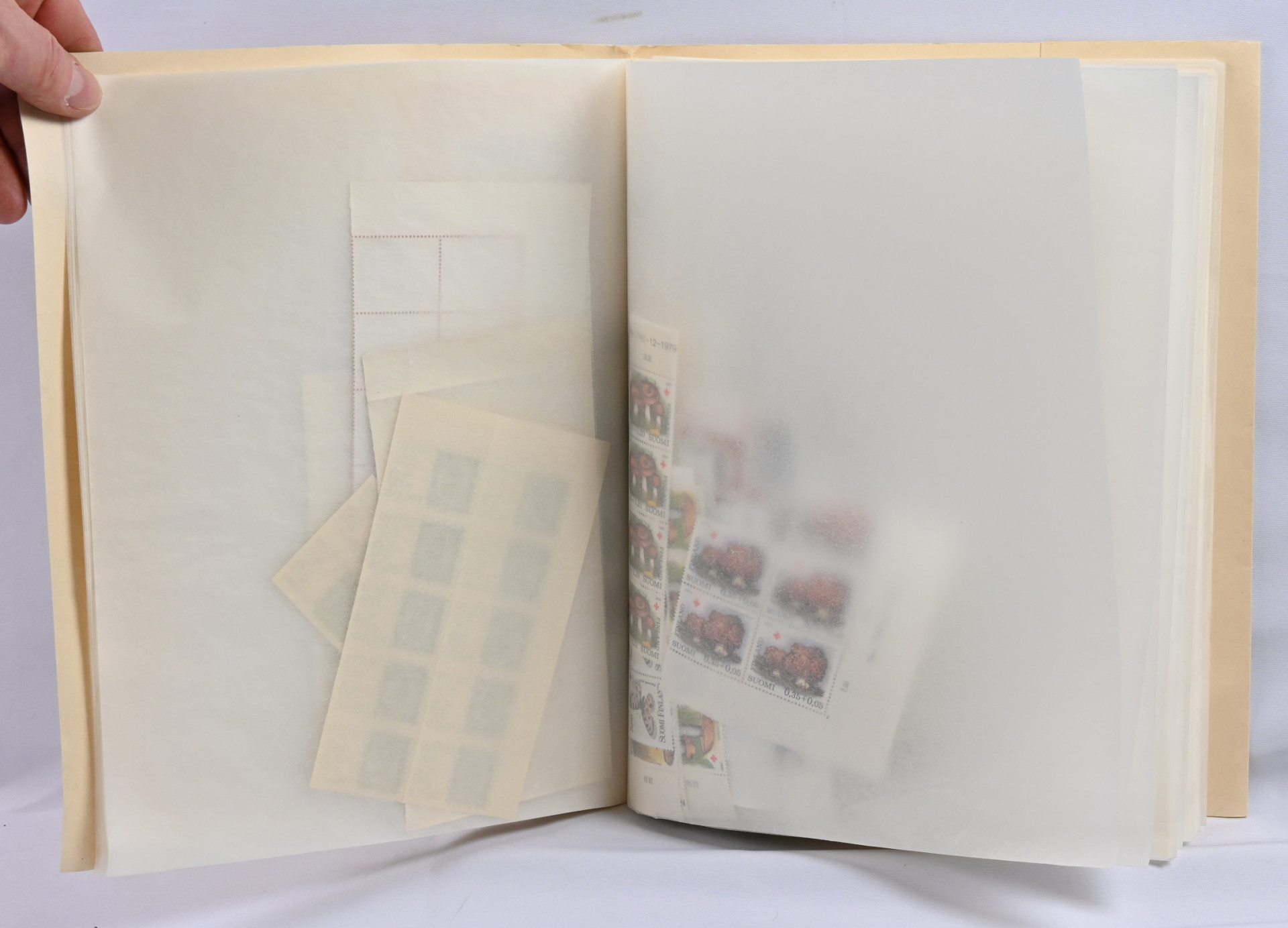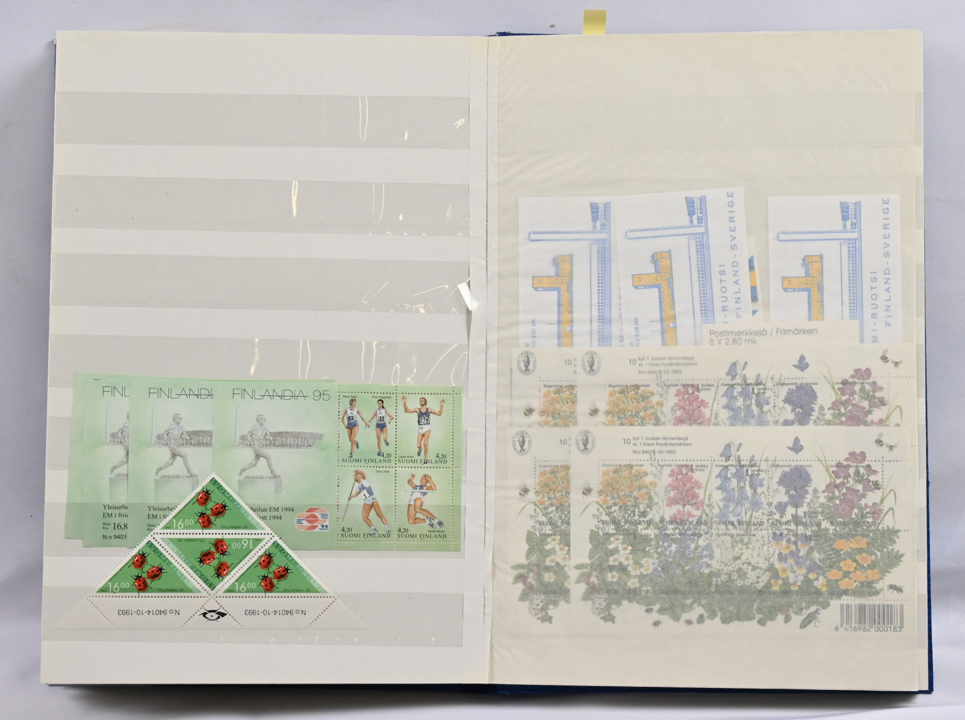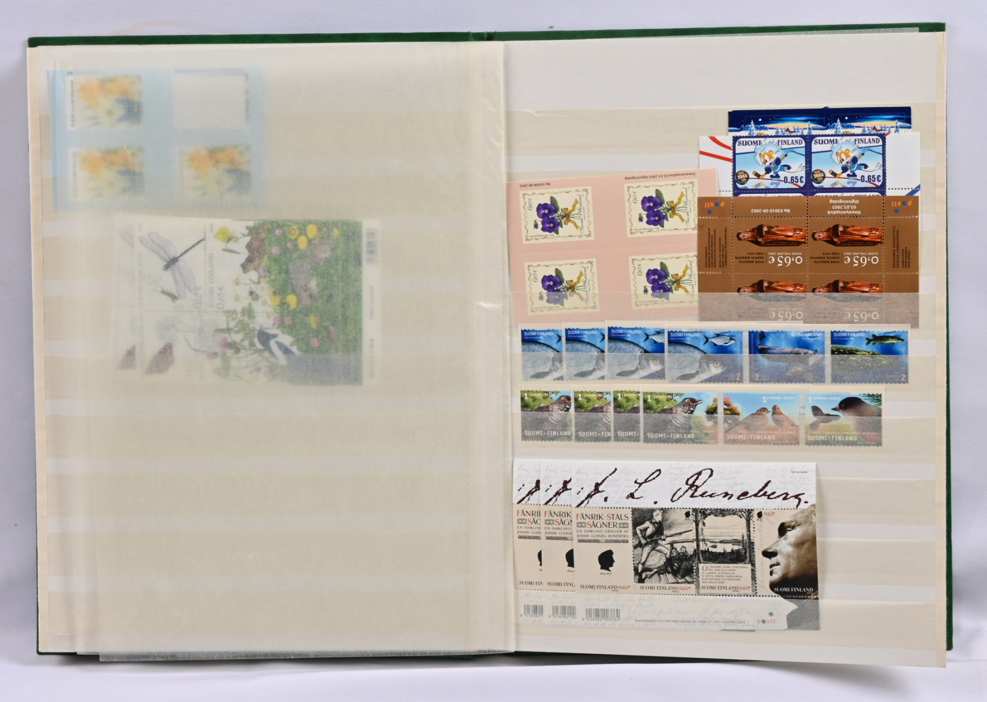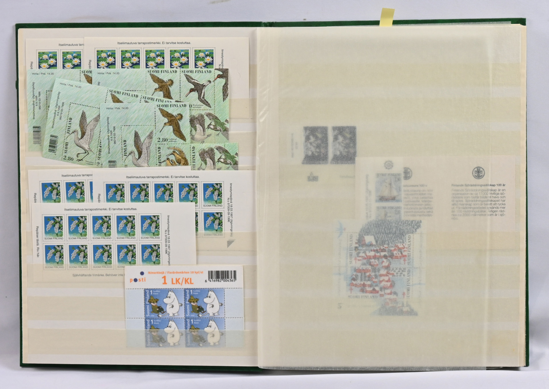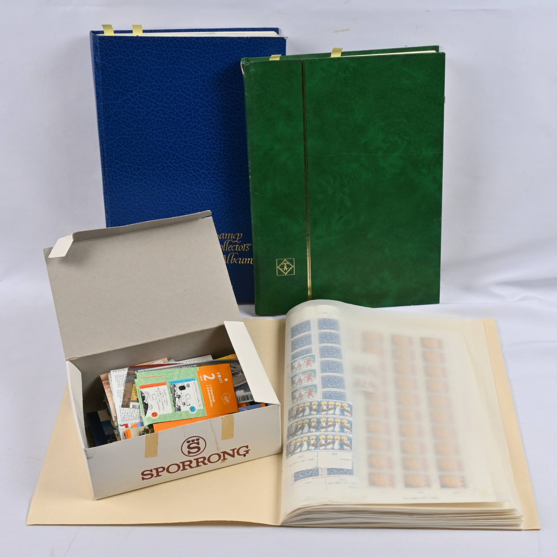 Kahdessa säiliökirjassa sekä arkkimapissa sekalainen erä lähinnä postituoretta ** materiaalia. Pääosin 1980 - 1990-lukujen materiaalia mutta myös vanhempaa ja uudempaa sisältäen merkkejä, ryhmiä, pienoisarkkeja, vihkoja. Lisäksi iso nippu lähinnä markka-ajan vihkoja pienessä laatikossa. Yhteensä yli 200 postituoretta ** ikimerkkiä sekä myös muita arvoja, kolmiomerkkejä jne.