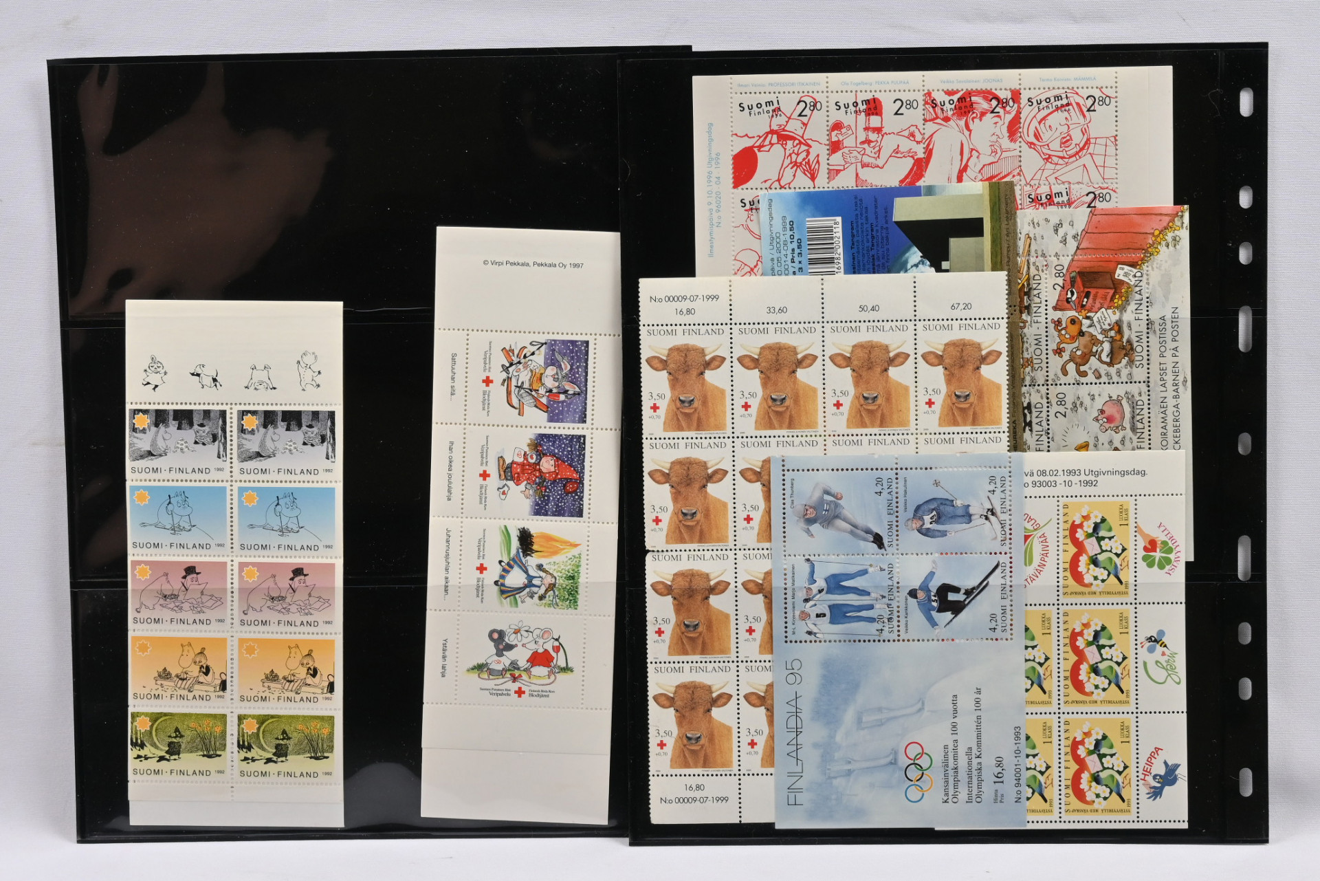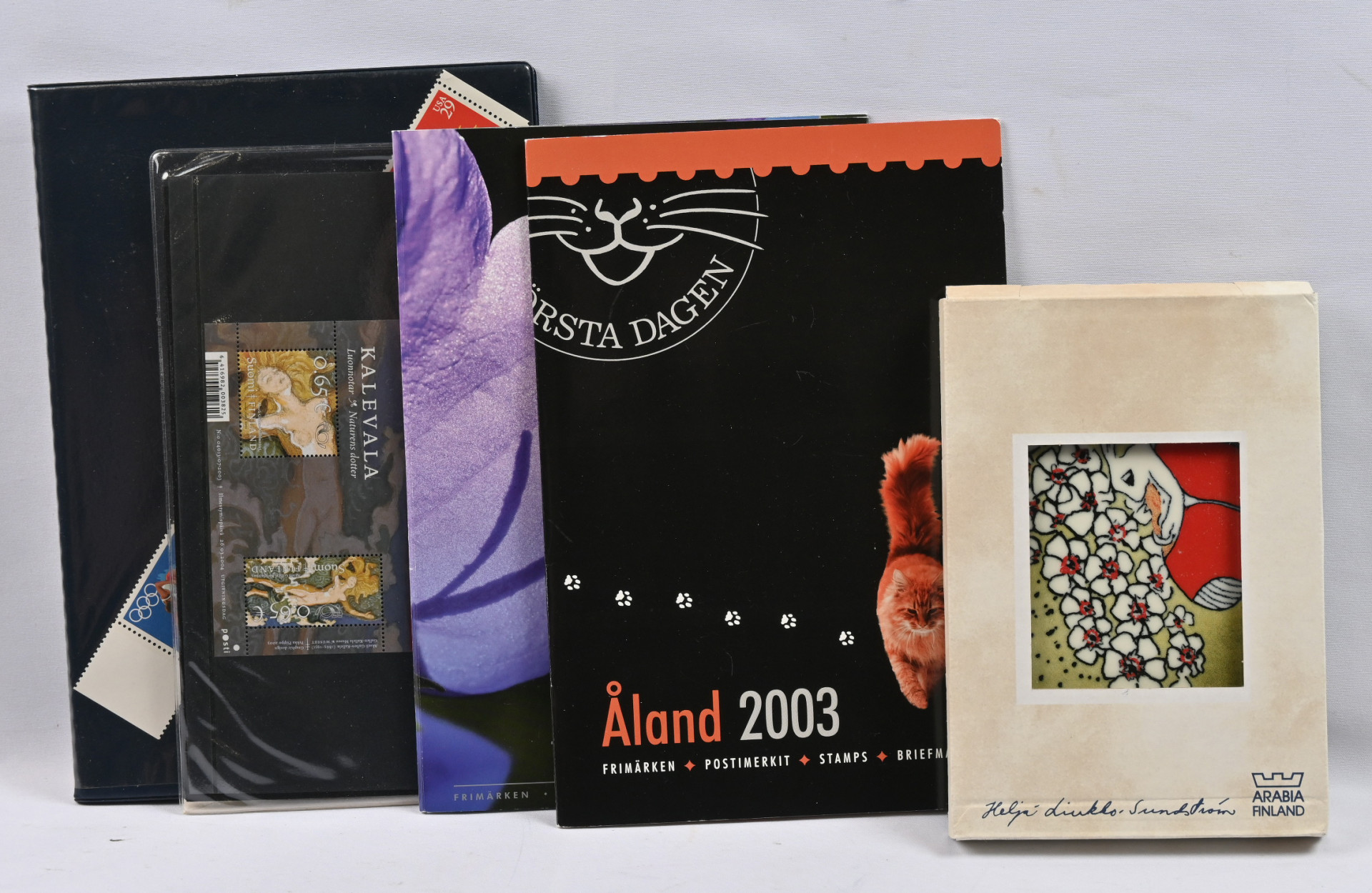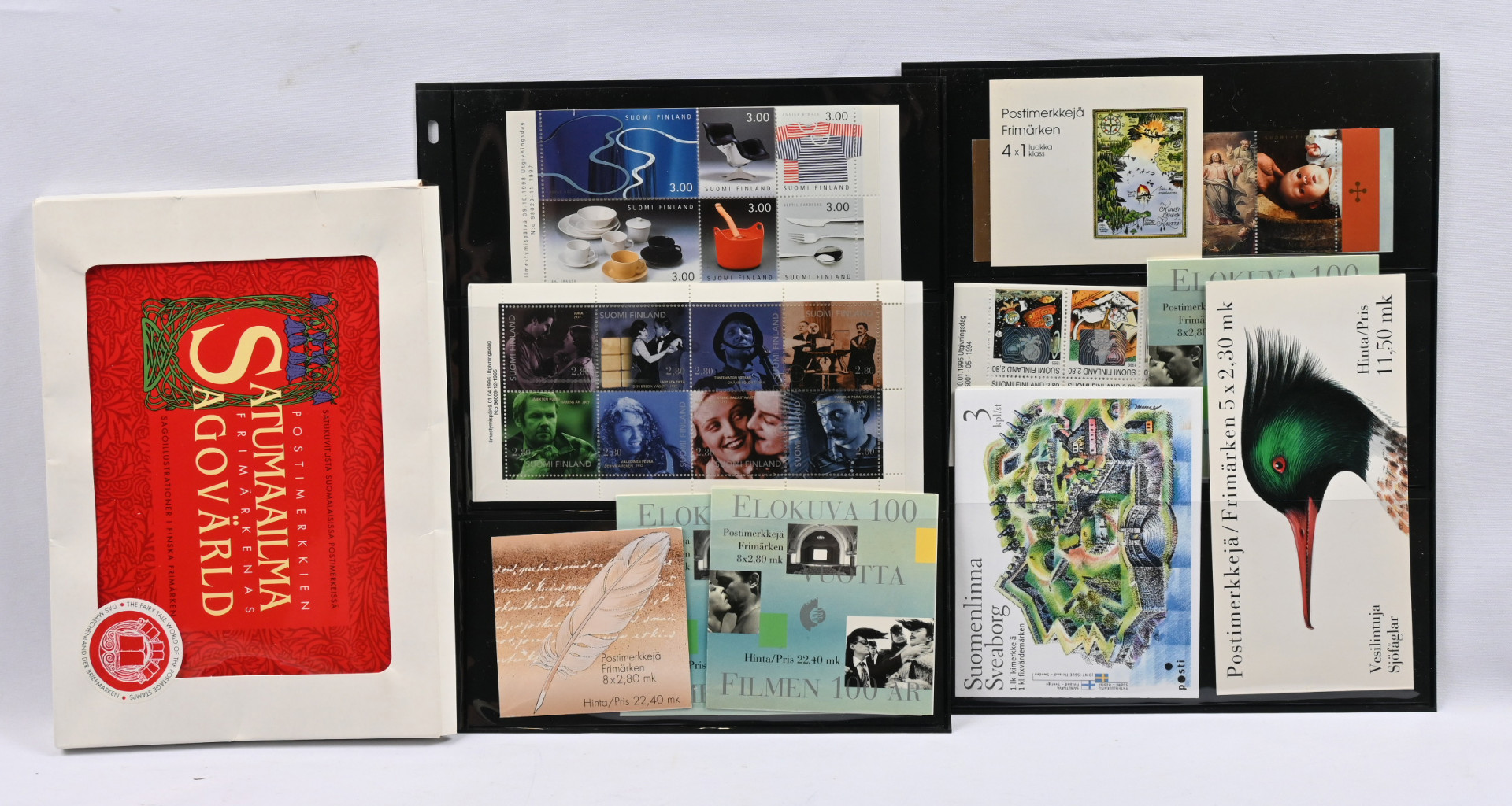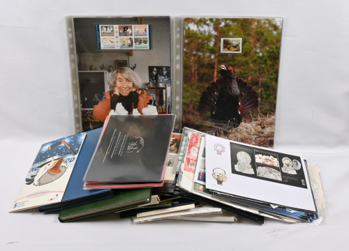 Kiintoisa erä erilaisia lajitelmia ym materiaalia laatikossa mm. numeroituja pienoisarkkeja, Finlandia 2017 vihko, joku ulkomainen myös