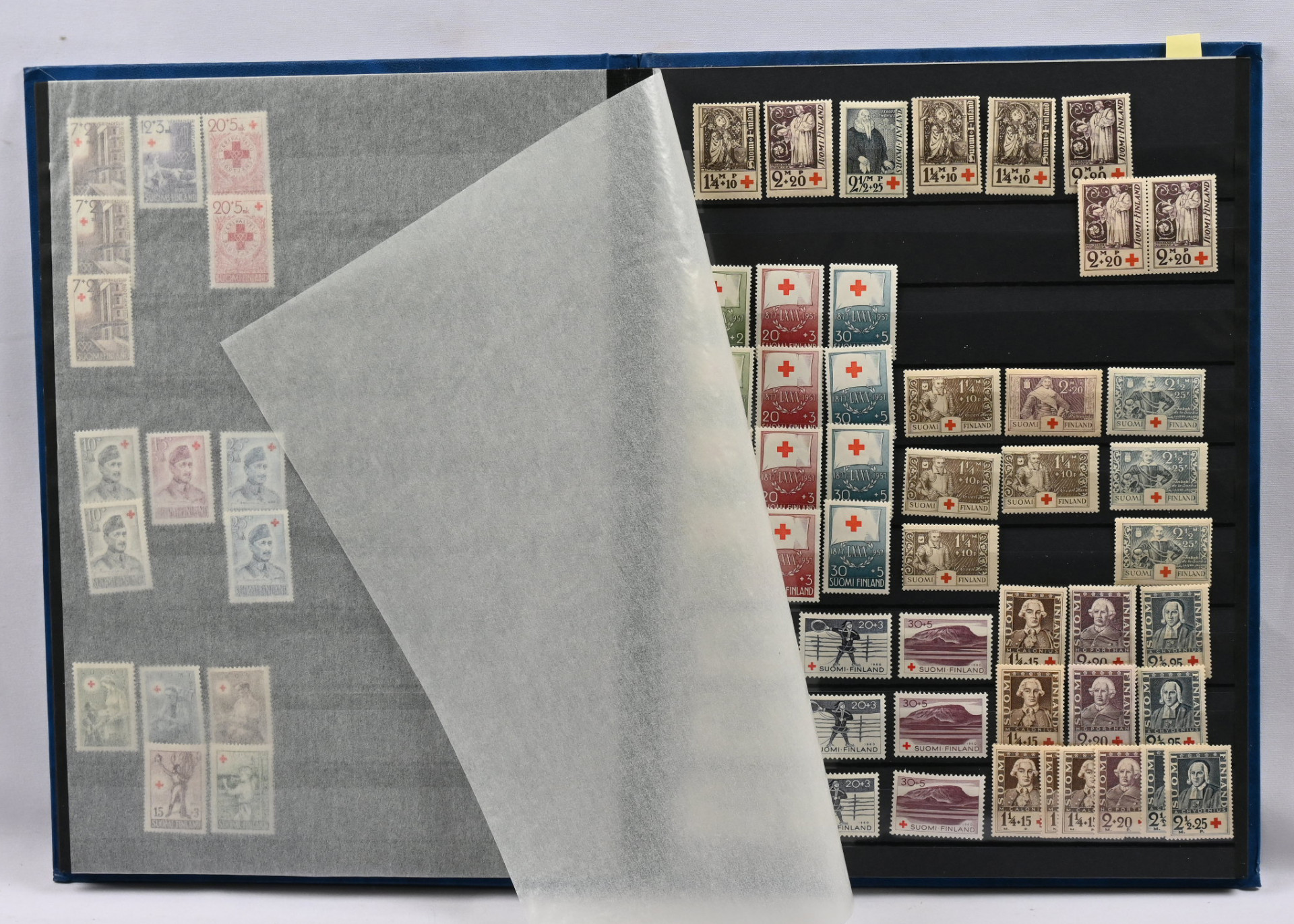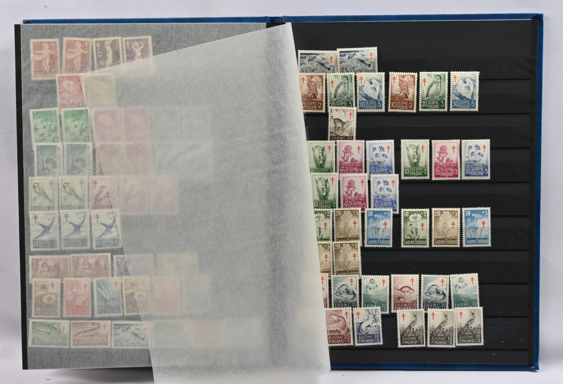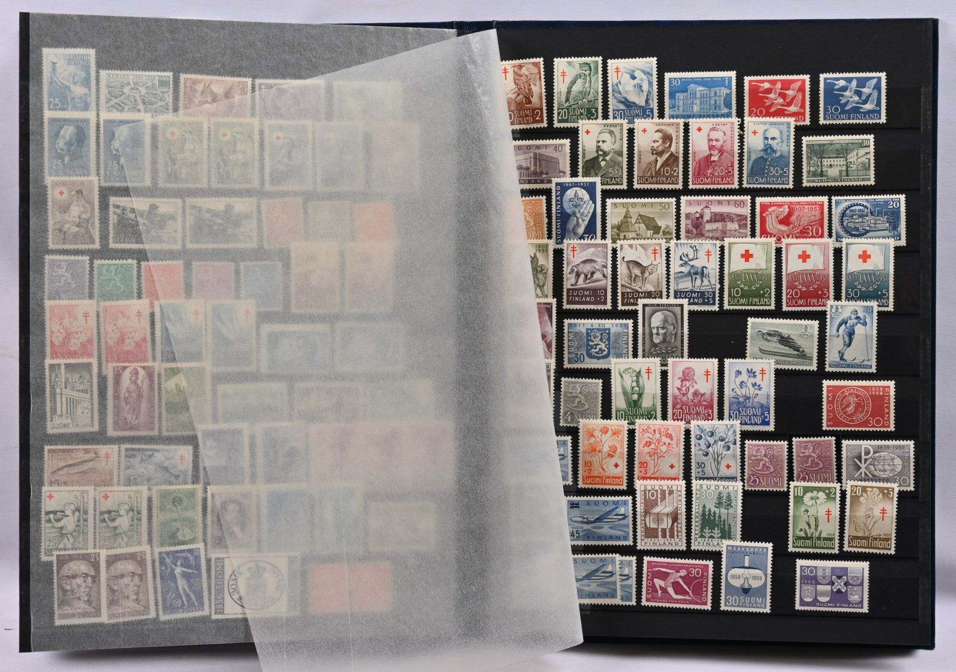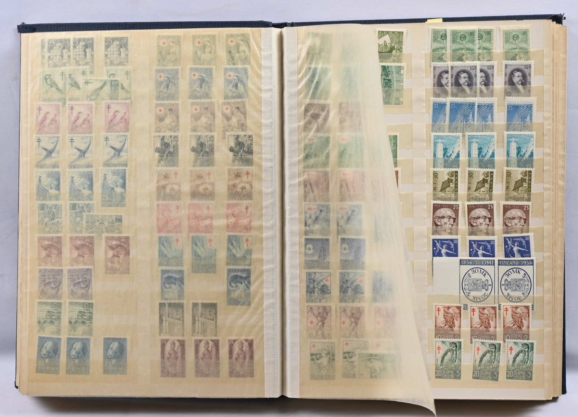 m/89 alkaen kuudessa säiliökirjassa varastoerä lähinnä postituoretta ** materiaalia käyttösarjoja, juhlaa, Punaista Ristiä, Ahvenanmaata jne