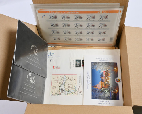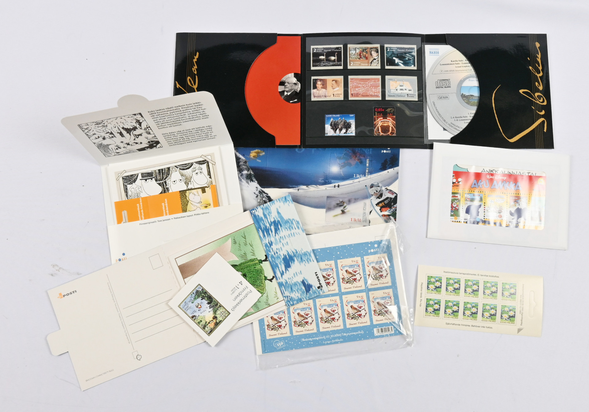 Postituoreita ** ikimerkkejä n. 120 kappaletta mm. Postin teemalajitelmissa seka arkkeina, myös hiukan muuta euromateriaalia. Mukana mm. Ilmaveivi 2 kokonaista arkkia, kaksi numeroitua pienoisarkkia jne. Lisäksi pieni nippu taskullisia Davon Suomi-sivuja vuosituhannen vaihteesta sekä pieni nippu isokokoisia kuoria lähinnä 1980-luvun merkein kauniisti leimattuina