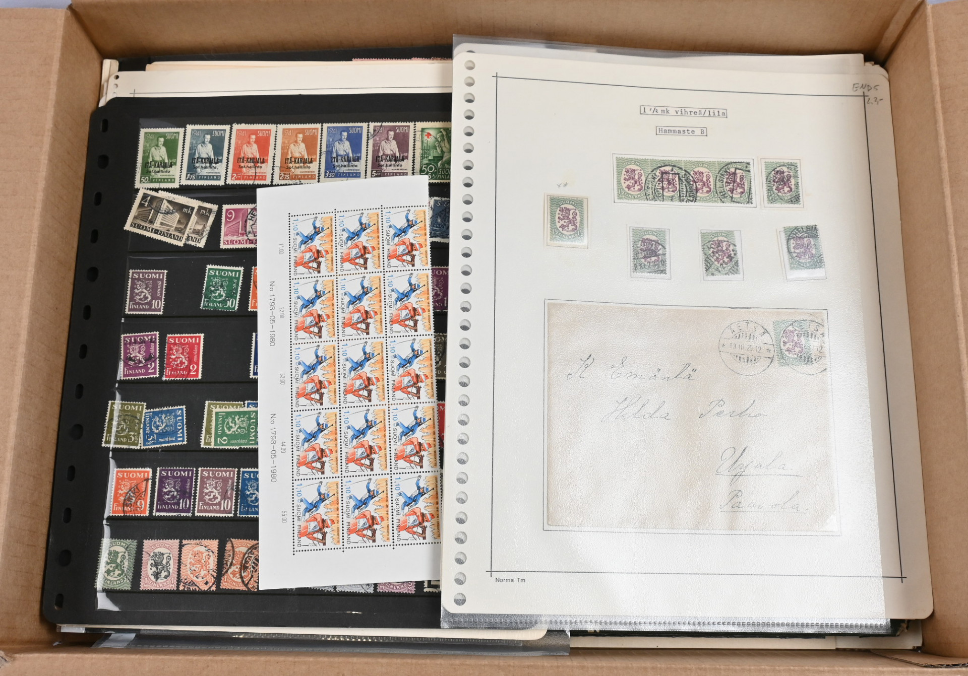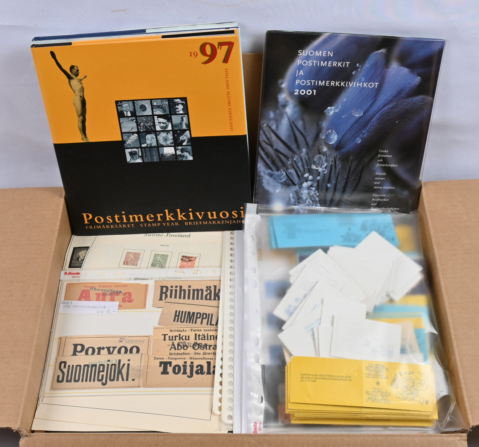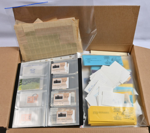Sekalainen erä 6 KG laatikossa. Kohtalainen jäännöskokoelma, materiaalia lehdillä ja säilytyskorteilla, AV-vihkoja, vähän ikimerkkejä ym.