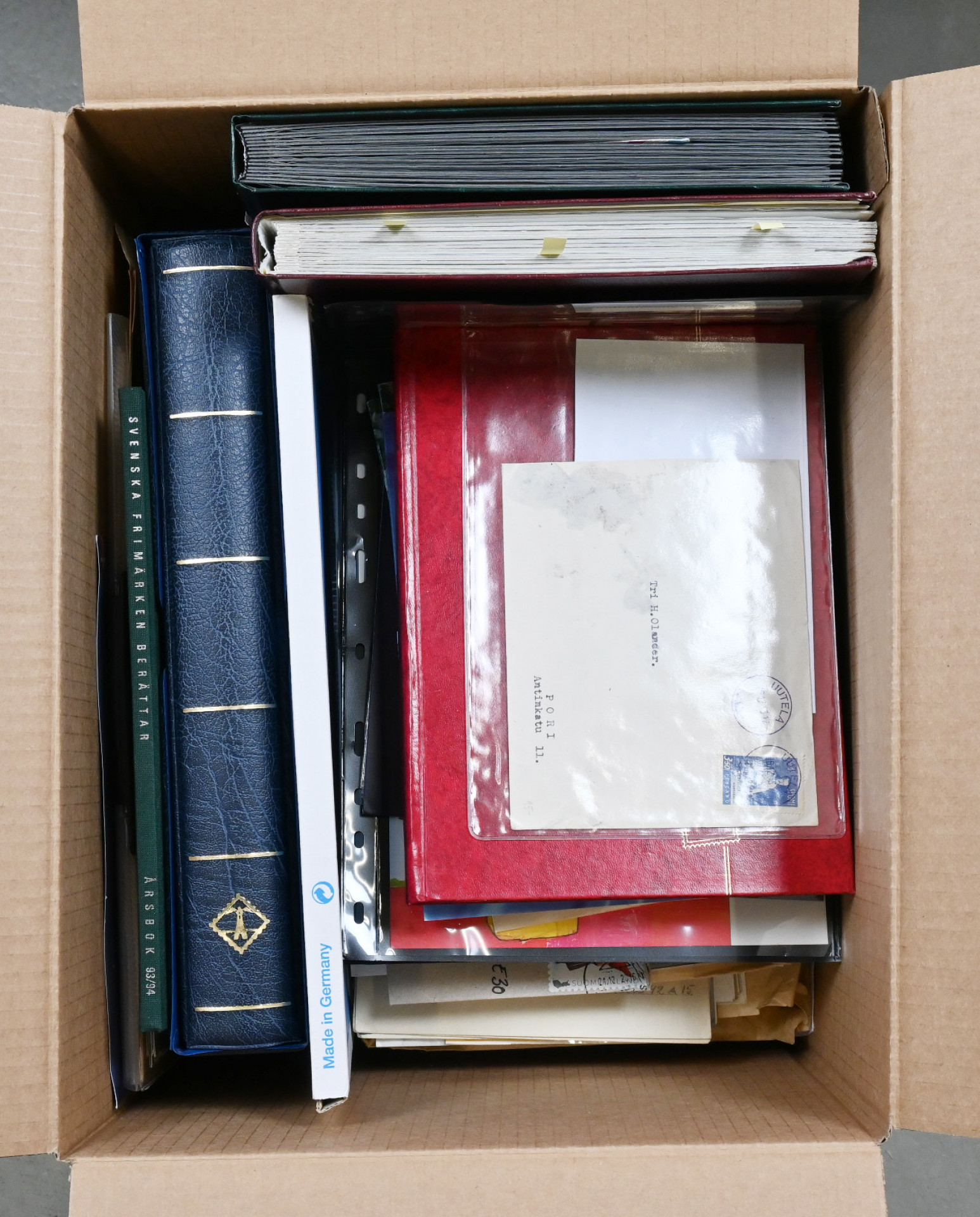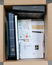 Sekalainen materiaali lähinnä Suomea, myös hiukan ulkomaita yht. 10 KG laatikossa. Mukana mm. merkkejä, postilähetyksiä, FDC-kuoria, erikoisleimoja, leikettä, Suomen postimerkkien käsikirja V, tyhjä varastokansio jne. Tutkimista ja lajittelemista