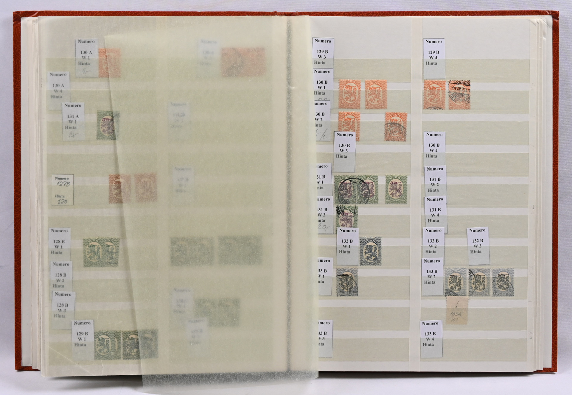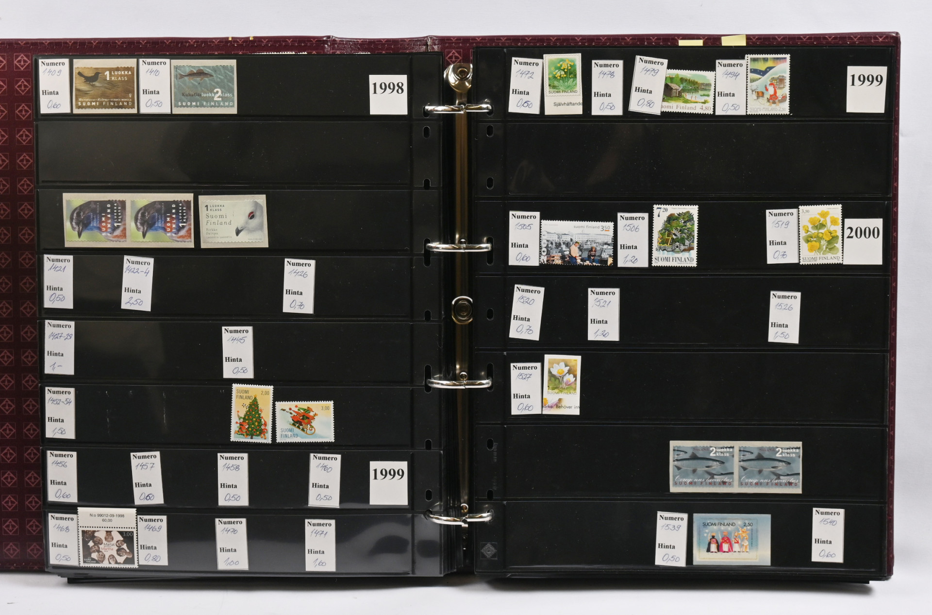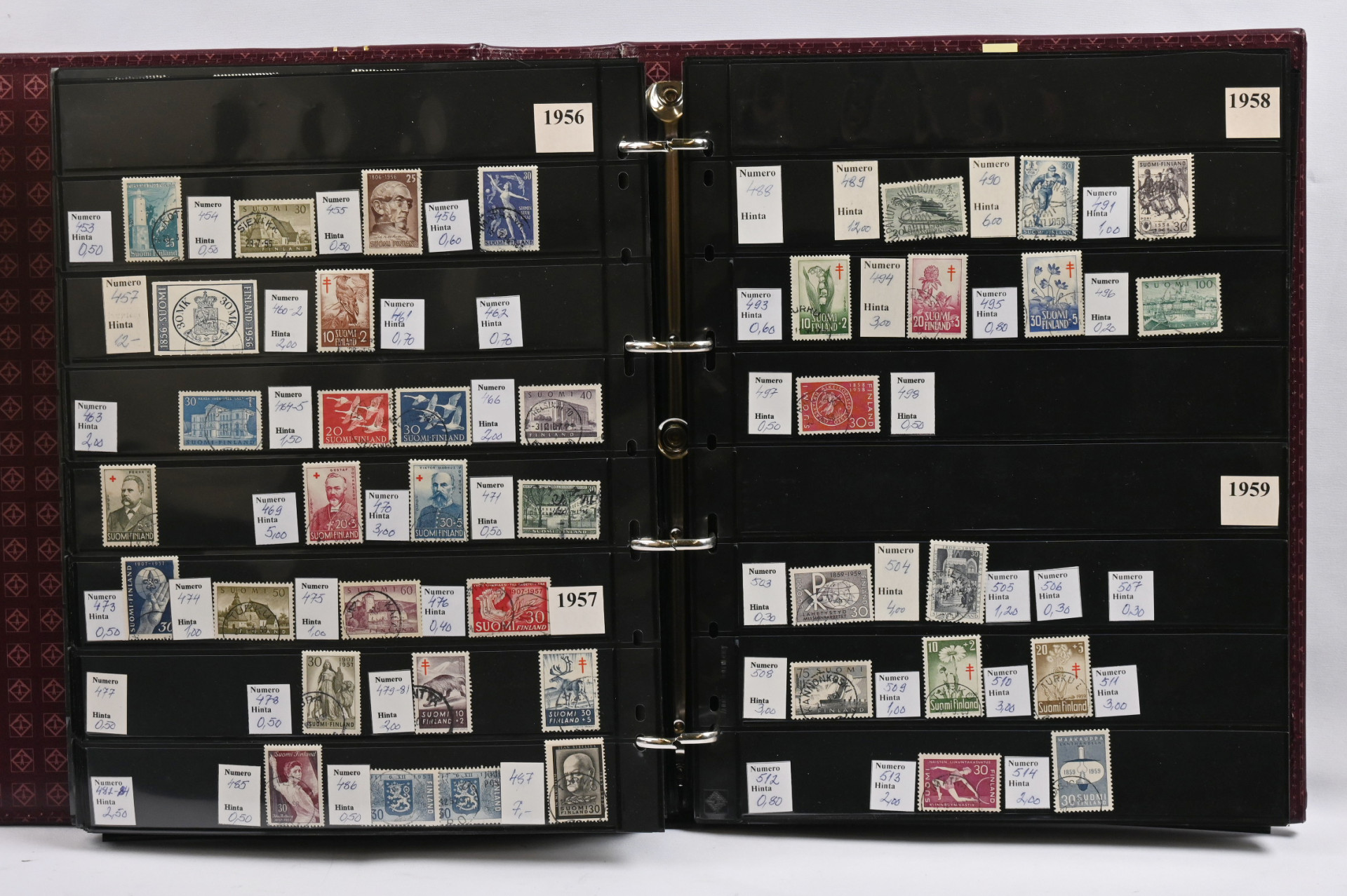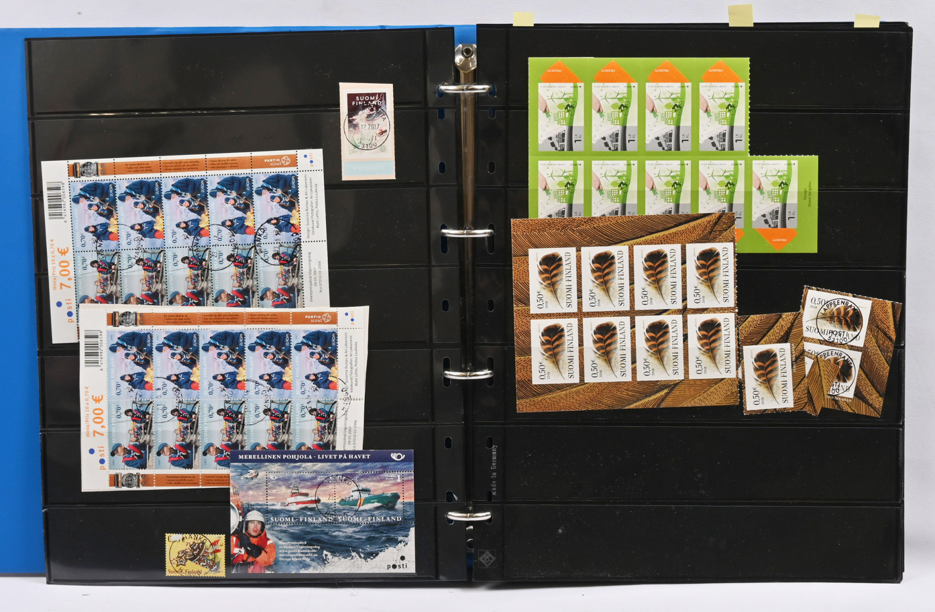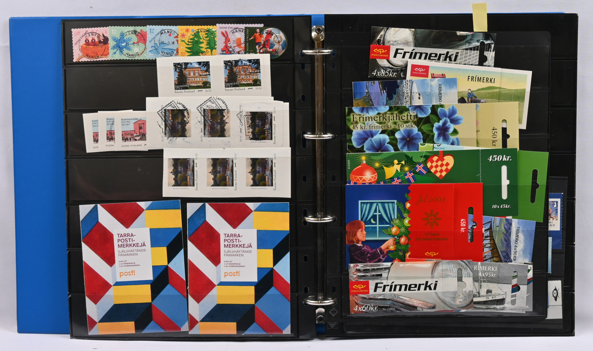 Viidessä kansiossa varastomateriaalia vanhasta uuteen leimattua ja postituoretta ** myös euroarvoisia merkkejä. Lisäksi hiukan ulkomaita