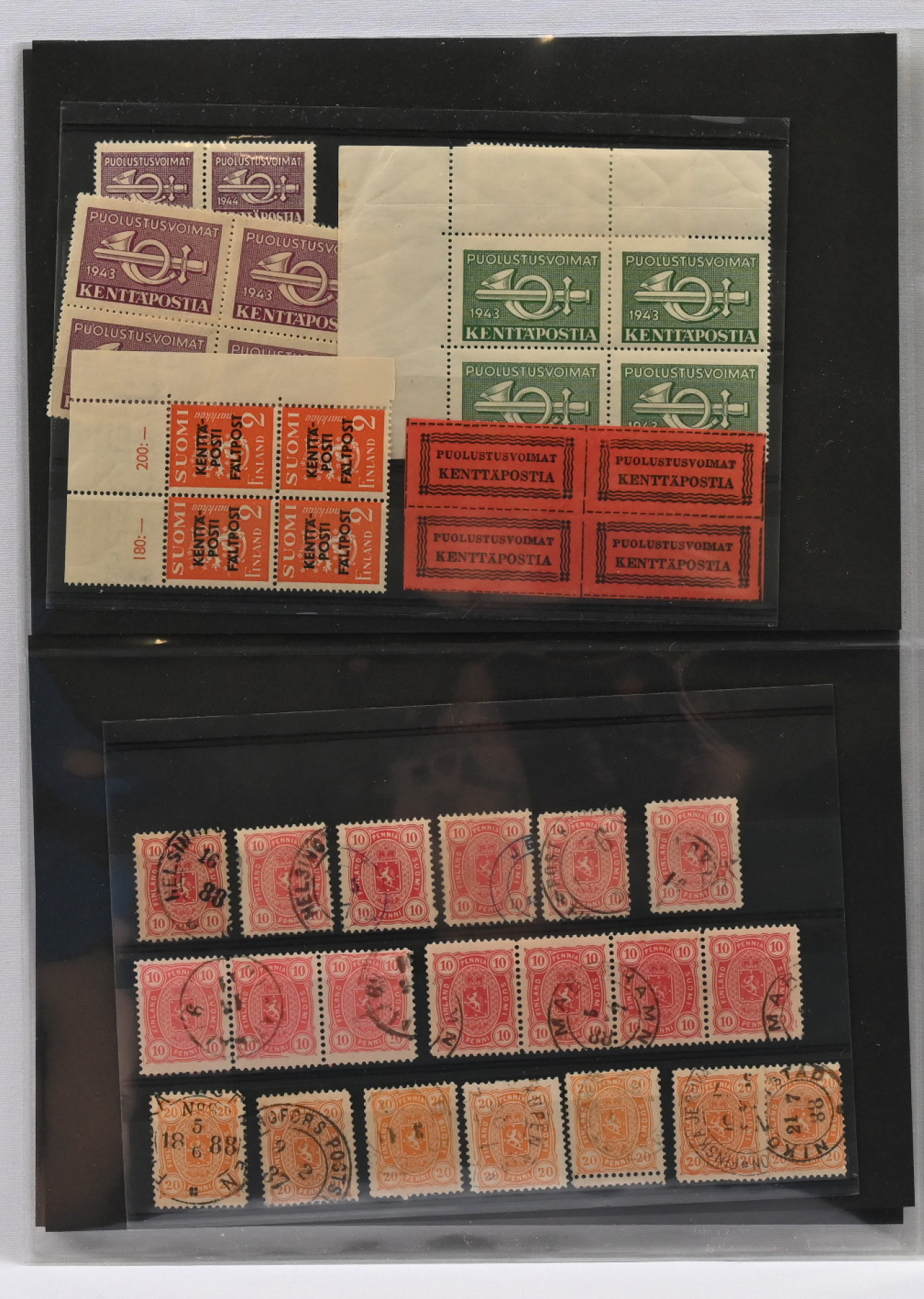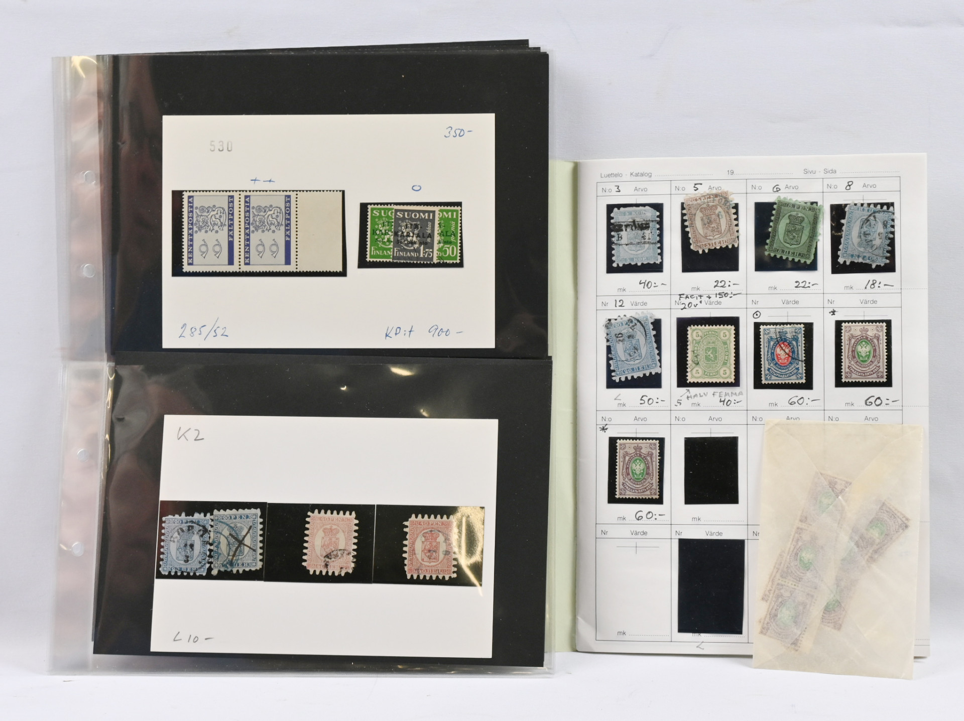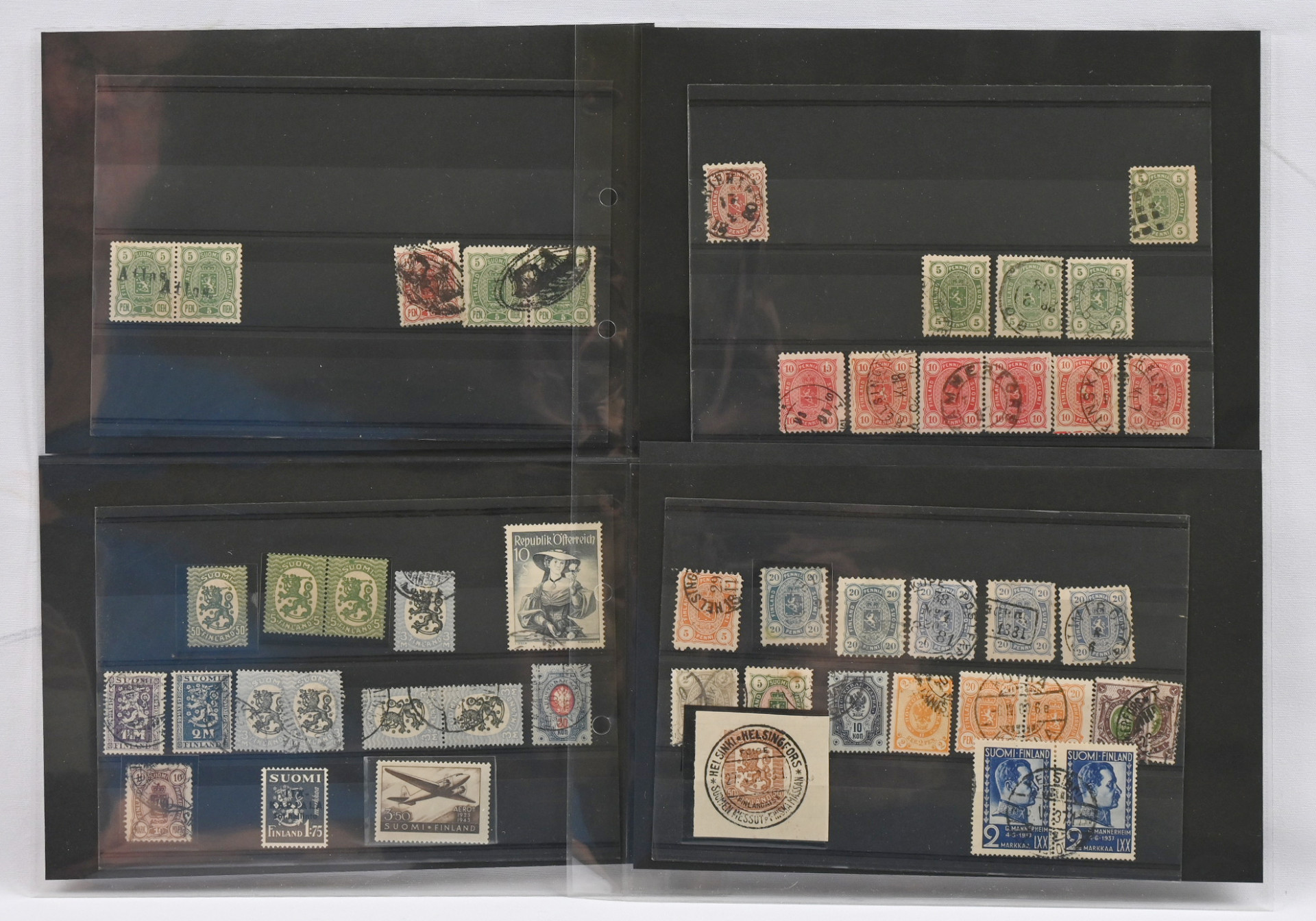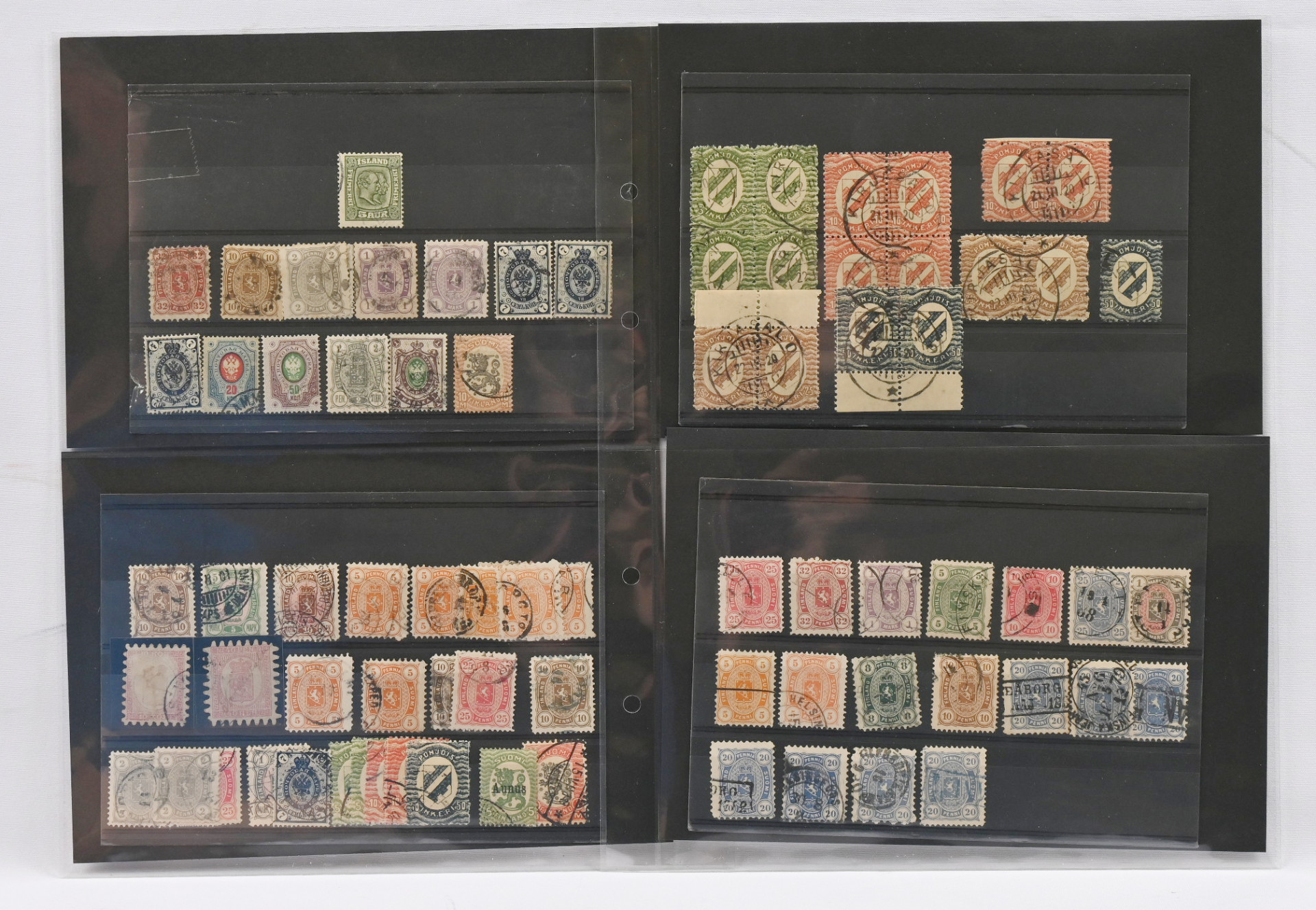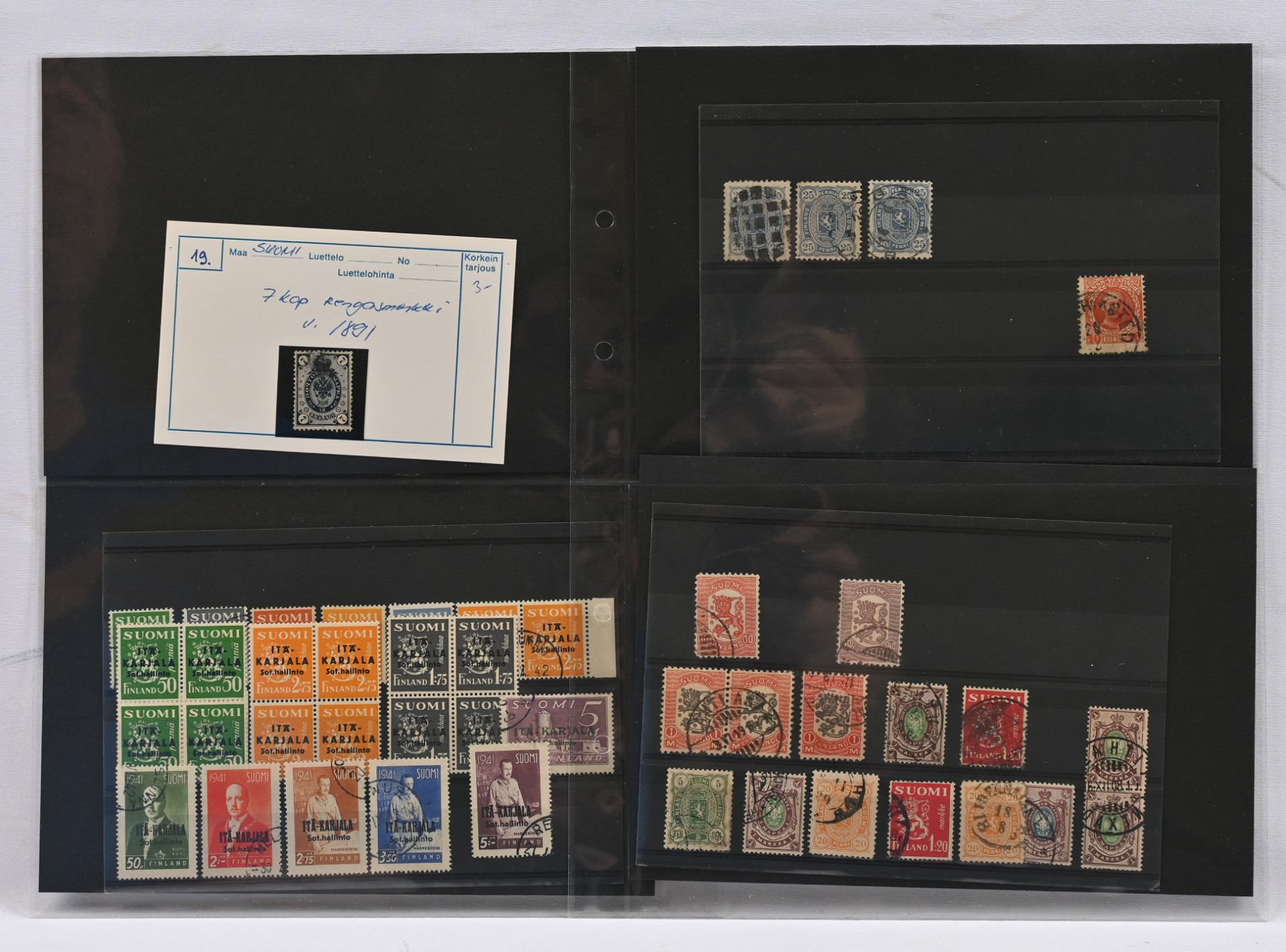 1860 alkaen pieni sekalainen kiintoisa erä Suomea varastokorteilla ym., mm. isohampaisia (vikaa), 1875 - 1882 merkkejä 1 markkaan asti, 1889 5 markan ja 10 markan merkkejä, 1891 rengasmerkkejä, Itä-Karjalaa, Pohjois-Inkeriä, Kenttäpostia mm. 1963 postituore ** pari, kiintoisia leimoja jne.