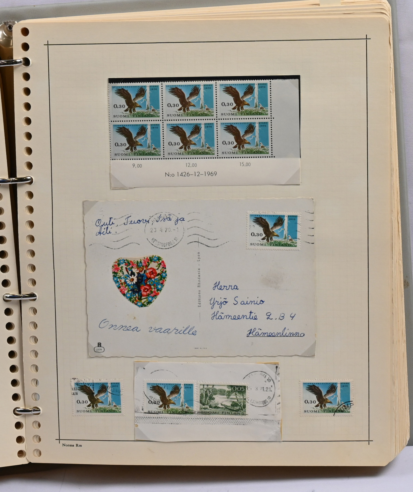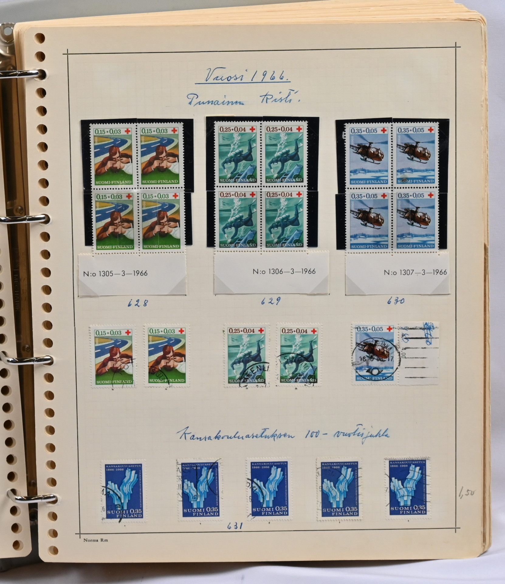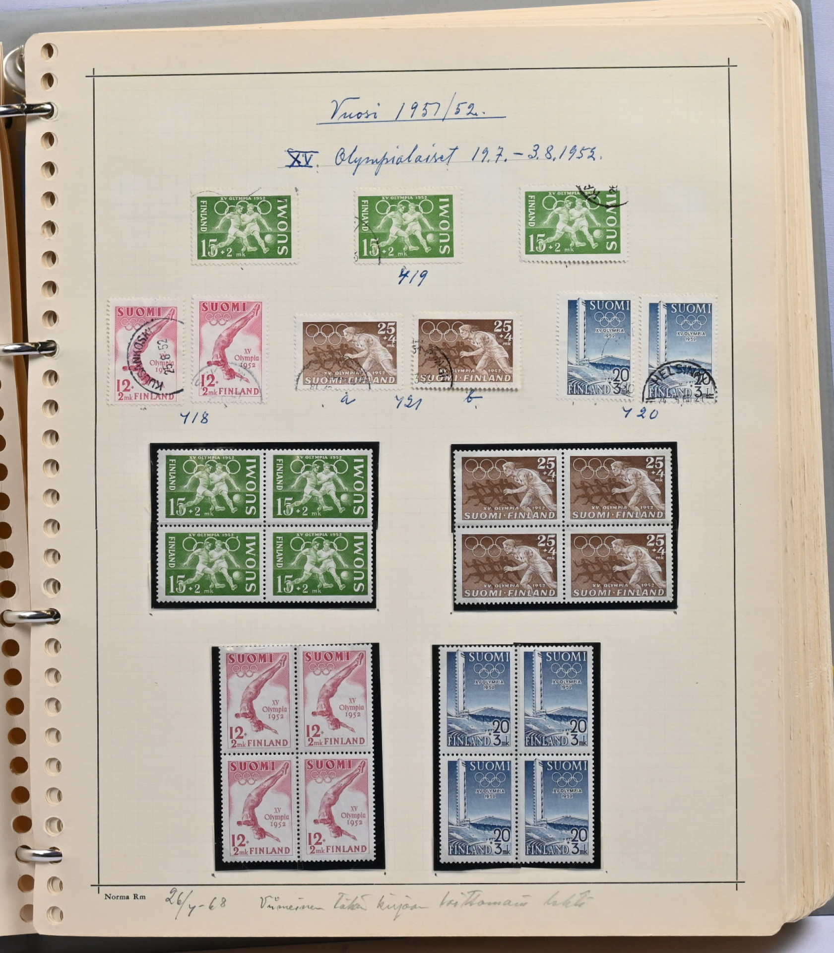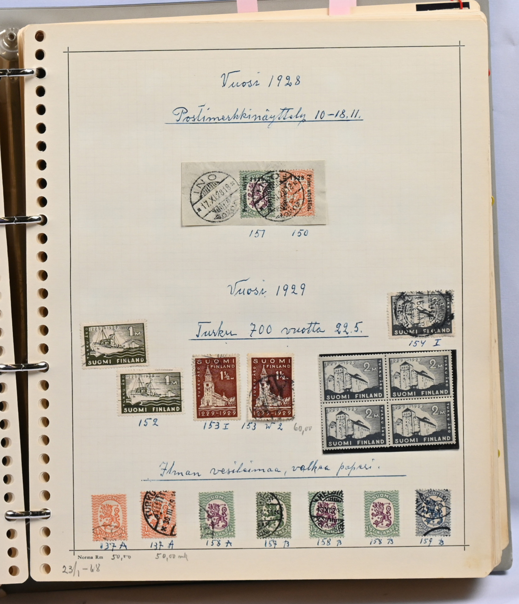1866 - 1971 vanha **/*/o kokoelma neljässä kansiossa. Erittäin runsas materiaali. Paljon leimattuja kaksoiskappaleita, postilähetyksiä (paljon firmakuoria), postituoreita nelilöitä ym. Ei kalliita merkkejä, mutta mm. Vaasa 5 markkaa, Zeppelin ** ym