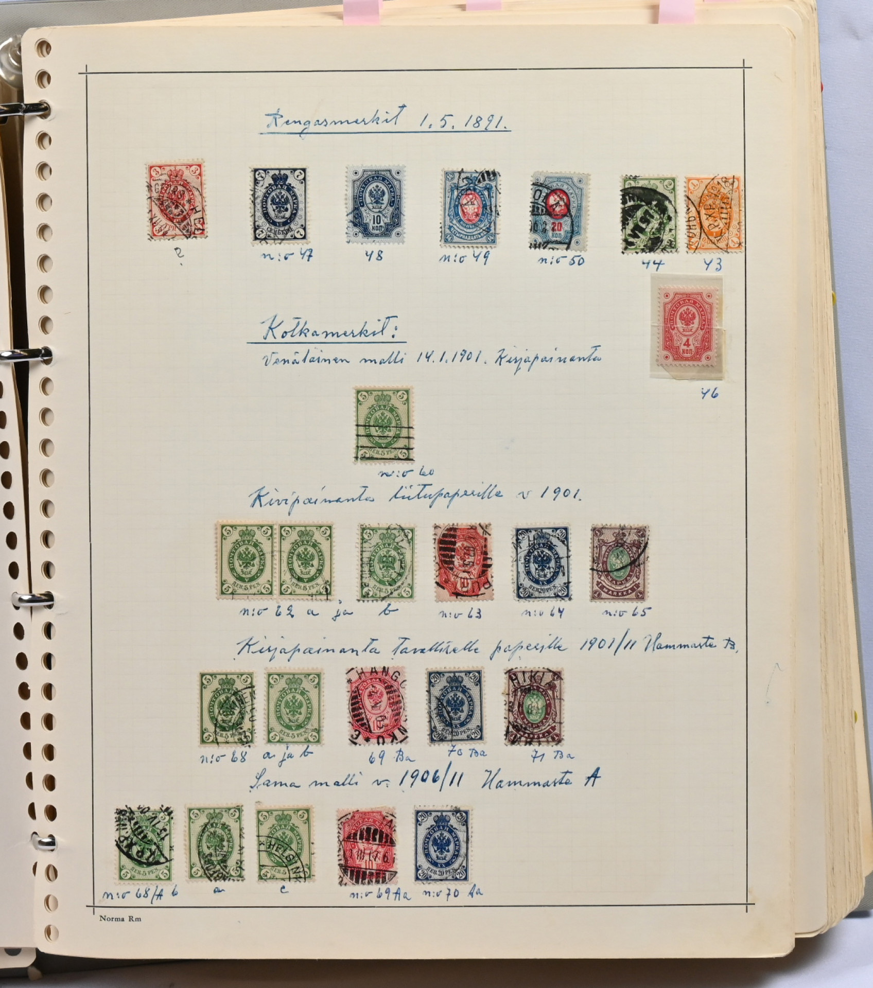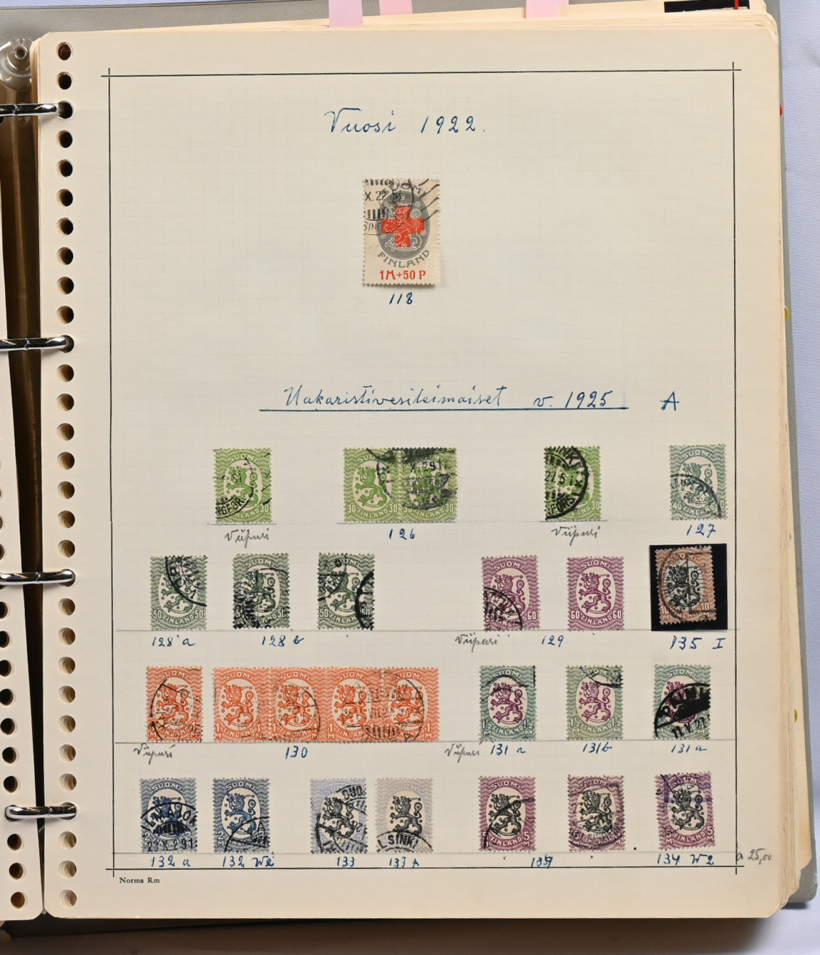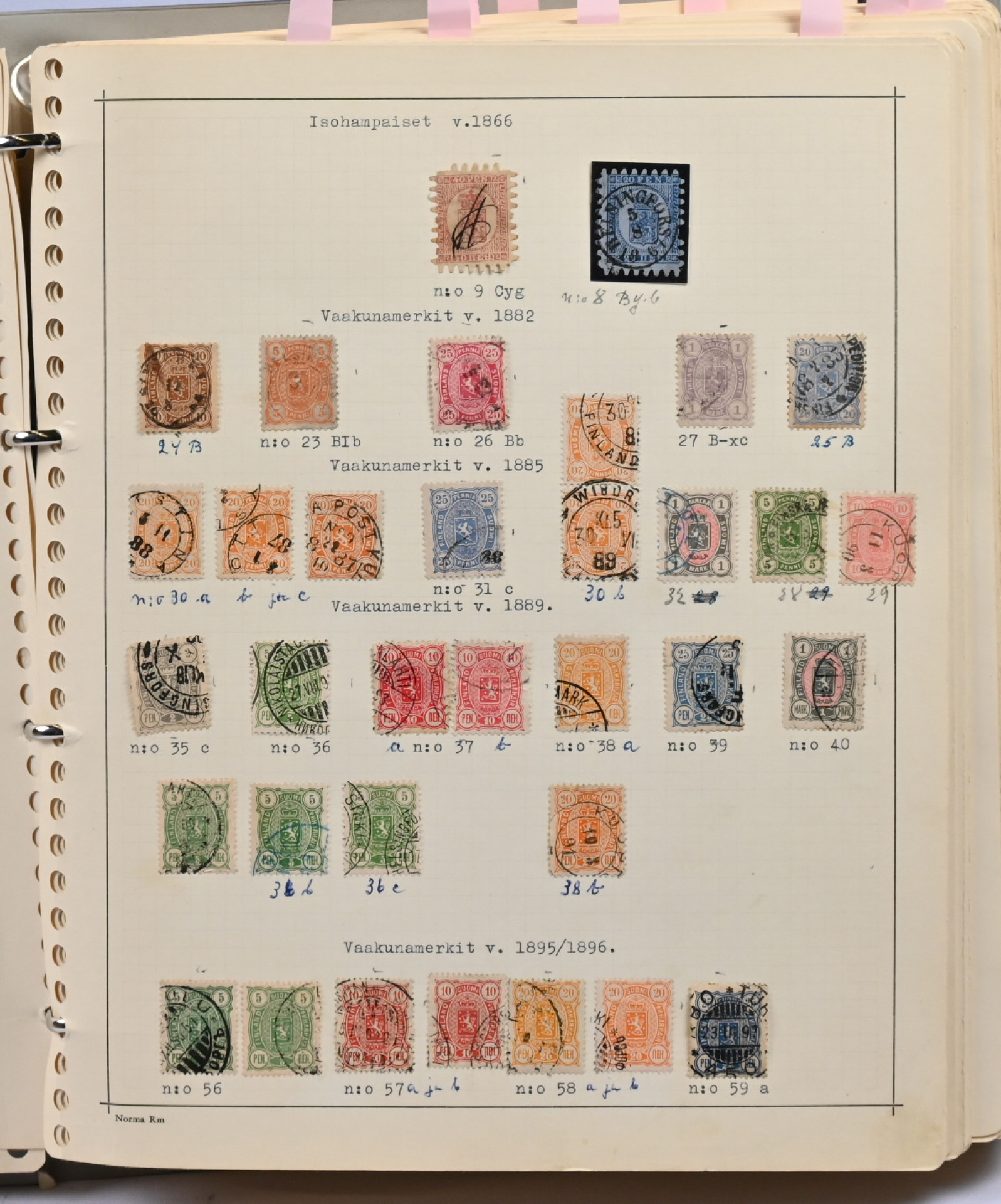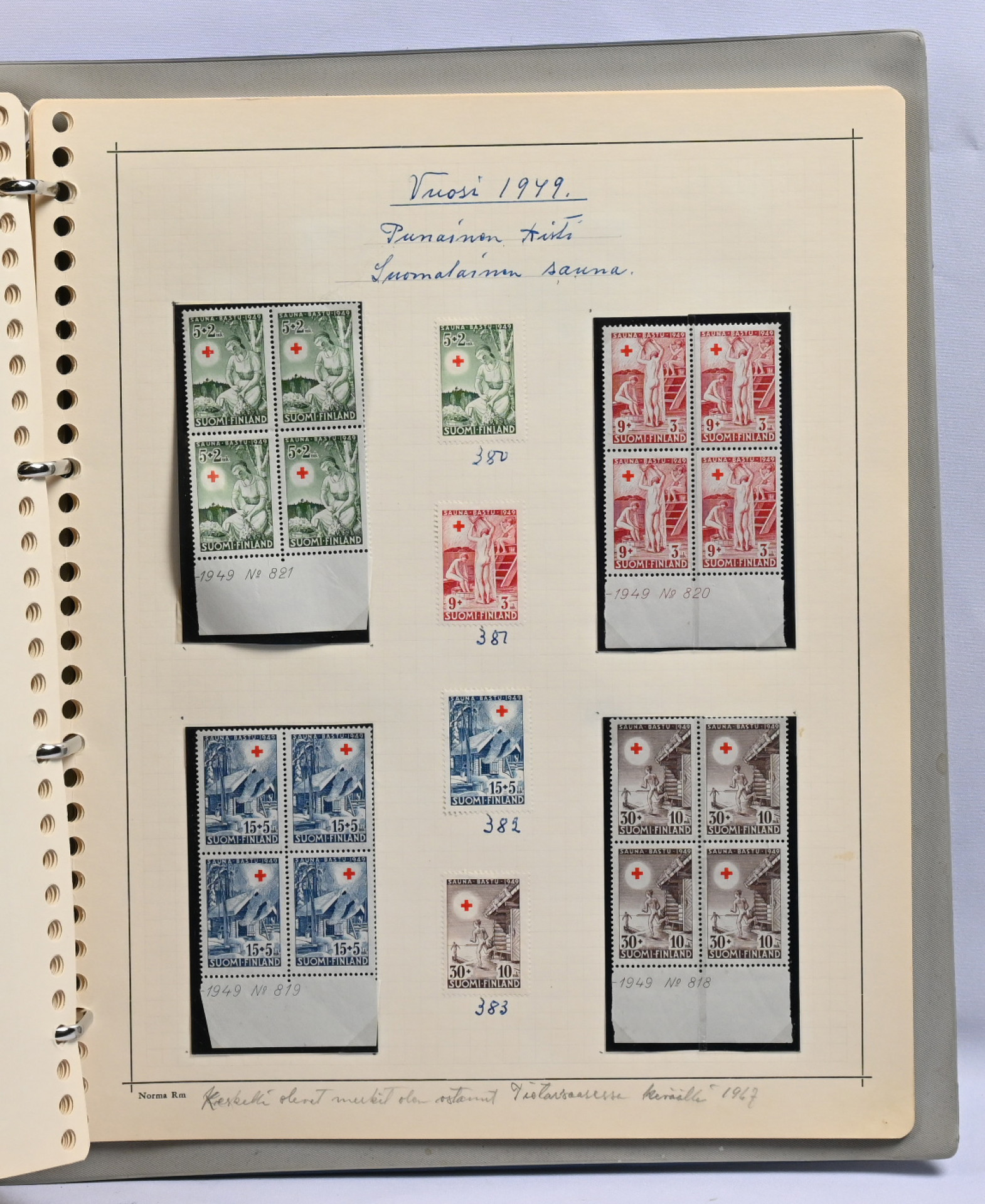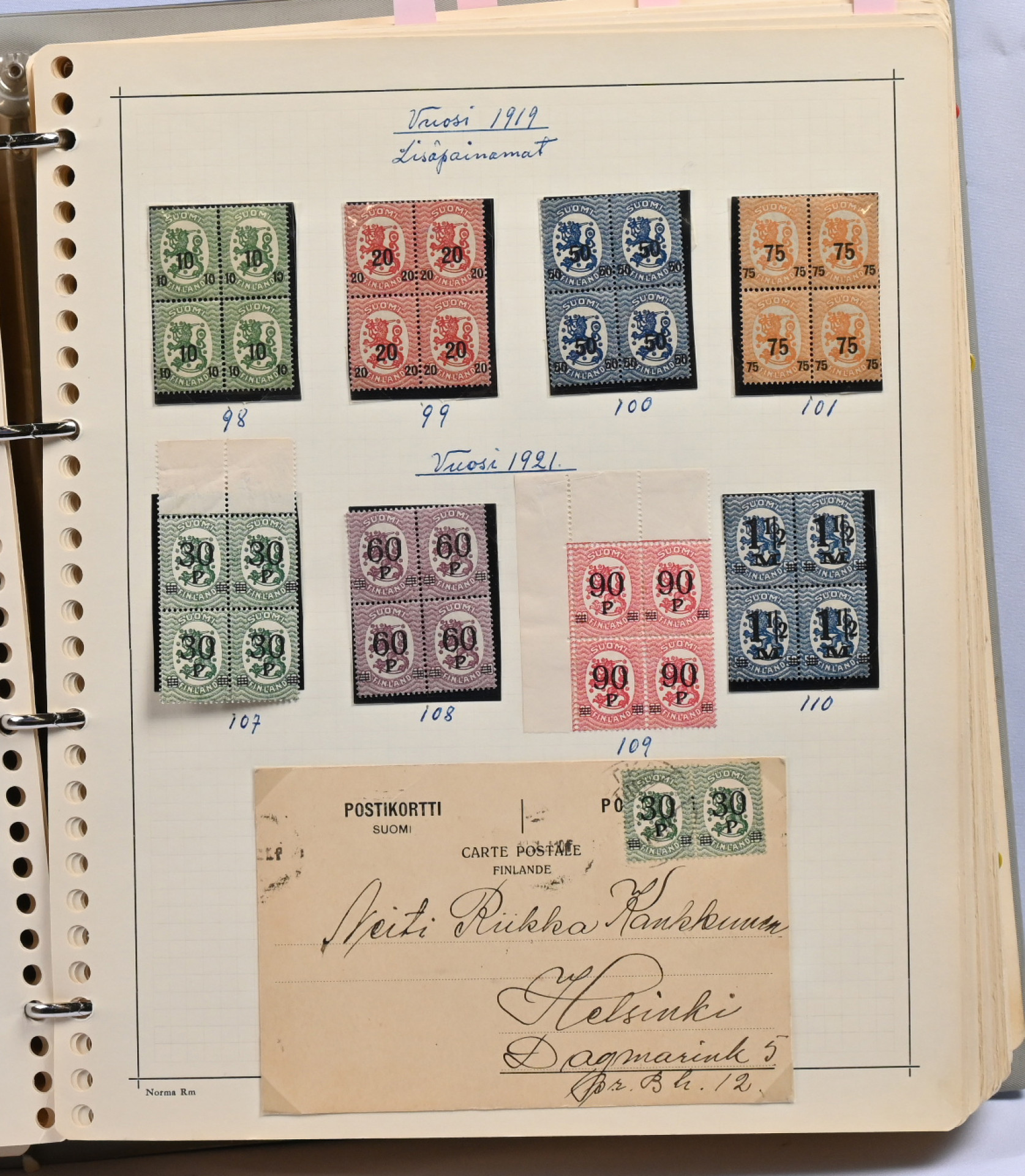 1866 - 1971 vanha **/*/o kokoelma neljässä kansiossa. Erittäin runsas materiaali. Paljon leimattuja kaksoiskappaleita, postilähetyksiä (paljon firmakuoria), postituoreita nelilöitä ym. Ei kalliita merkkejä, mutta mm. Vaasa 5 markkaa, Zeppelin ** ym