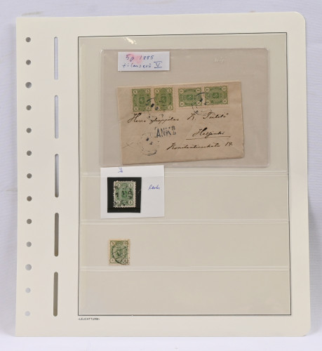 1885 5 pennistä 1 markkaan kokoelmaerä merkkejä ja joku lähetys mm. leimoja kuten kuvioleimoja ja ryhmiä ym
