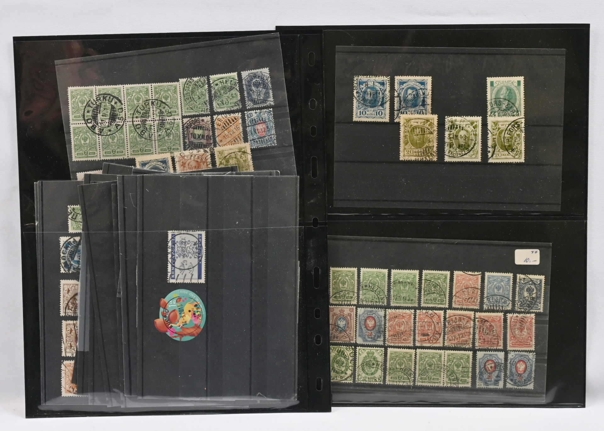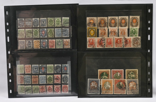 Suomessa käytettyjä venäläisiä hieno erä levyillä mm. loistoja ja hyviä merkkejä kuten 70 kop, 7 ruplaa ym. Mukana myös levyillä muuta materiaalia mm. 1963 kenttäpostimerkki sekä nippu m/11-m/30 lähetyksiä