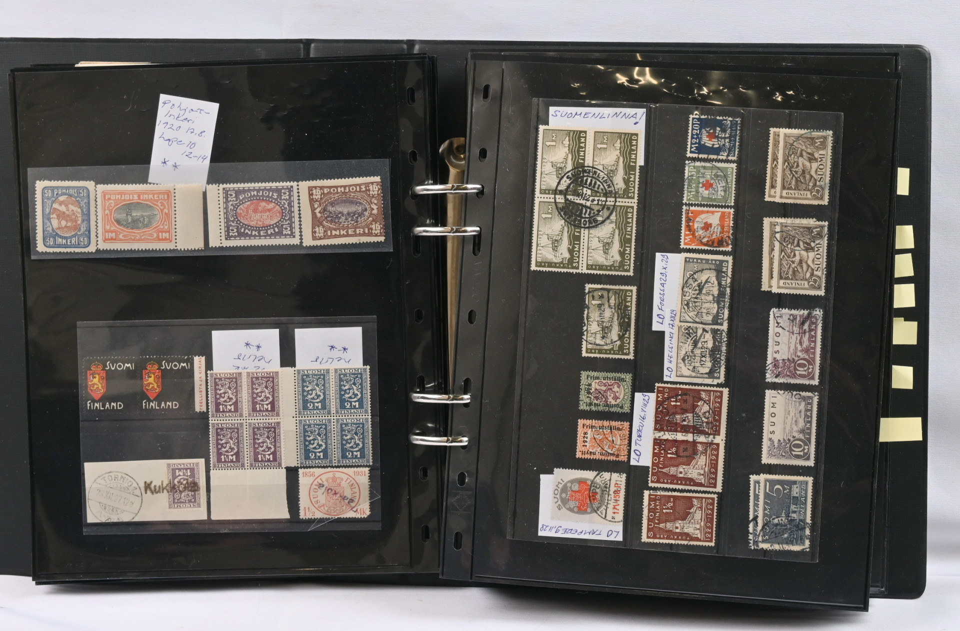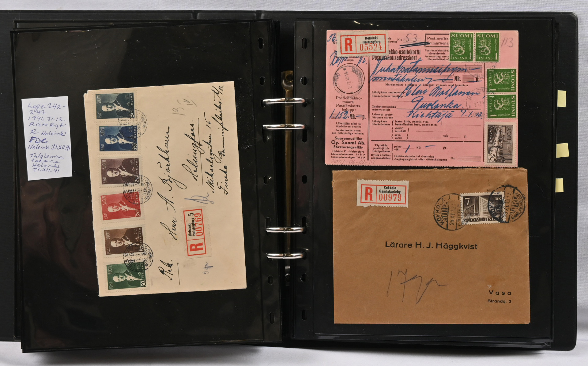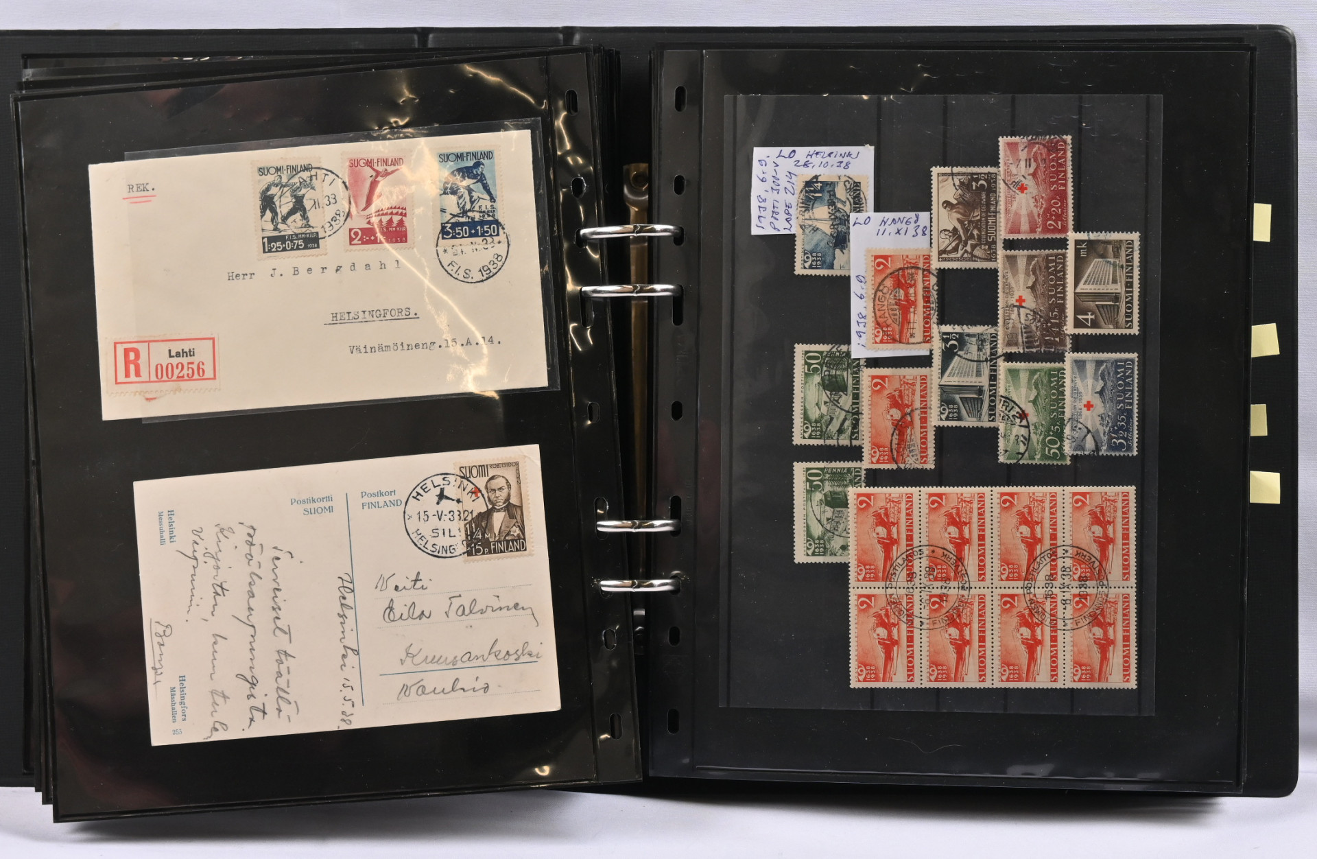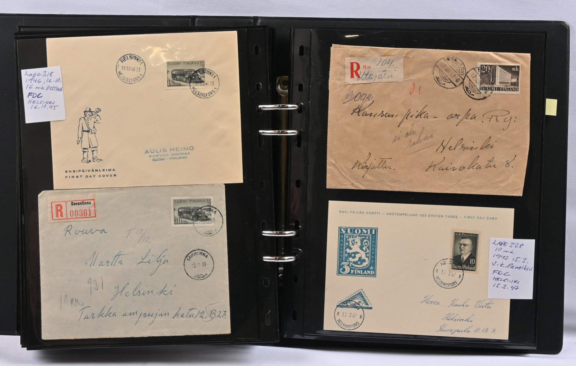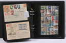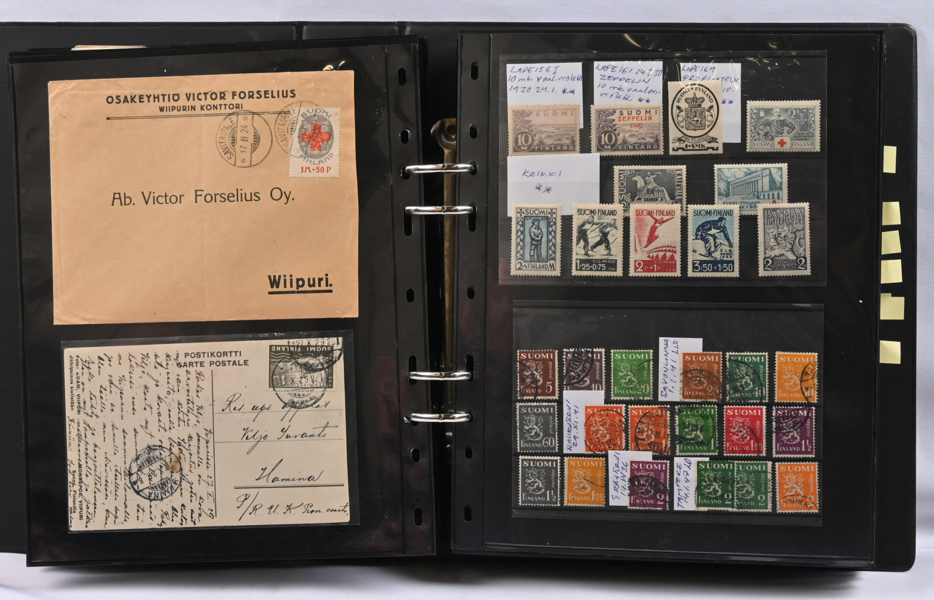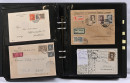 1917 - 1959 sekalainen kokoelmaerä sivuilla kansiossa, merkkejä, FDC-kuoria, lähetyksiä mm. ulkomaille, hienoja leimoja, 1931 Pro Filatelia kortilla, Zeppelin