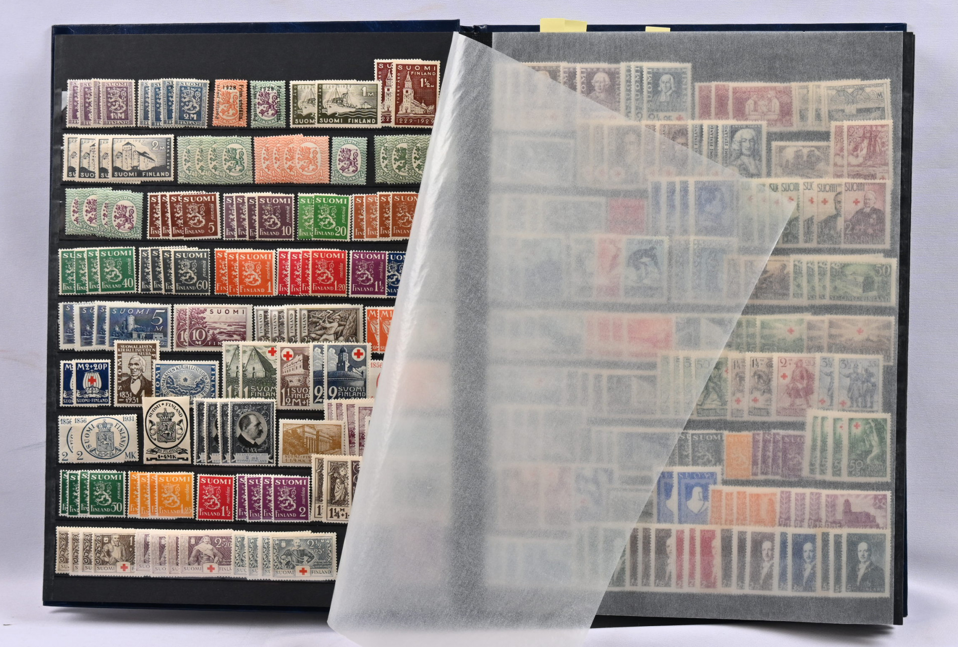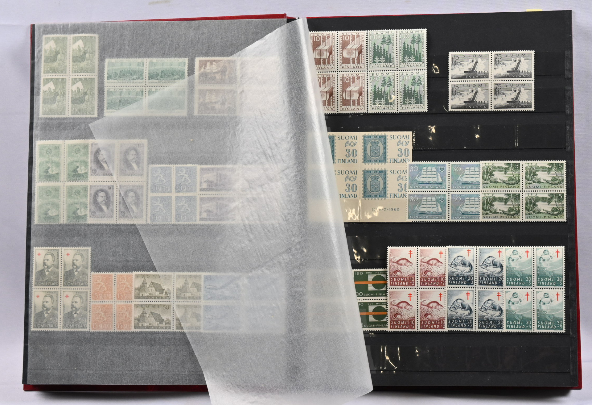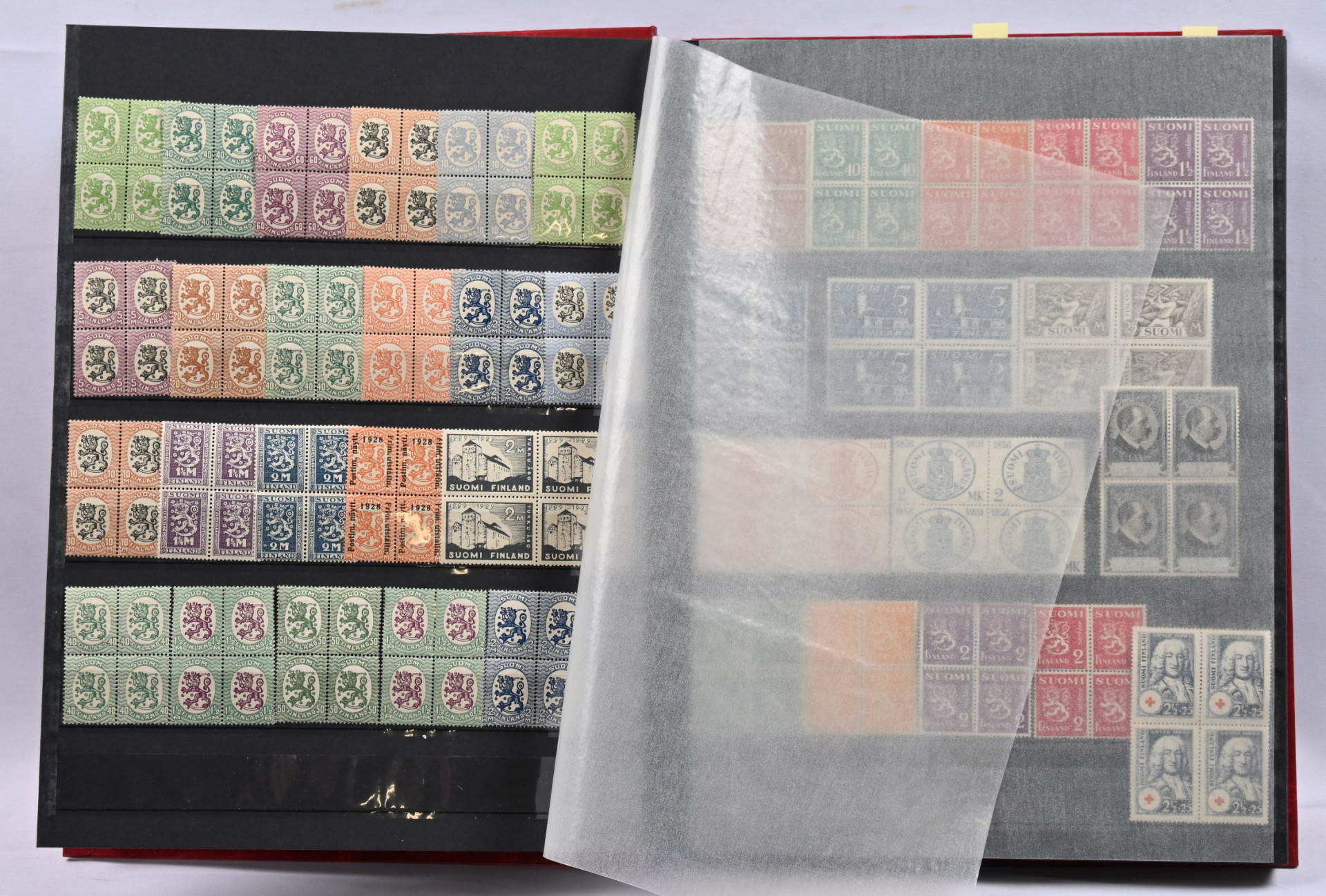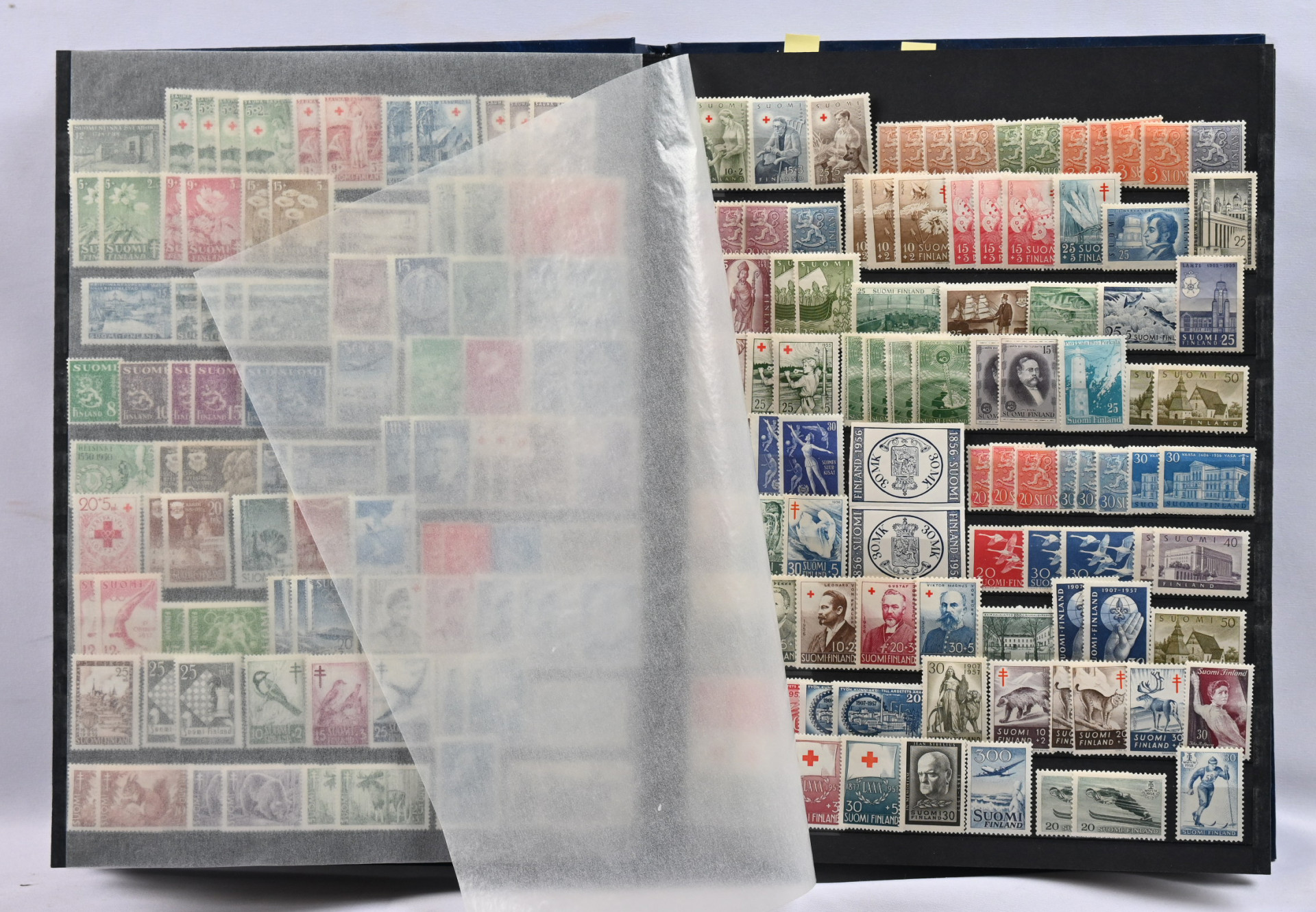 Kolmessa säiliökirjassa hyvä varastoerä: 1917 - 2001 noin 2300 merkkiä, 1917 - 2001 nelilöitä noin 360 kpl ja 1917 - 1999 ryhmiä, vihkoja ja pienoisarkkeja yli 140 kpl