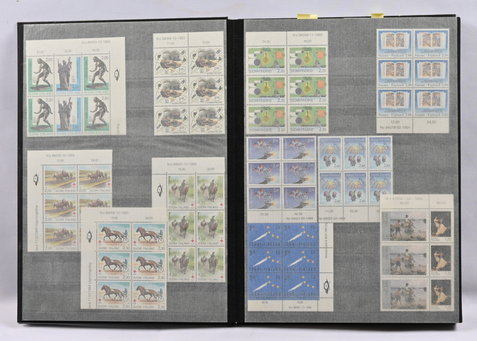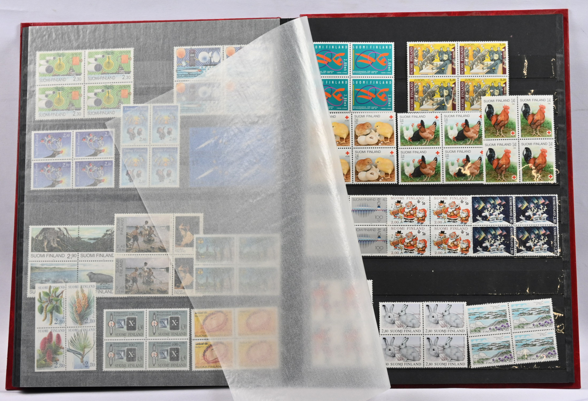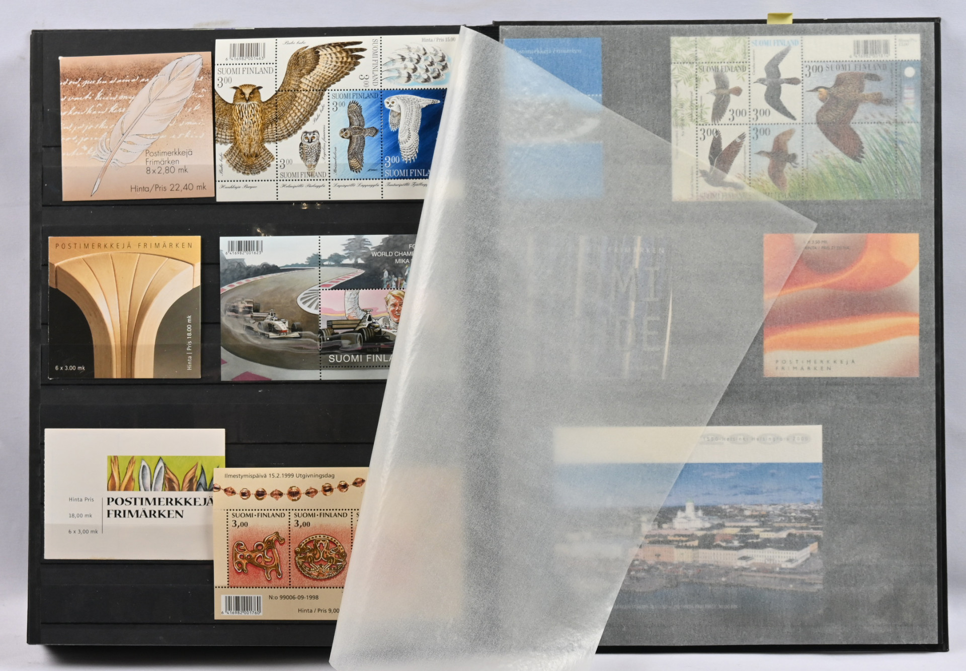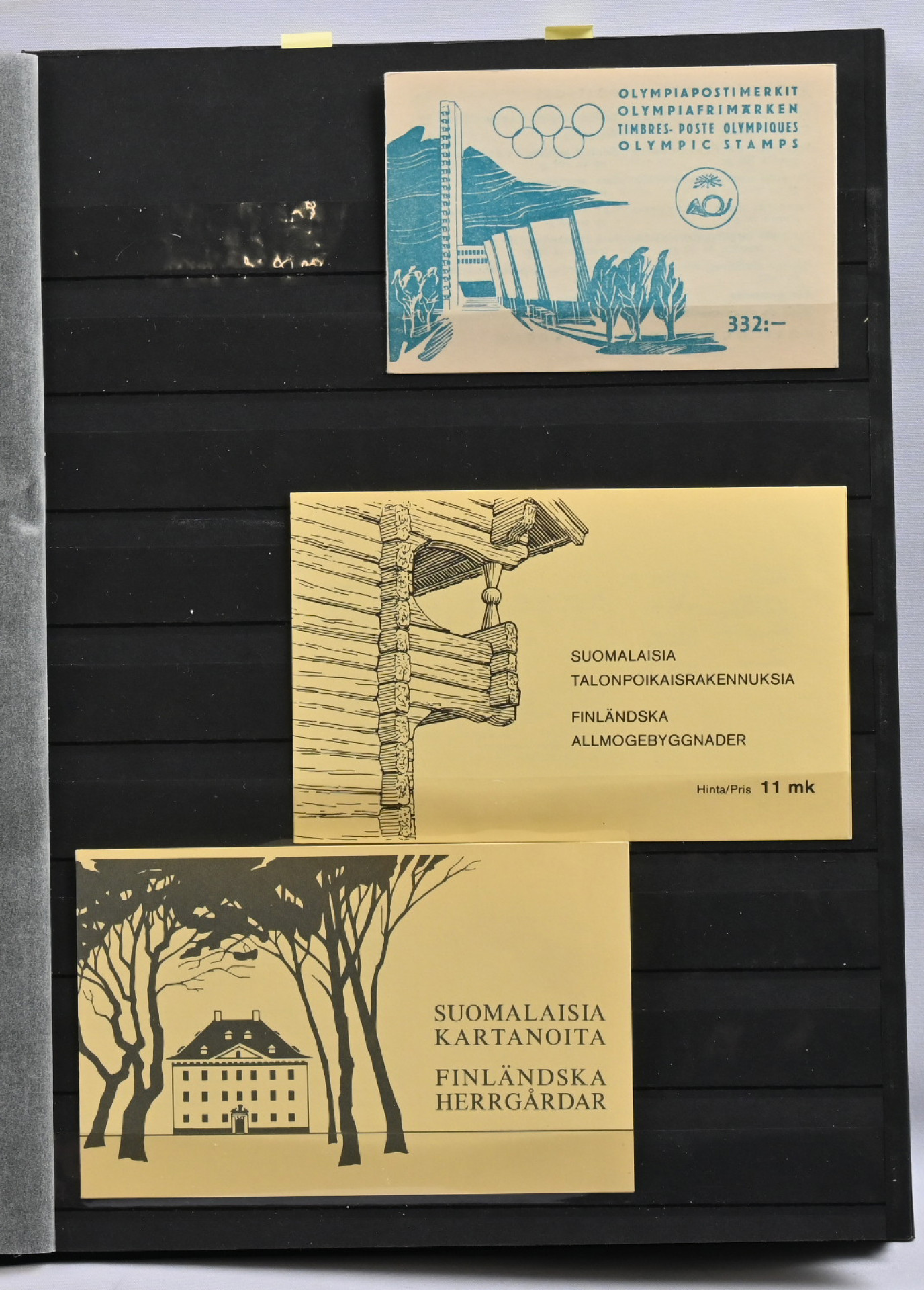 Kolmessa säiliökirjassa hyvä varastoerä: 1917 - 2001 noin 2300 merkkiä, 1917 - 2001 nelilöitä noin 360 kpl ja 1917 - 1999 ryhmiä, vihkoja ja pienoisarkkeja yli 140 kpl