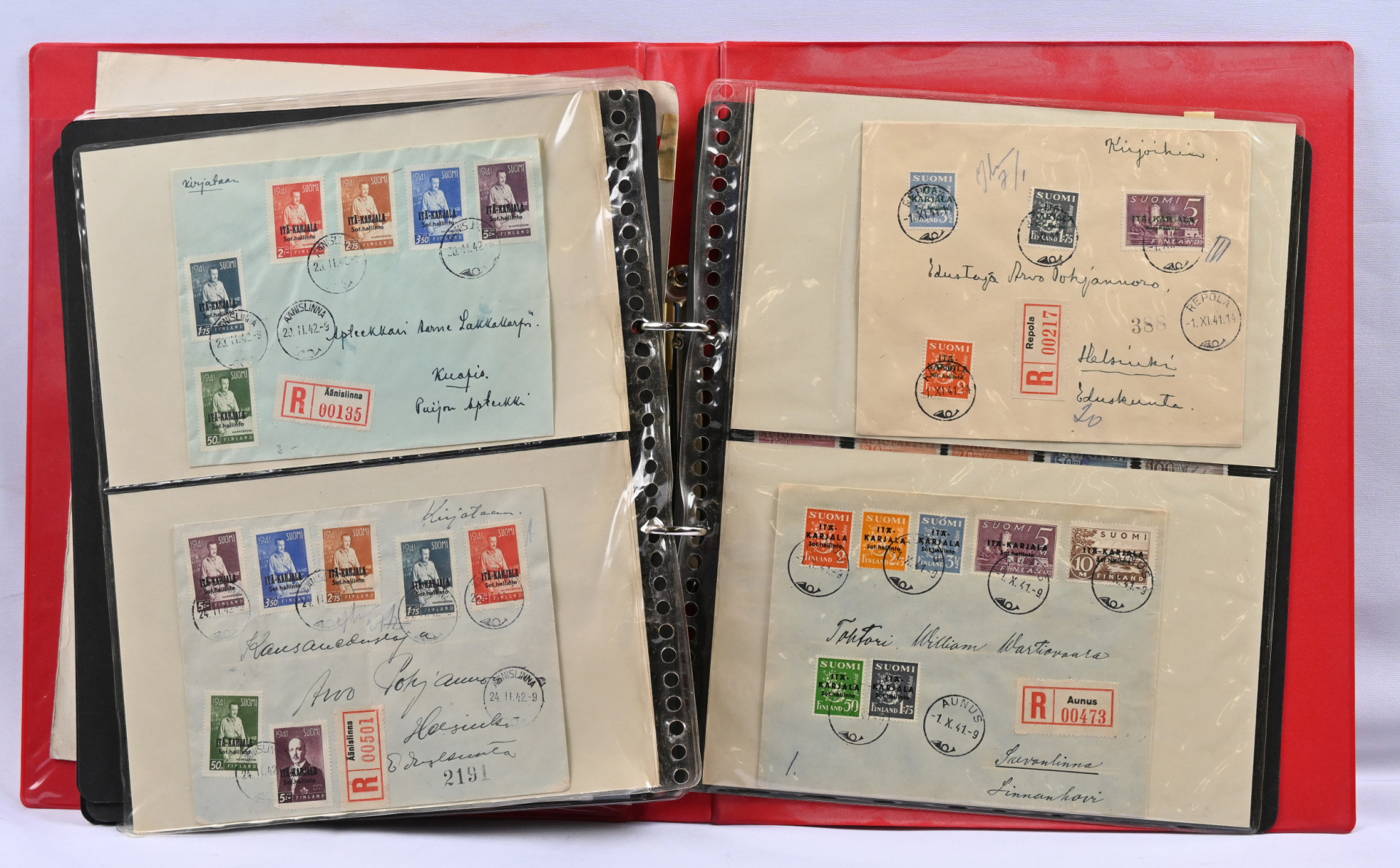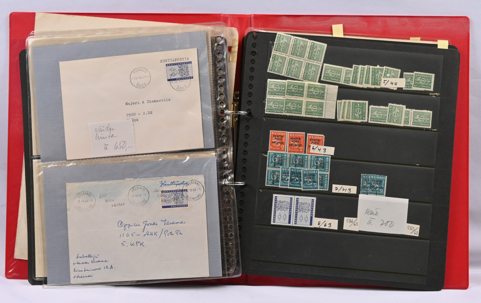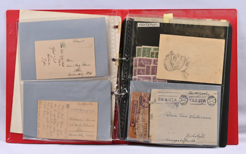 Reuna-alueita erä sivuilla kansiossa mm. Kenttäpostilähetyksiä 1963 kenttäpostimerkkiä kaksi kirjettä ja kaksi postituoretta ** merkkiä, Itä-Karjalaa myös lähetyksiä ym