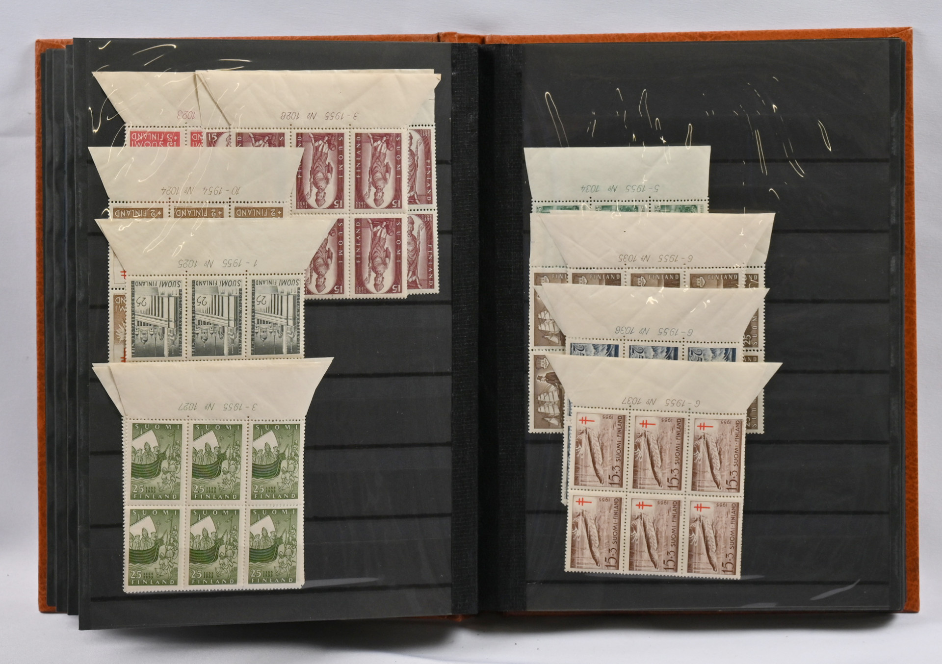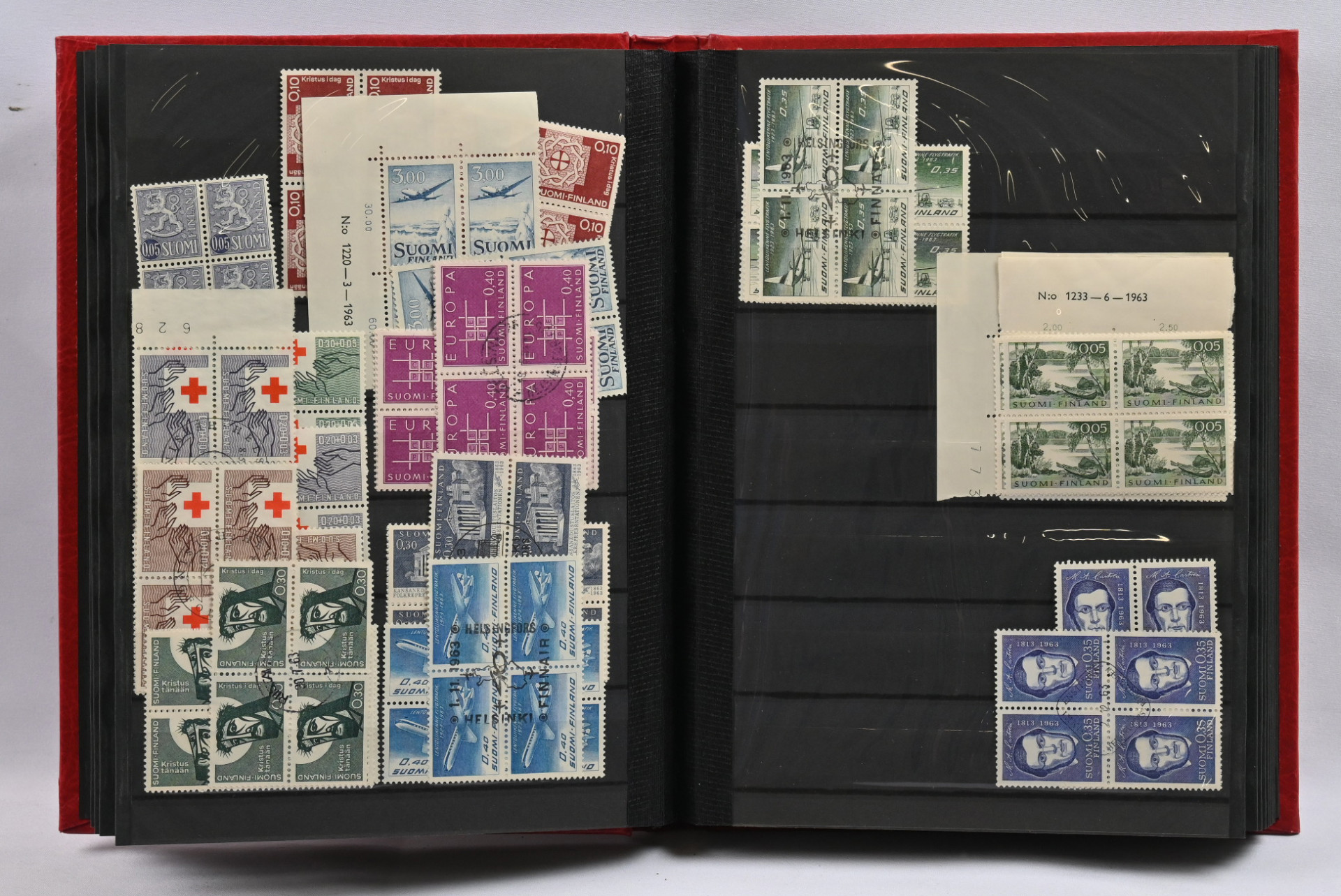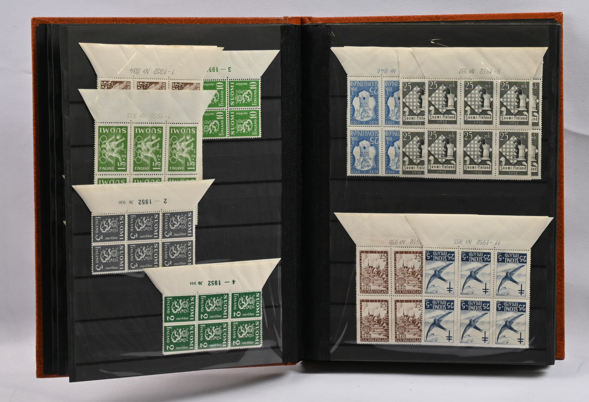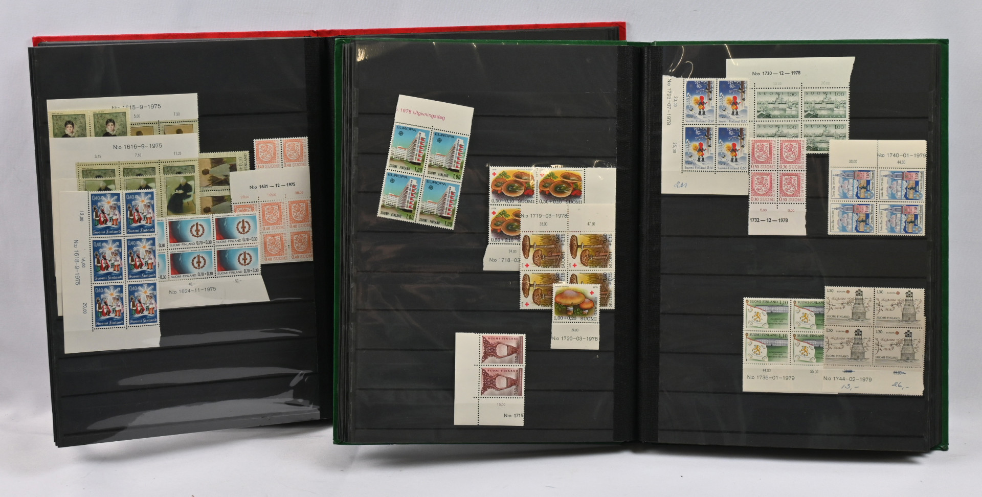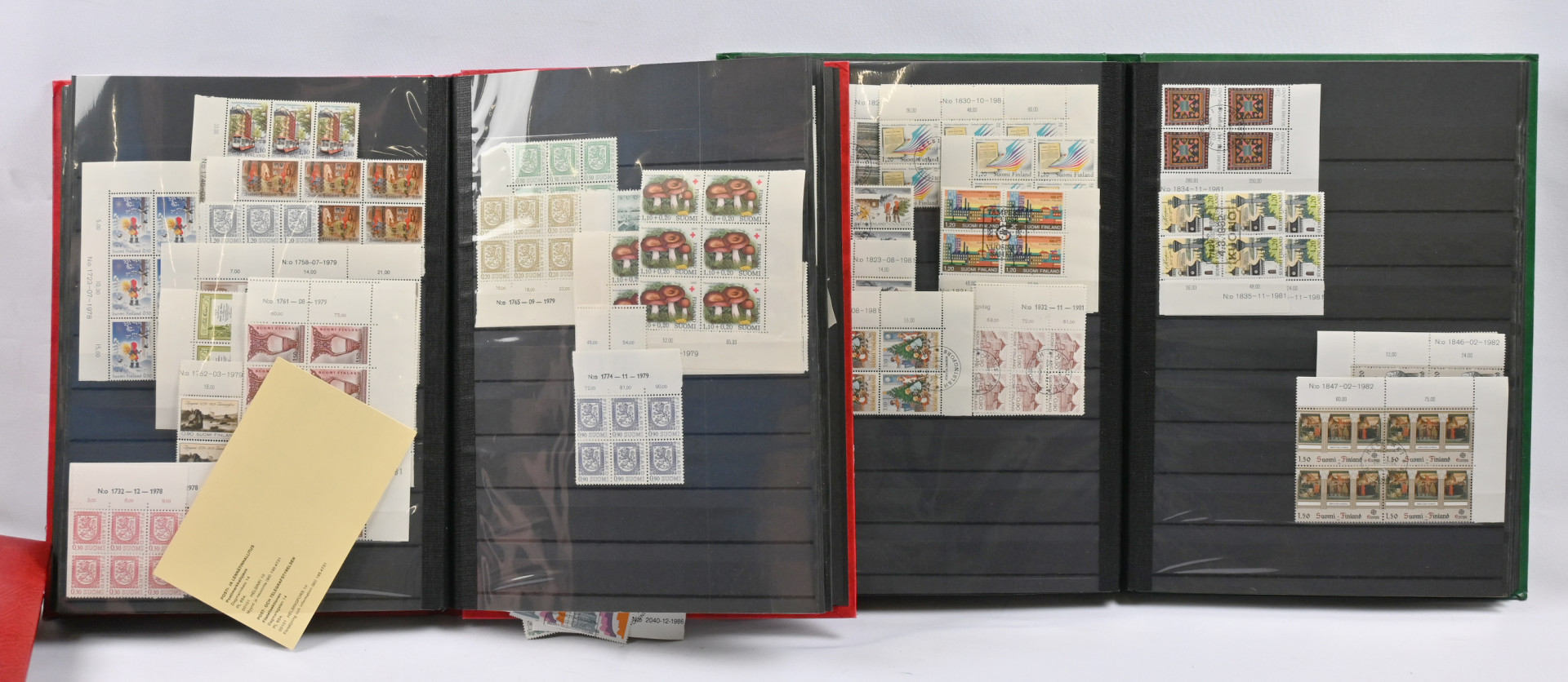 1950 - 1983 erä postituoreita ** numerokuusiloita sekä postituoreita ** ja leimattuja nelilöitä neljässä säiliökirjassa. Lisäksi kahdessa arkkikansiossa runsas erä postituoretta ** materiaalia 1901 alkaen. Joitakin kokoarkkeja, paljon arkinosia, myös keskihintaisia merkkejä