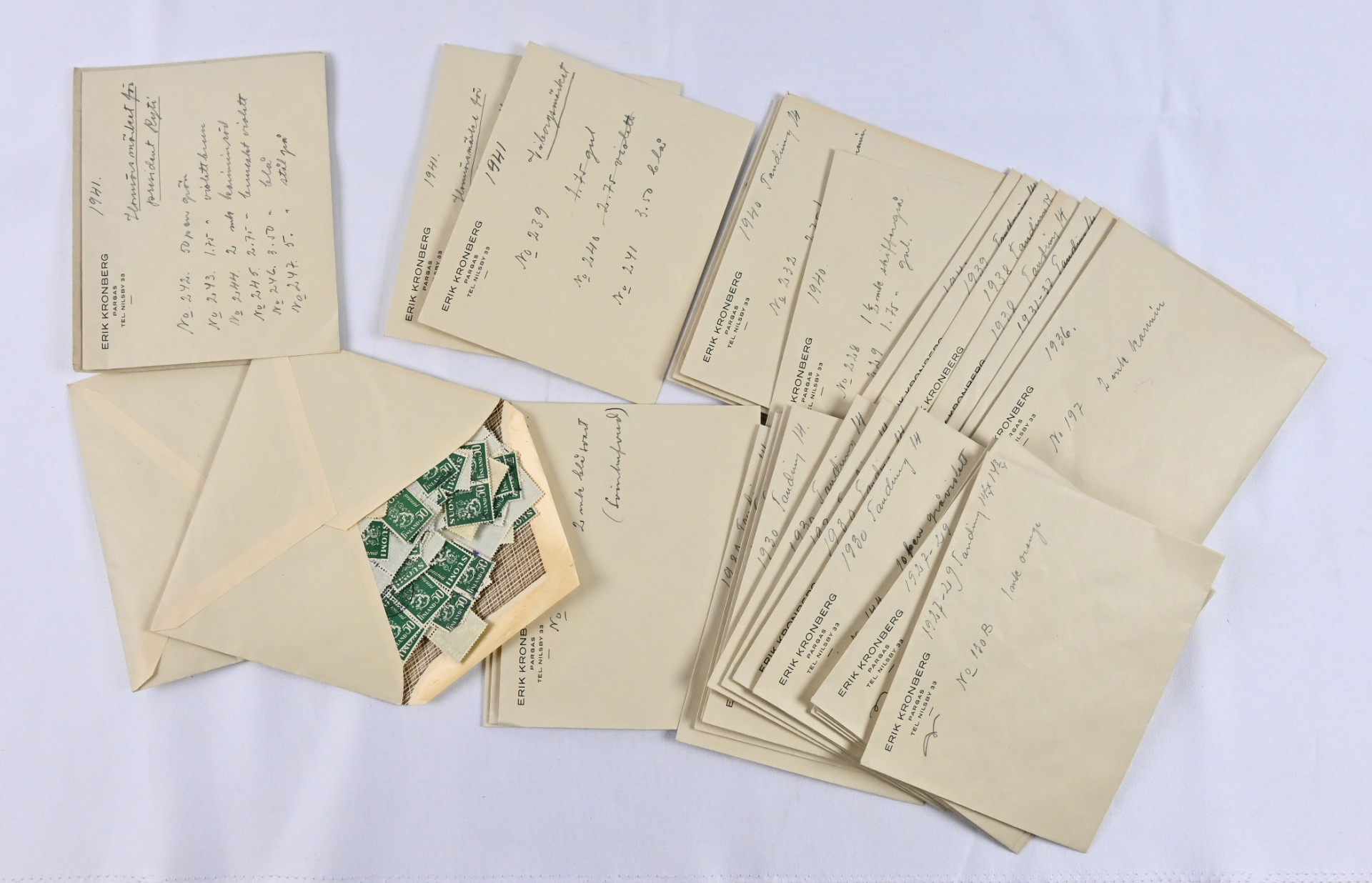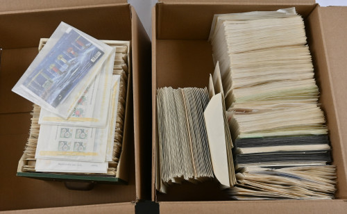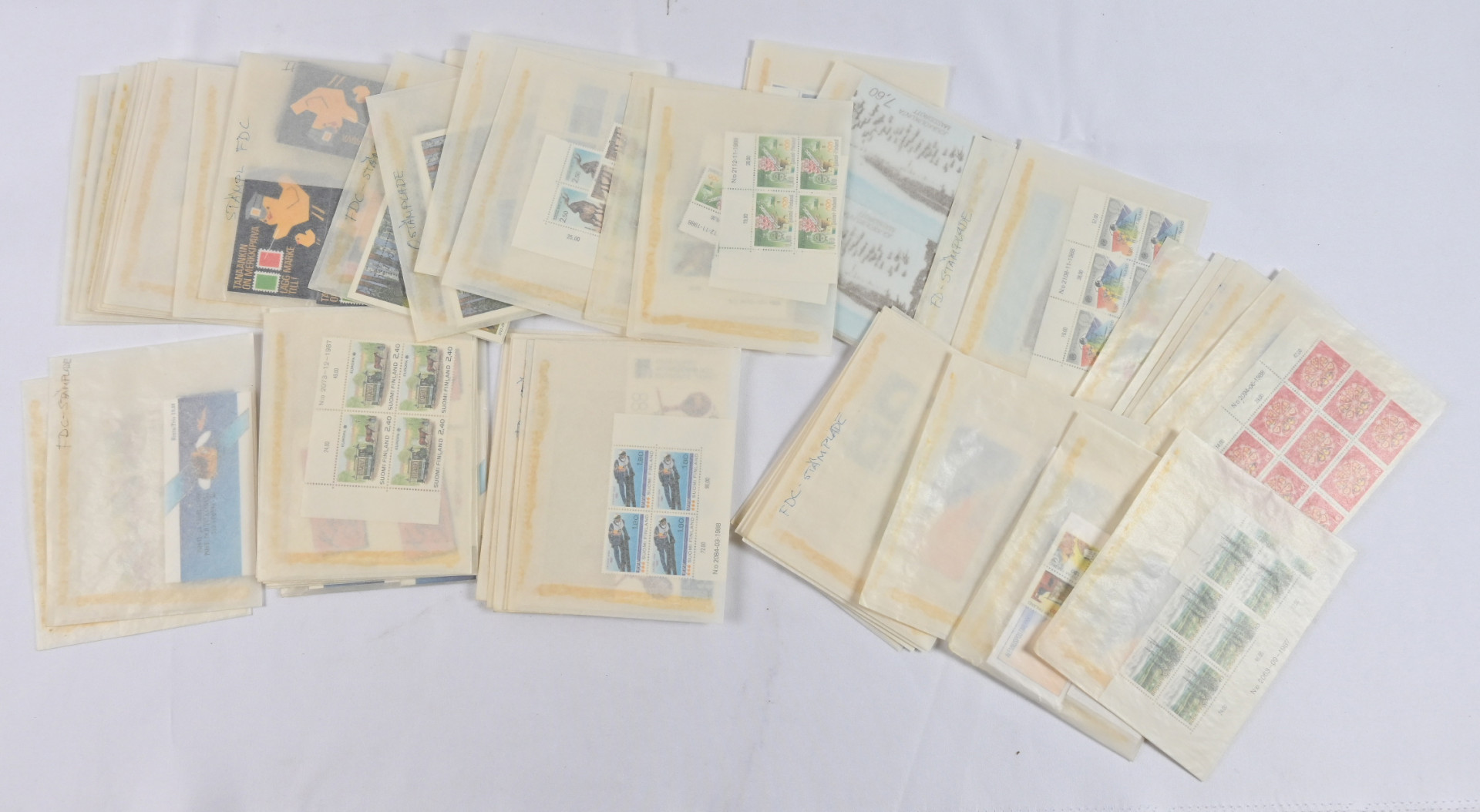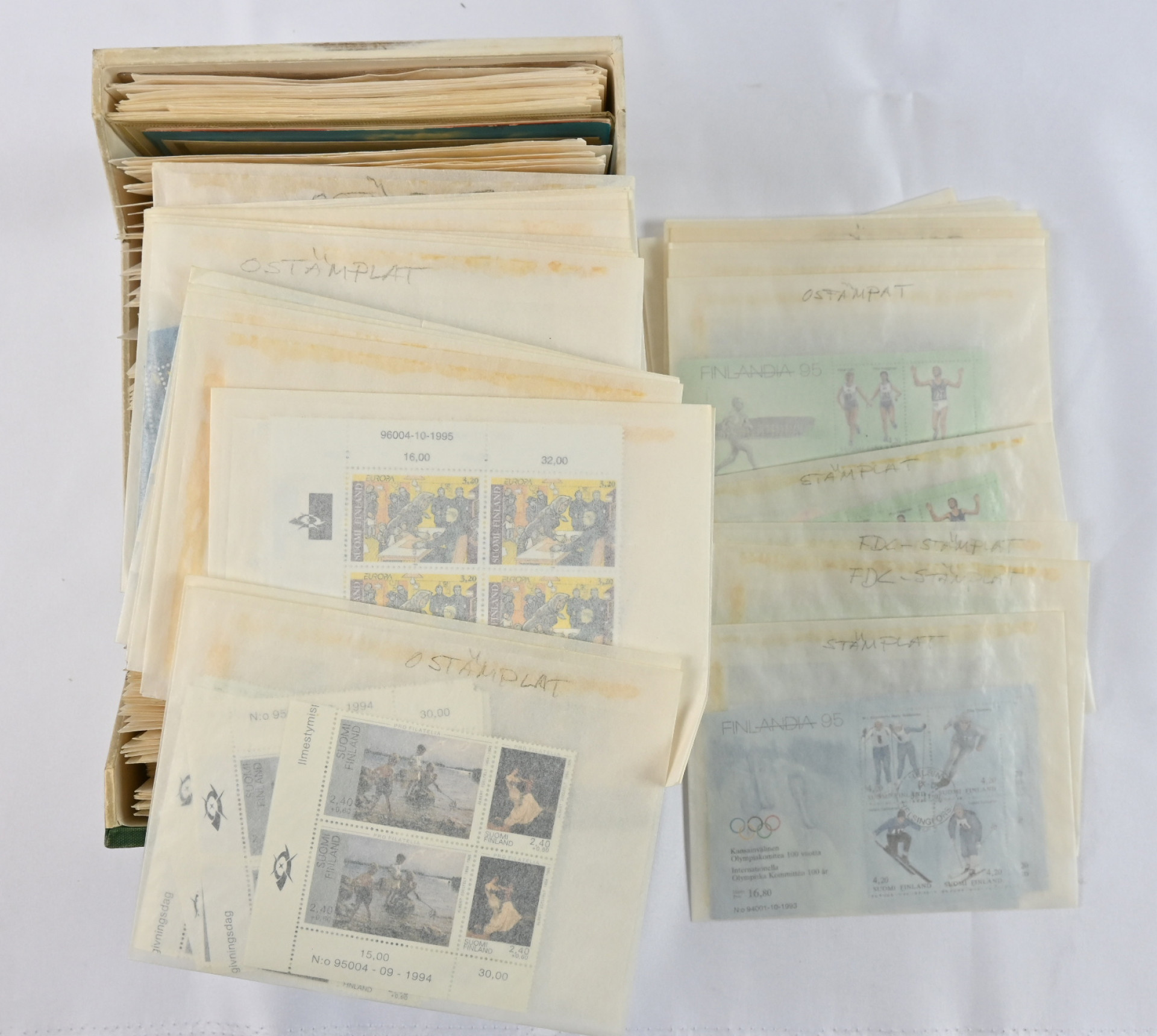 Varastoerä leimattua ja postituoretta ** materiaalia lähinnä 1970-luvulta 2000-luvun alkuun pergamiinipusseissa. Valtava määrä merkkejä, vihkoja, pienoisarkkeja, myös automaattivihkoja. Mukana runsaasti nimellisarvomateriaalia, myös leimattua massaa pieni määrä alkaen 1800-luvulta, Ahvenanmaata sekä myös hiukan sekalaista ulkomaiden materiaalia