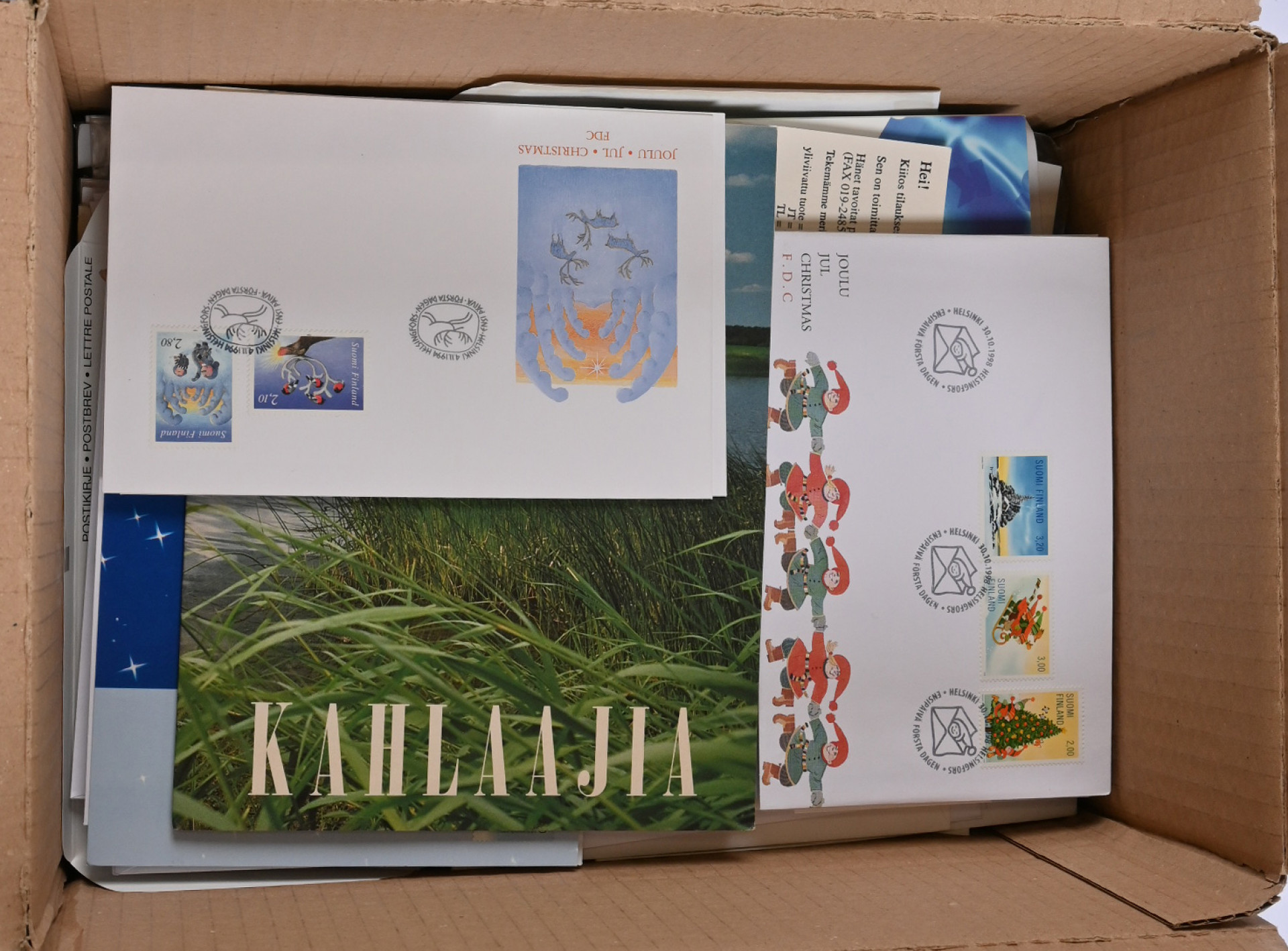1990-luvun materiaalia noin 3 KG laatikossa. Paljon kokoarkkeja, vihkoja, pienoisarkkeja jne, FDC-kuoria ym. tutkittavaa