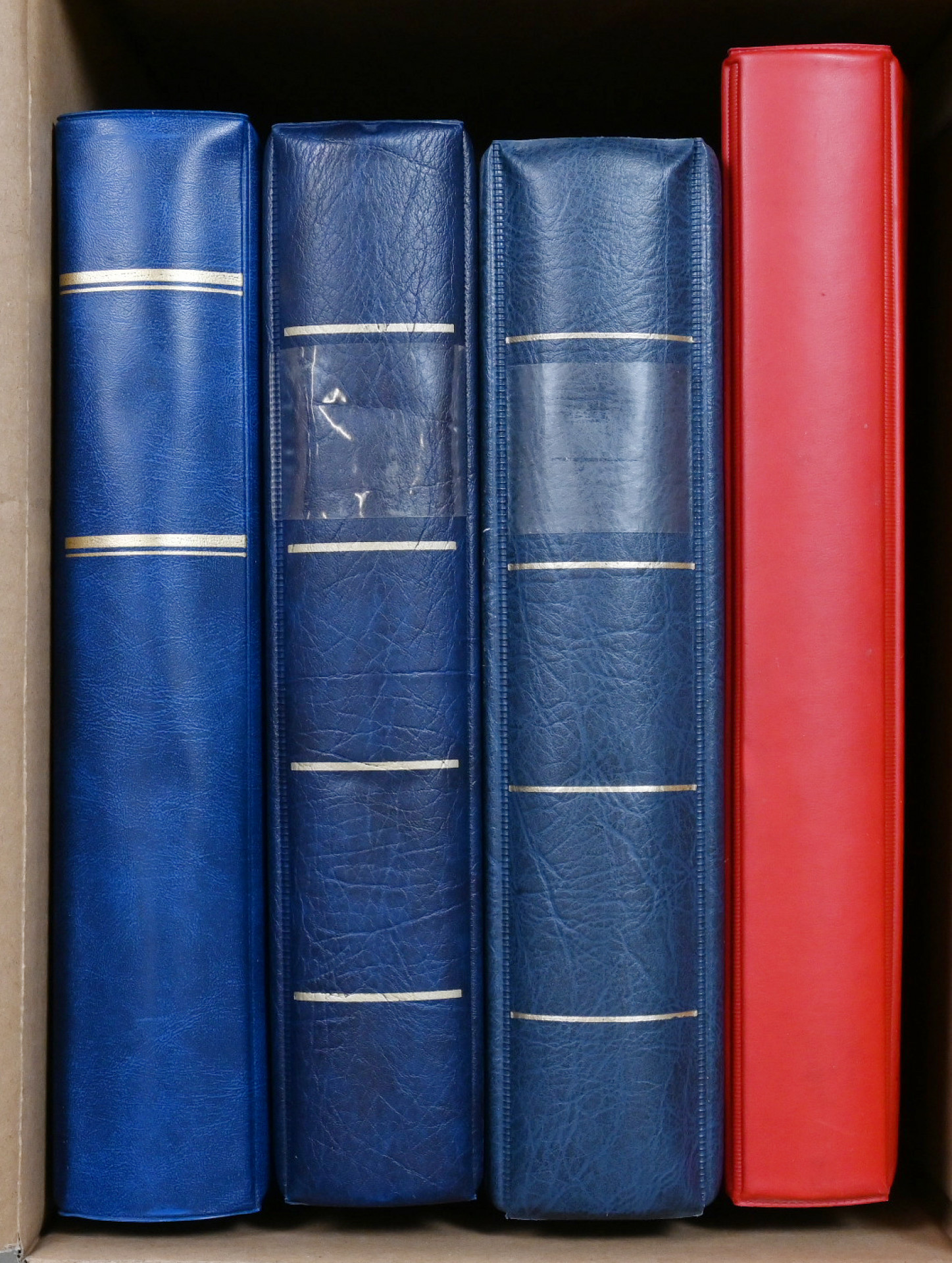 Kolme hyvää kansiota tyhjillä, hyväkuntoisilla säilytyslehdillä, erilaisia liuskajakoja. Lisäksi tyhjä kuorikansio.