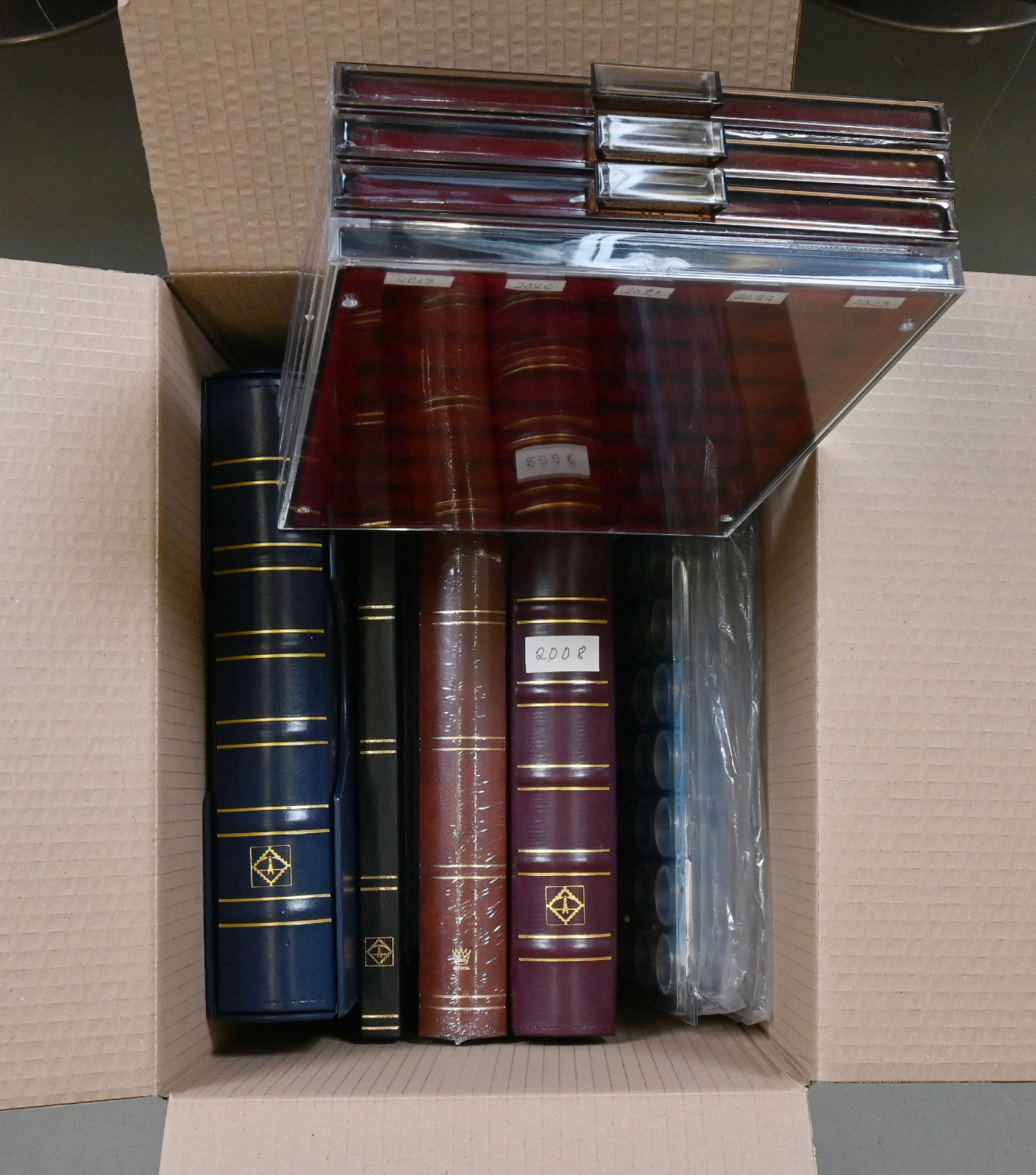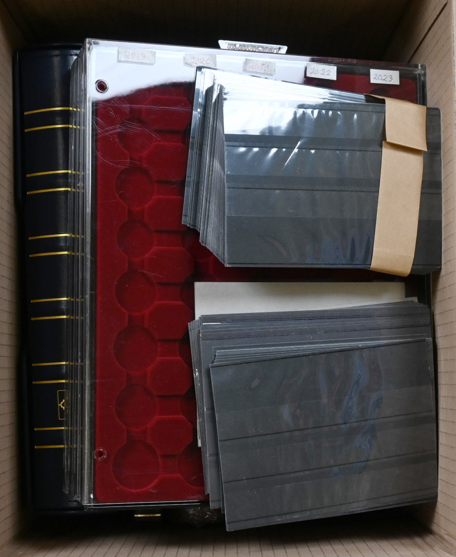 Postimerkki- ja rahatarvikkeita 9 KG laatikossa, mm. kansioita, sivuja, säiliökirjoja, rahaaatikkoja jne.