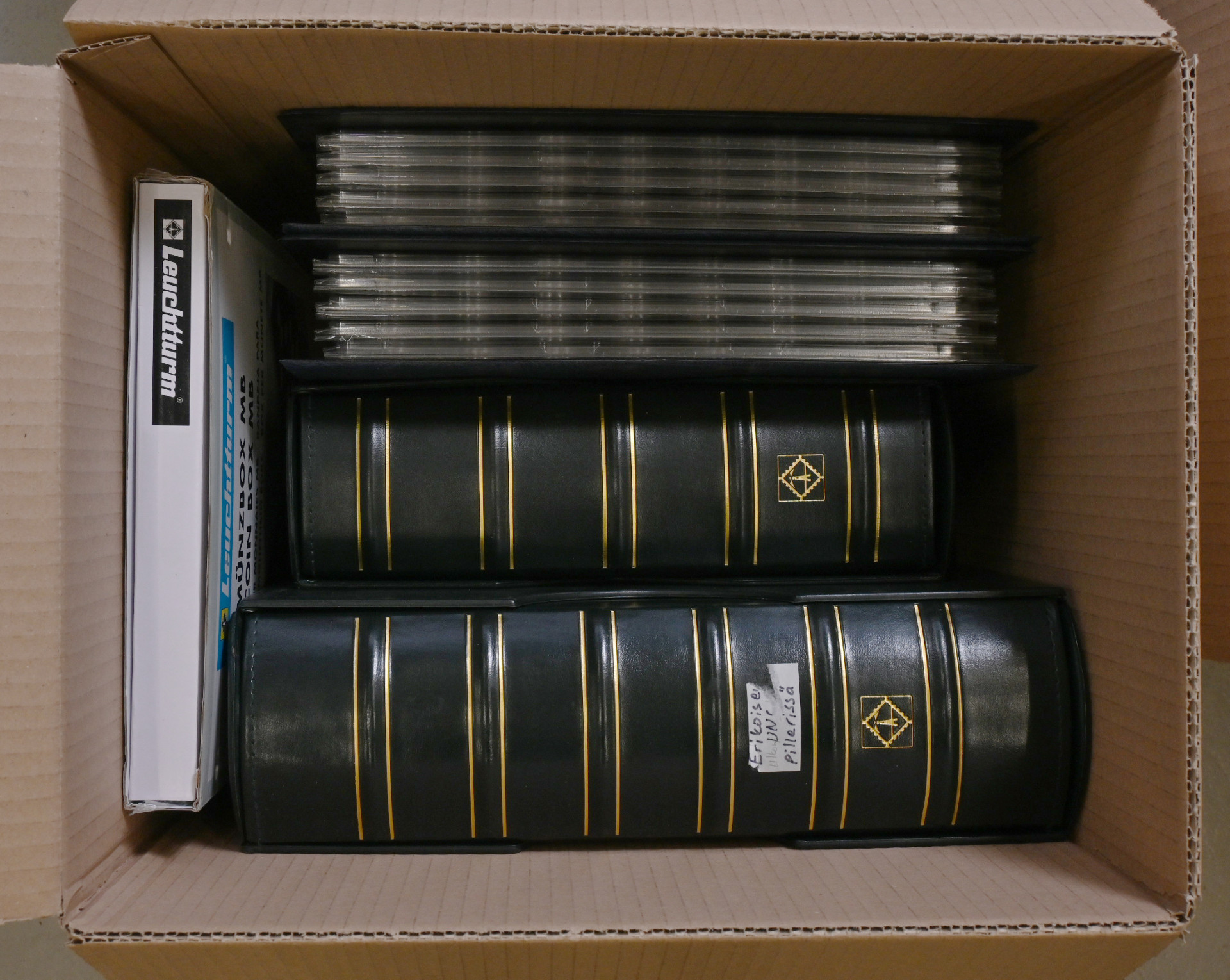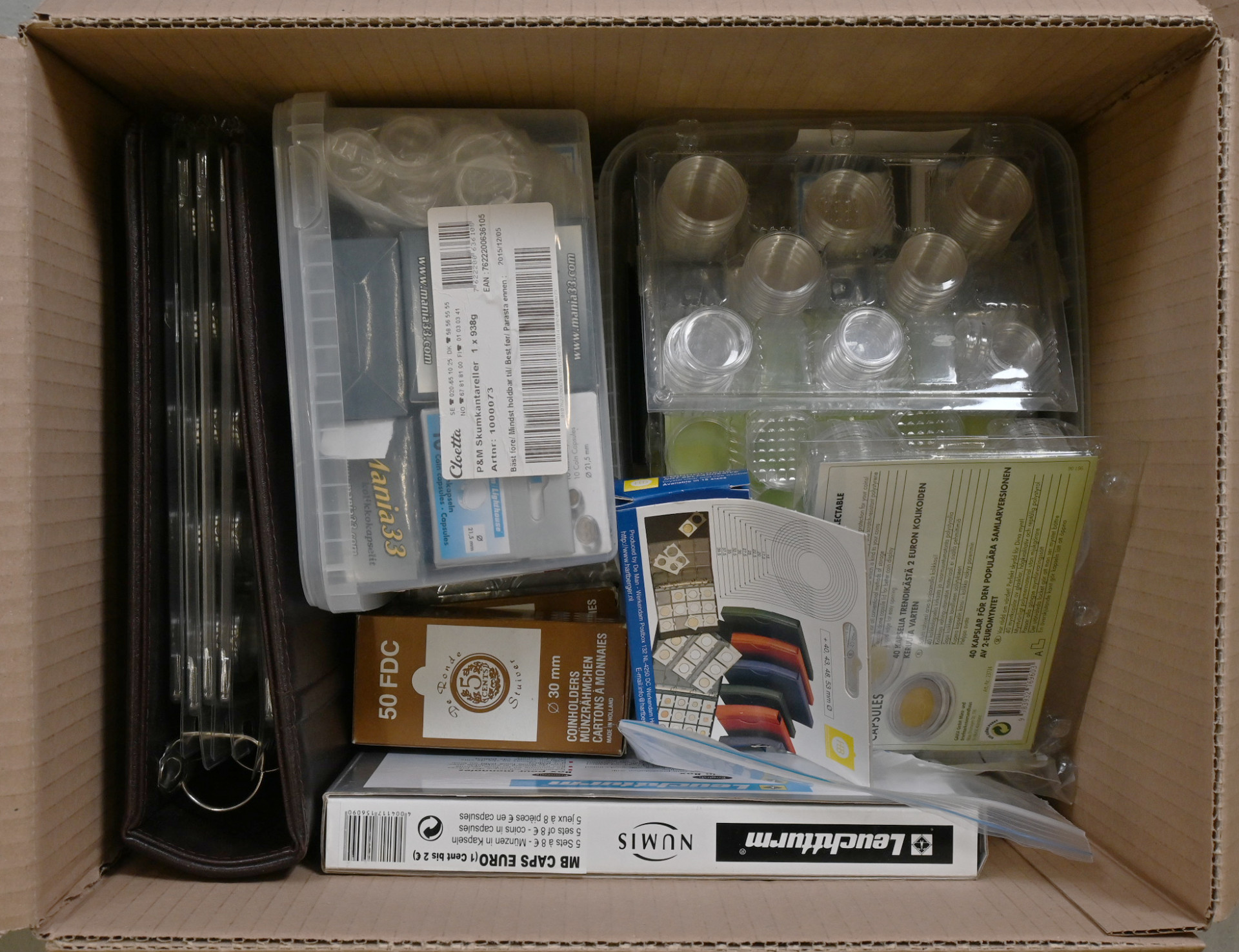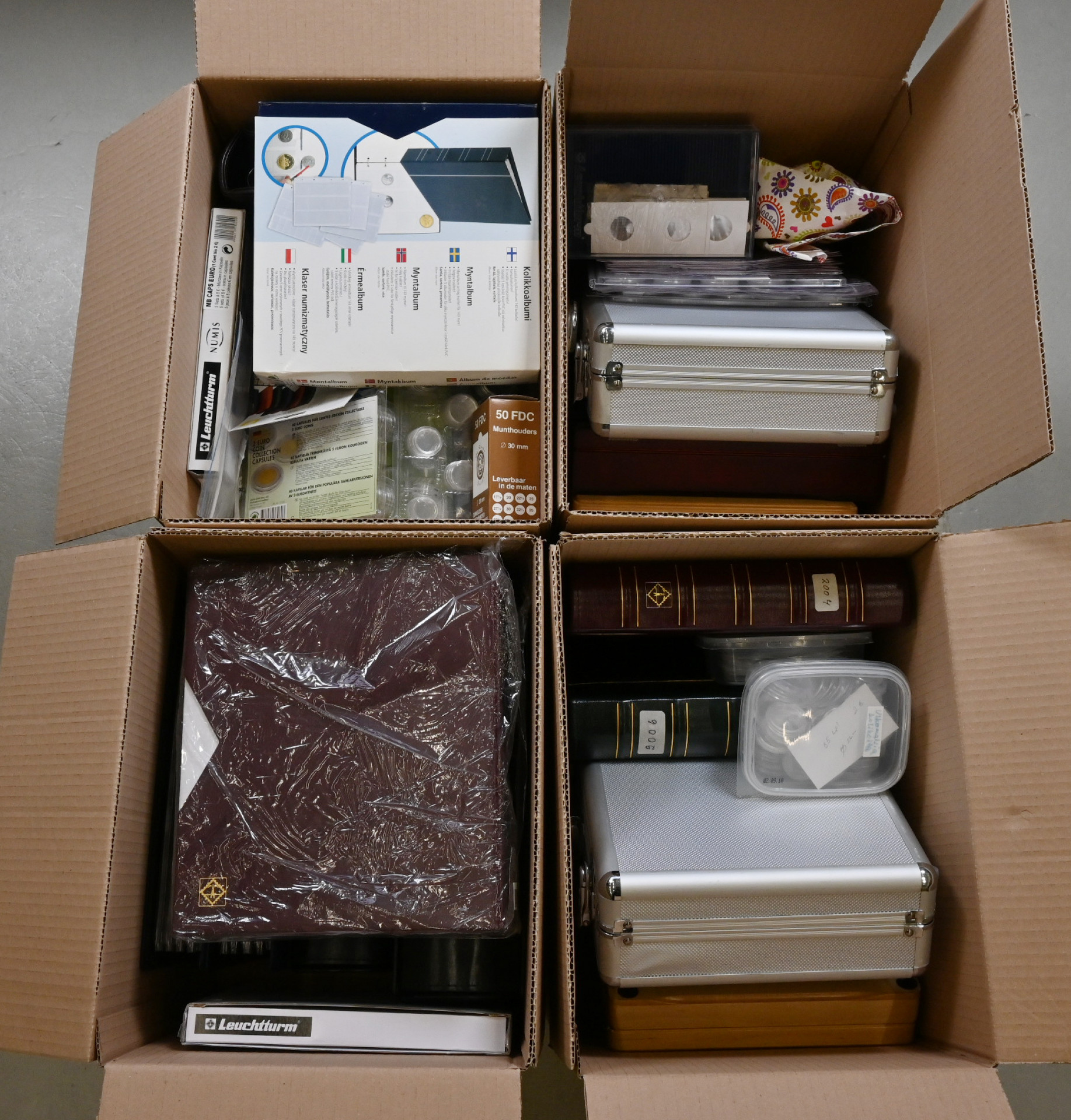 Rahatarvikkeita ISO erä neljässä laatikossa, yhteensä n. 25 KG, mm. kansioita, sivuja, kapseleita kolikkosalkkuja, rahalaatikoita ym. ym. Monet täysin käyttämättömiä