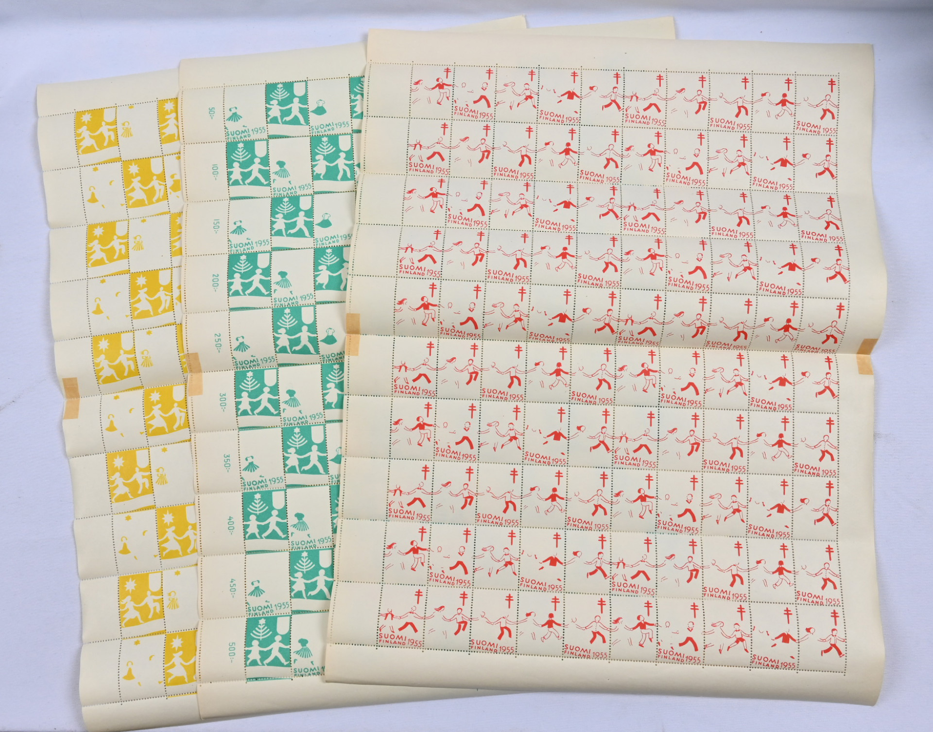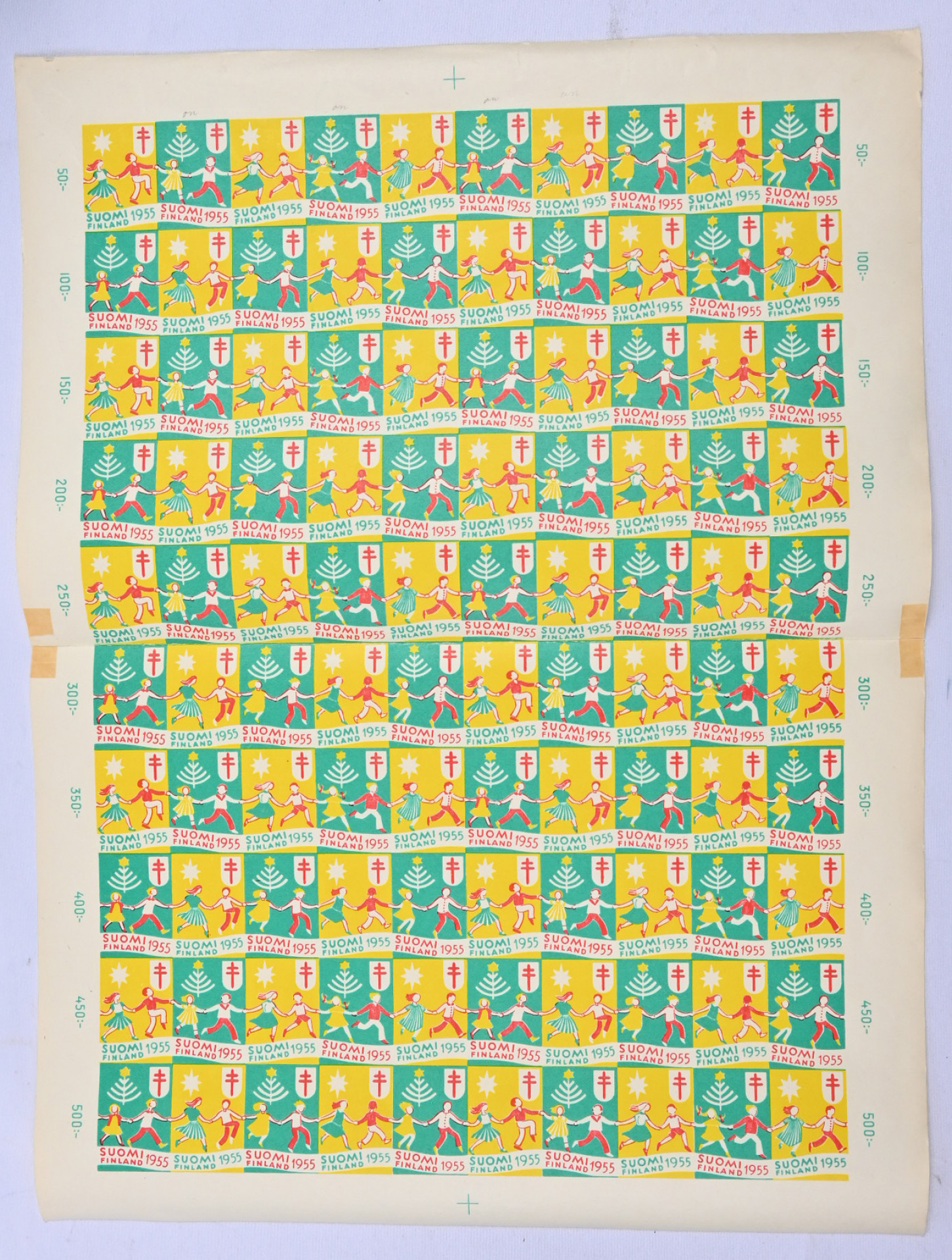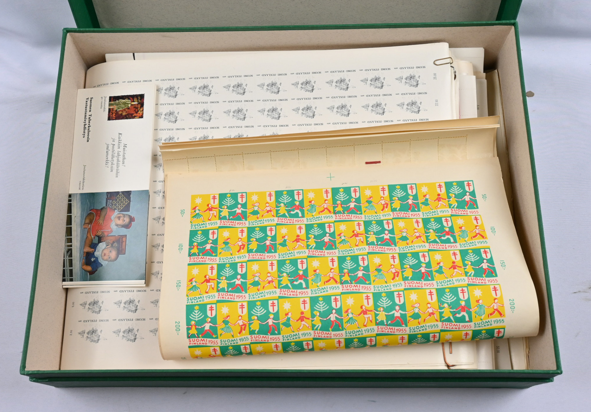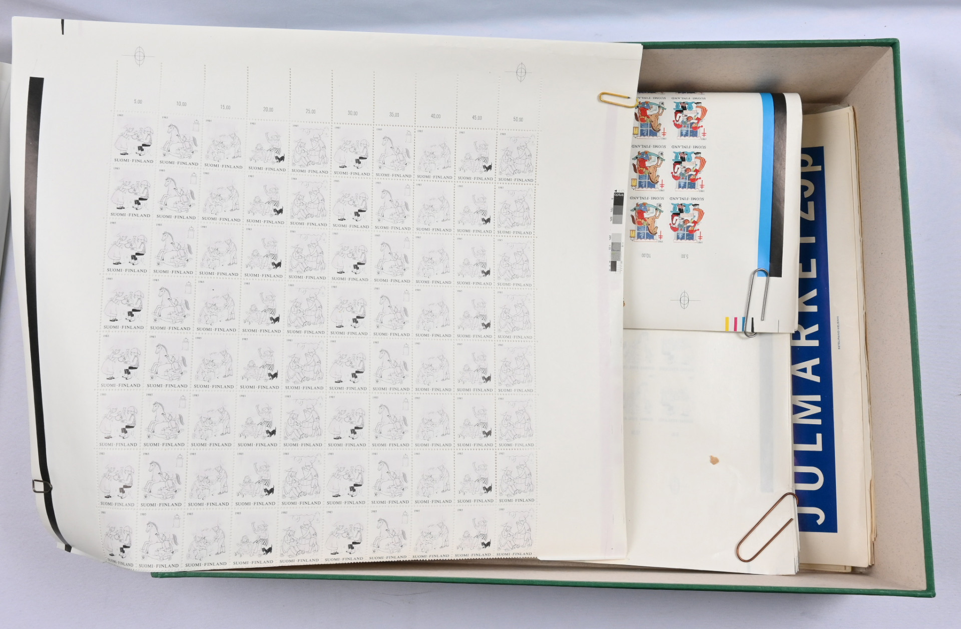 Joulumerkkien skaalavedosarkkeja iso erä laatikossa. Mm. 1955 vedoksia sekä harvinainen lopullinen kokoarkki hammastamattomana. Myös merkkien mainosjulisteita ym. Tutustu!