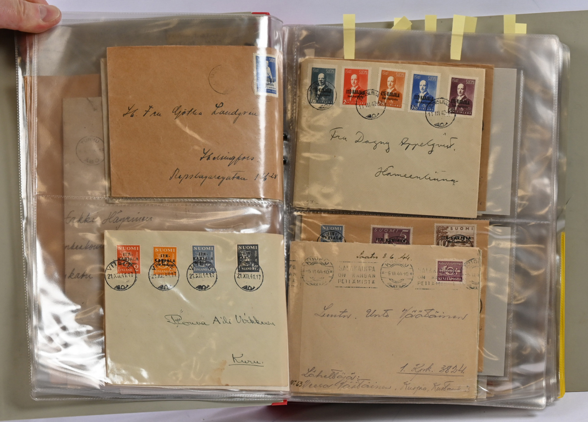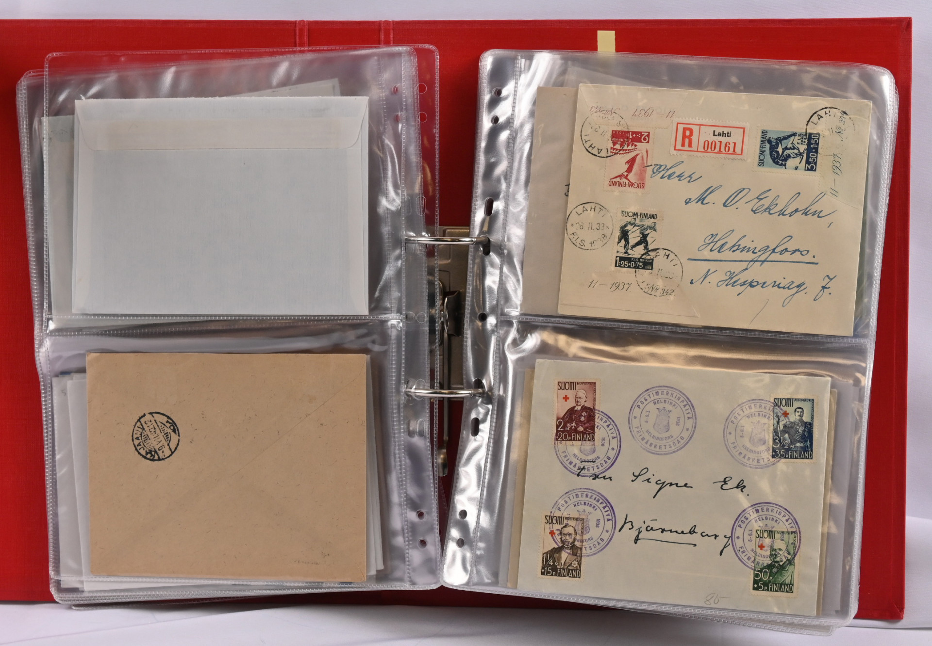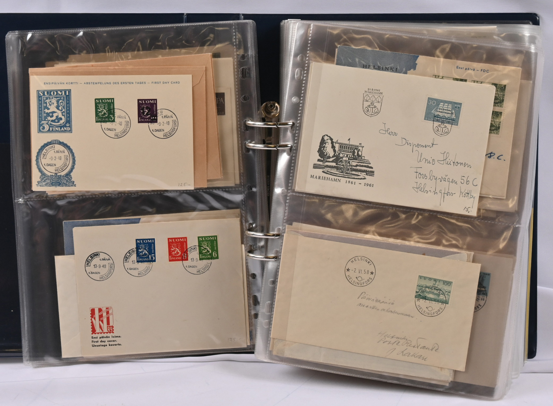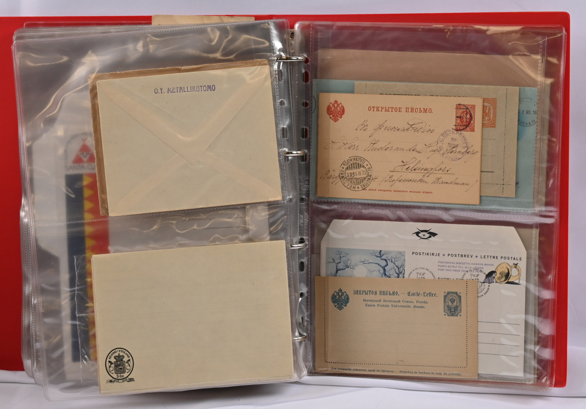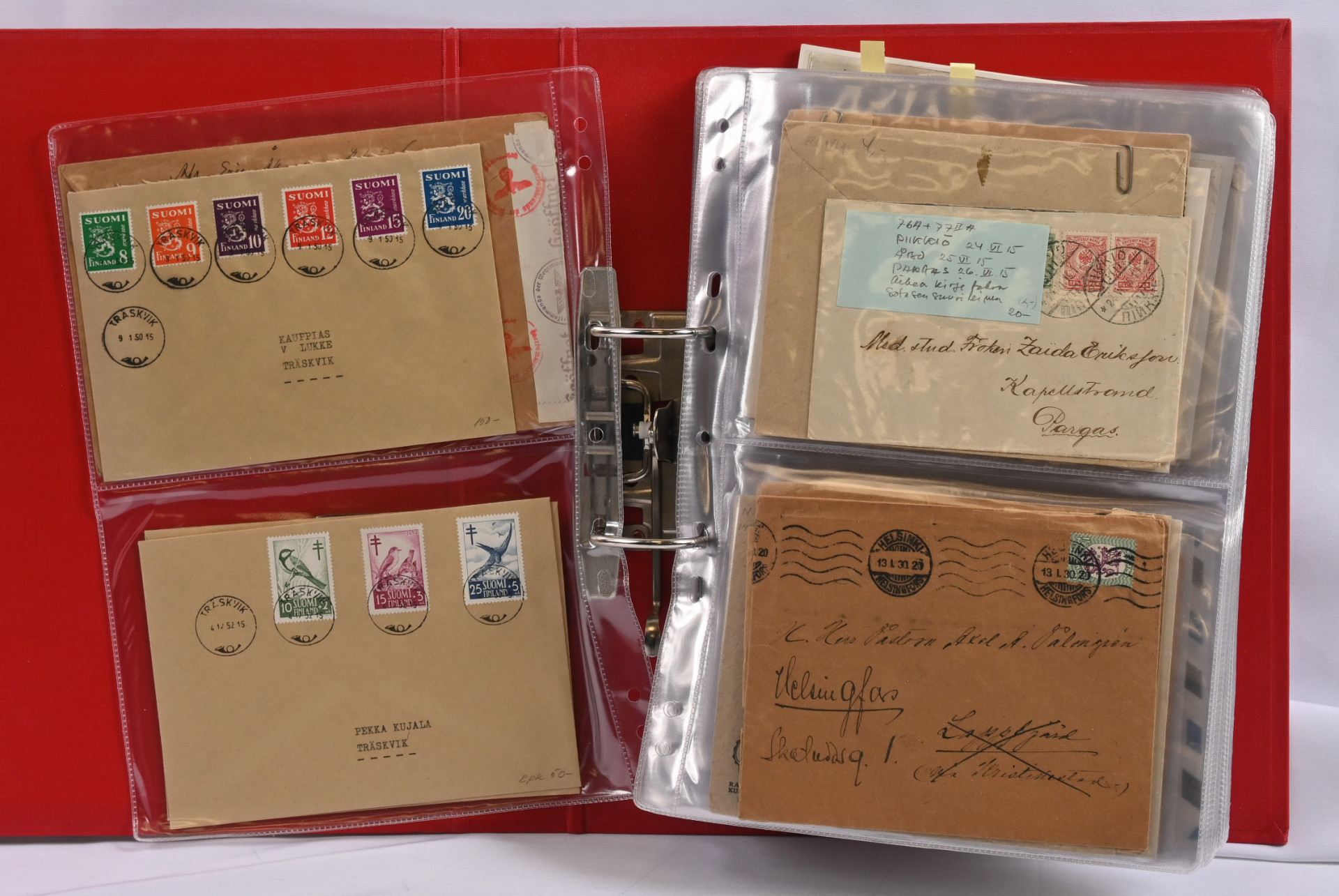 1866 alkaen kiehtova mutta sekalainen erä seitsemässä kansiossa lähetyksiä ja kortteja, myös hiukan ulkomaita. Mukana mm. s/s Suursaari-leimaus, Itä-Karjalaa, pari isohampaiskirjettä jne.